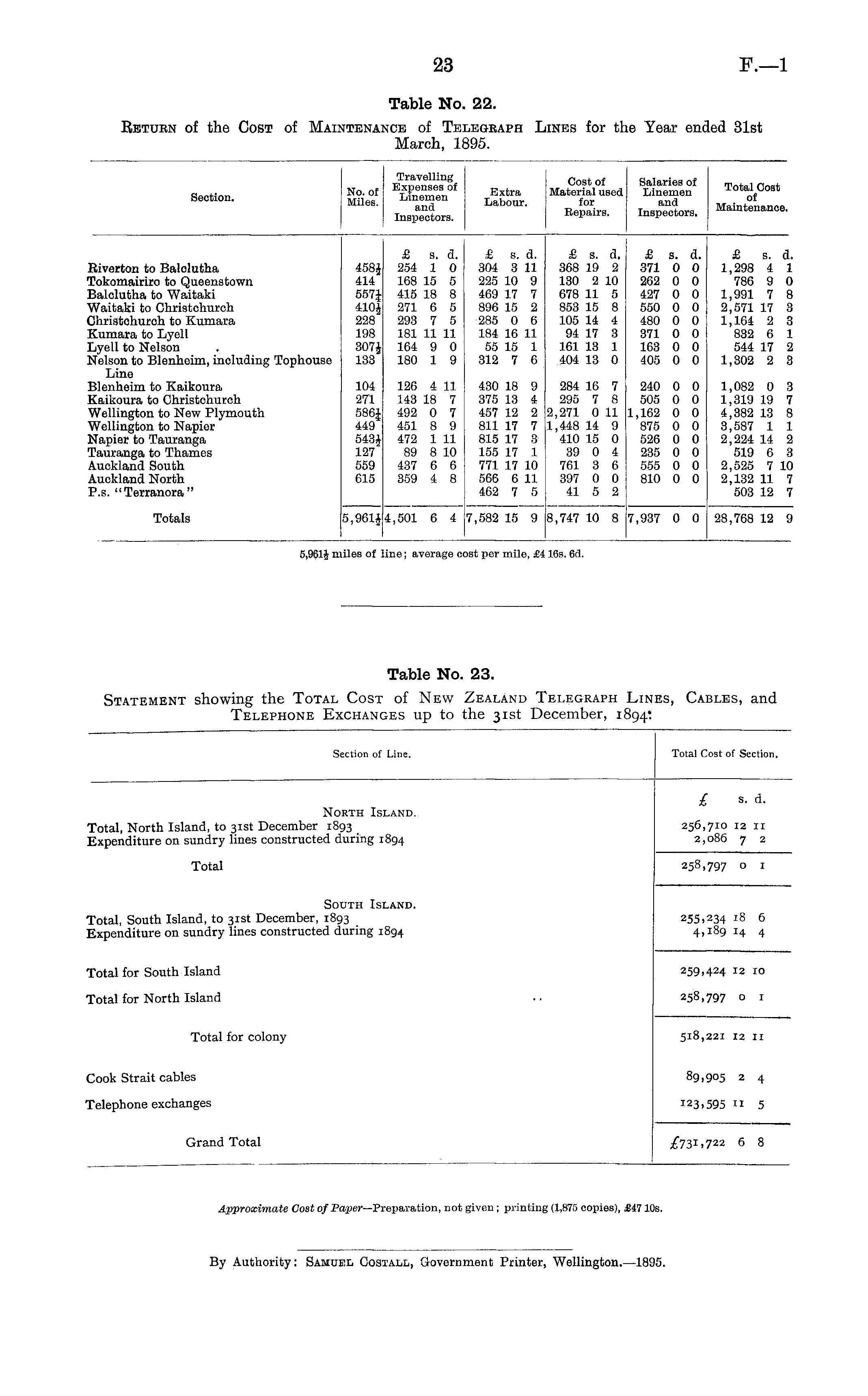 Table No. 23. Statement showing the Total Cost of New Zealand Telegraph Lines, Cables, and Telephone Exchanges up to the 31st December, 1894.