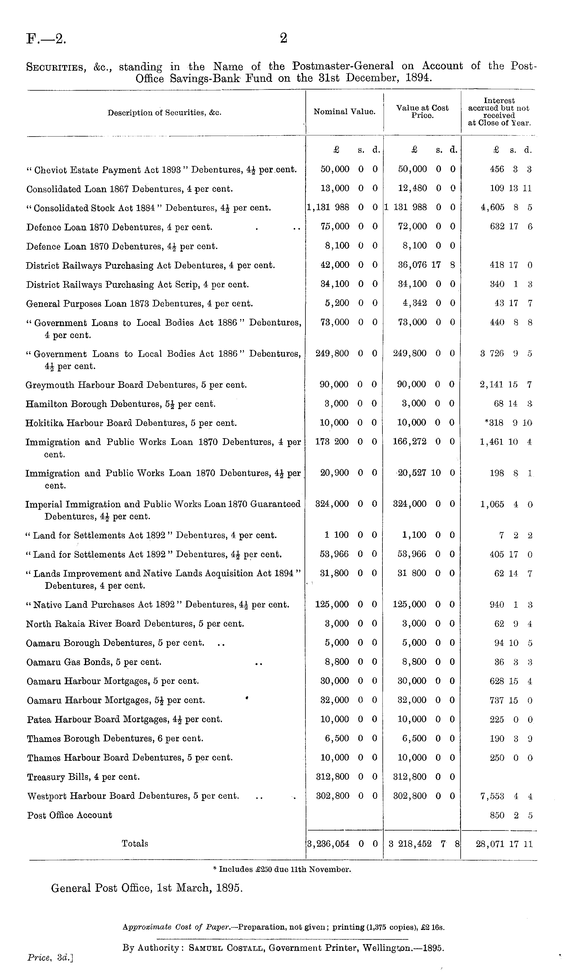 Description of Securities, &c. Nominal Value. Value at Cost Price. Interest accrued but not received at Close of Y ear. £ s. d. £ s. d. £ s. d. " Cheviot Estate Payment Act 1893 " Debentures, 4J per.cent. 50,000 0 0 50,000 0 0 456 3 3 Consolidated Loan 1867 Debentures, 4 per cent. 13,000 0 O 12,480 0 0 109 13 11 " Consolidated Stock Act 1884 " Debentures, 4| per cent. 1,131 988 O 0 1 131 988 0 0 4,605 8 5 Defence Loan 1870 Debentures, 4 per cent. 75,000 0 0 72,000 0 0 632 17 6 Defence Loan 1870 Debentures, 4J per cent. 8,100 0 0 8,100 0 0 418 17 0 District Railways Purchasing Act Debentures, 4 per cent. 42,000 0 0 36,076 17 8 District Railways Purchasing Act Scrip, 4 per cent. 34,100 0 0 34,100 0 0 340 1 3 General Purposes Loan 1873 Debentures, 4 per cent. 5,200 0 0 4,342 0 0 43 17 7 " Government Loans to Local Bodies Act 1886 " Debentures, 73,000 0 0 73,000 0 0 440 8 8 4 per cent. " Government Loans to Local Bodies Act 1886 " Debentures, 4J per cent. 249,800 0 0 249,800 0 0 3 726 9 5 Greymouth Harbour Board Debentures, 5 per cent. 90,000 0 0 90,000 0 0 2,141 15 7 Hamilton Borough Debentures, 5J per cent. 3,000 0 0 3,000 0 0 68 14 3 Hokitika Harbour Board Debentures, 5 per cent. 10,000 0 0 10,000 0 0 *318 9 10 Immigration and Public Works Loan 1870 Debentures, 4 per 173 200 0 0 166,272 0 0 1,461 10 4 cent. Immigration and Public Works Loan 1870 Debentures, 4J per 20,900 0 0 20,527 10 0 198 8 1 cent. Imperial Immigration and Public Works Loan 1870 Guaranteed Debentures, 4J per cent. 324,000 0 0 324,000 0 0 1,065 4 O " Land for Settlements Act 1892 " Debentures, 4 per cent. 1 100 0 0 1,100 0 0 7 2 2 " Land for Settlements Act 1892 " Debentures, 4J per cent. 53,966 0 0 53,966 0 0 405 17 0 " Lands Improvement and Native Lands Acquisition Act 1894 " Debentures, 4 per cent. 31,800 0 0 31 800 0 0 62 14 7 " Native Land Purchases Act 1892 " Debentures, 4J per cent. 125,000 0 0 125,000 0 0 940 1 3 North Rakaia River Board Debentures, 5 per cent. 3,000 0 0 3,000 0 0 62 9 4 Oamaru Borough Debentures, 5 per cent. 5,000 0 0 5,000 0 0 94 10 5 Oamaru Gas Bonds, 5 per cent. 8,800 0 0 8,800 0 0 36 8 3 Oamaru Harbour Mortgages, 5 per cent. 30,000 0 0 30,000 0 0 628 15 4 Oamaru Harbour Mortgages, 5J per cent. 32,000 0 0 32,000 0 0 737 15 0 Patea Harbour Board Mortgages, 4J per cent. 10,000 0 0 10,000 0 0 225 0 0 Thames Borough Debentures, 6 per cent. 6,500 0 0 6,500 0 0 190 3 9 Thames Harbour Board Debentures, 5 per cent. 10,000 0 0 10,000 0 0 250 0 0 Treasury Bills, 4 per cent. 312,800 0 0 312,800 0 0 7,553 4 4 Westport Harbour Board Debentures, 5 per cent. 302,800 0 0 302,800 0 0 Post Office Account 850 2 5 Totals 28,071 17 11 3,236,054 0 0 3 218,452 7 8