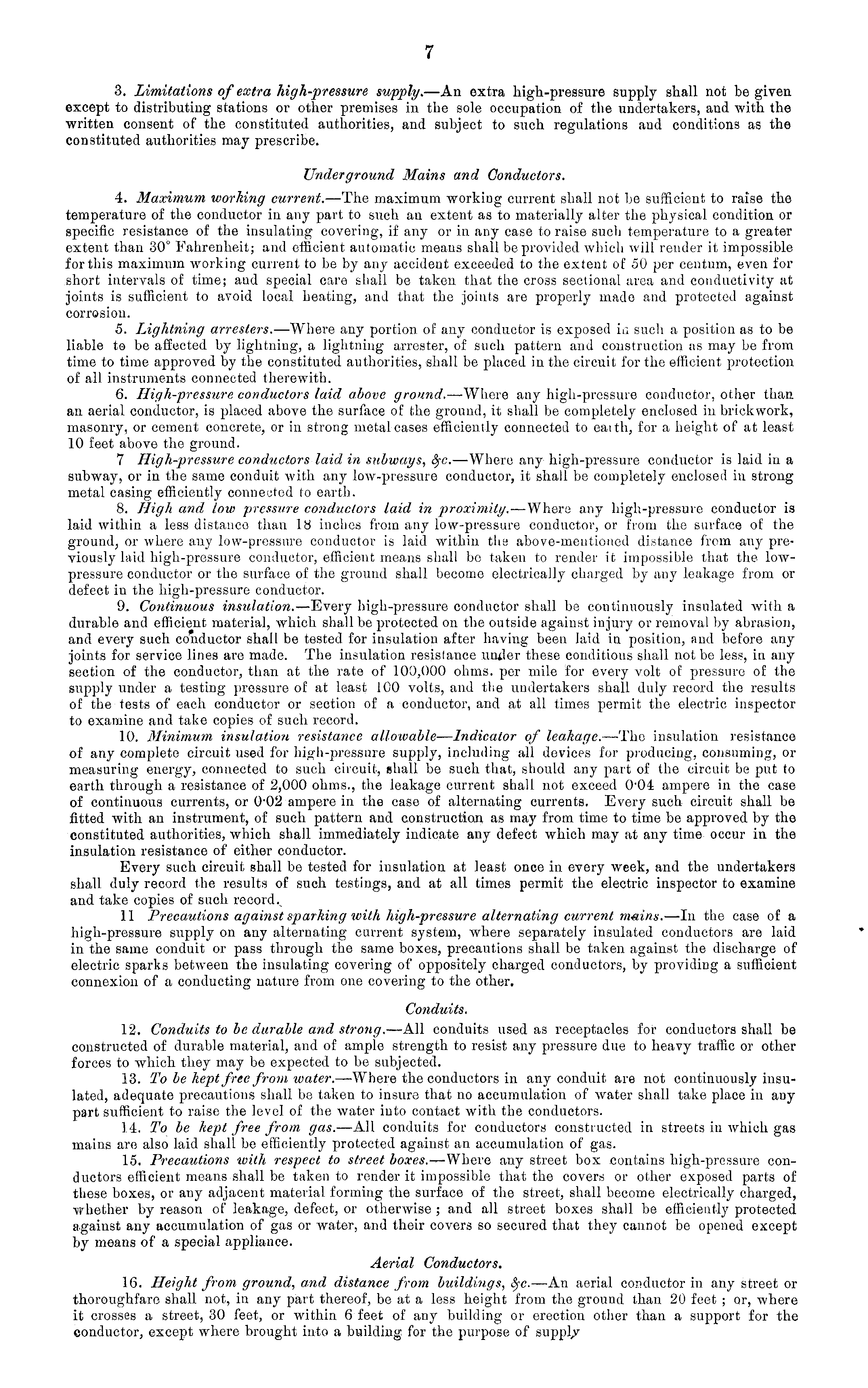 3. Limitations of extra high-pressure supply. —An extra high-pressure supply shall not he given except to distributing stations or other premises in the sole occupation of the undertakers, and with the "written consent of the constituted authorities, and subject to such regulations and conditions as the constituted authorities may prescribe. Underground Mains and Conductors. 4. Maximum working current. —The maximum working current shall not be sufficient to raise the temperature of the conductor in any part to such an extent as to materially alter the physical condition or specific resistance of the insulating covering, if any or in any case to raise such temperature to a greater extent than 30° Fahrenheit; and efficient automatic means shall be provided which will render it impossible for this maximum working current to be by any accident exceeded to the extent of 50 per centum, even for short intervals of time; and special care shall be taken that the cross sectional area and conductivity at joints is sufficient to avoid local heating, and that the joints are properly made and protected against corrosion. 5. Lightning arresters. —Where any portion of any conductor is exposed iv such a position as to be liable to be affected by lightning, a lightning arrester, of such pattern and construction as may be from time to time approved by the constituted authorities, shall be placed in the circuit for the efficient protection of all instruments connected therewith. 6. High-pressure conductors laid above ground. —Where any high-pressure conductor, other than an aerial conductor, is placed above the surface of the ground, it shall be completely enclosed in brickwork, masonry, or cement concrete, or in strong metal cases efficiently connected to caith, for a height of at least 10 feet above the ground. 7 High-pressure conductors laid in subways, Sfc. —Where any high-pressure conductor is laid in a subway, or in the same conduit with any low-pressure conductor, it shall be completely enclosed in strong metal casing efficiently connected to earth. 8. Nigh and low pressure conductors laid in proximity. —Where any high-pressure conductor is laid within a less distanco than IS inches from any low-pressure conductor, or from the surface of the ground, or where any low-pressure conductor is laid within the above-mentioned distance from any previously laid high-pressure conductor, efficient means shall bo taken to render it impossible that the lowpressure conductor or the surface of the ground shall become electrically charged by any leakage from or defect in the high-pressure conductor. 9. Continuous insulation. —Every high-pressure conductor shall be continuously insulated with a durable and efficient material, which shall be protected on the outside against injury or removal by abrasion, and every such conductor shall be tested for insulation after having been laid in position, and before any joints for service lines are made. The insulation resistance under these conditions shall not be less, in any section of the conductor, than at the rate of 100,000 ohms, per mile for every volt of pressure of the supply under a testing pressure of at least 100 volts, and the undertakers shall duly record the results of the tests of each conductor or section of a conductor, and at all times permit the electric inspector to examine and take copies of such record. 10. Minimum insulation resistance allowable — lndicator of leakage. —The insulation resistance of any complete circuit used for high-pressure supply, including all devices for producing, consuming, or measuring energy, connected to such circuit, shall be such that, should any part of the circuit be put to earth through a resistance of 2,000 ohms., the leakage current shall not exceed o'o4 ampere in the case of continuous currents, or o'o2 ampere in the case of alternating currents. Every such circuit shall be fitted with an instrument, of such pattern and construction as may from time to time be approved by the constituted authorities, which shall immediately indicate any defect which may at any time occur in the insulation resistance of either conductor. Every such circuit shall be tested for insulation at least once in every week, and the undertakers shall duly record the results of such testings, and at all times permit the electric inspector to examine and take copies of such record. 11 L J recautions against sparking with high-pressure alternating current m-ains. —ln the case of a high-pressure supply on auy alternating current system, where separately insulated conductors are laid in the same conduit or pass through the same boxes, precautions shall be taken against the discharge of electric sparks between the insulating covering of oppositely charged conductors, by providing a sufficient connexion of a conducting nature from one covering to the other. Conduits. 12. Conduits to be durable and strong. —All conduits used as receptacles for conductors shall he constructed of durable material, and of ample strength to resist any pressure due to heavy traffic or other forces to which they may be expected to be subjected. 13. To be kept free from water. —Where the conductors in any conduit are not continuously insulated, adequate precautions shall be taken to insure that no accumulation of water shall take place iv any part sufficient to raise the level of the water into contact with the conductors. 14. To be kept free from gas. —All conduits for conductors constructed in streets in which gas mains are also laid shalL bo efficiently protected agaiust an accumulation of gas. 15. Precautions with respect to street boxes. —Where any street box contains high-pressure conductors efficient moans shall be taken to render it impossible that the covers or other exposed parts of tbese boxes, or any adjacent material forming the surface of the street, shall become electrically charged, whether by reason of leakage, defect, or otherwise ; 