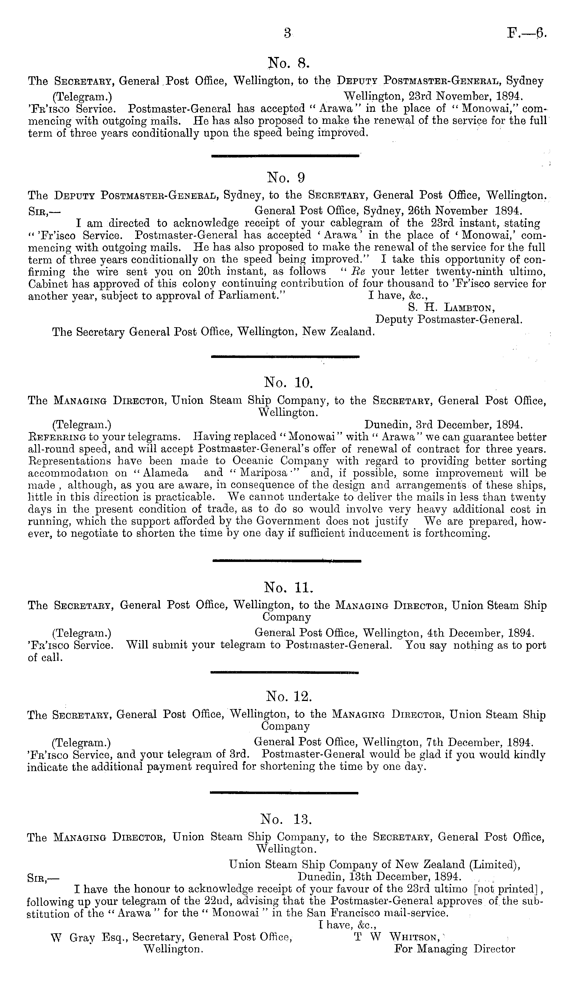 No. 8. The Seceetaey, General Post Office, Wellington, to the Deputy Postmastee-Geneeal, Sydney (Telegram.) Wellington, 23rd November, 1894. 'Fe'isco Service. Postmaster-General has accepted "Arawa" in the place of "Monowai," commencing with outgoing mails. He has also proposed to make the renewal of the service for the full term of three years conditionally upon the speed being improved.
