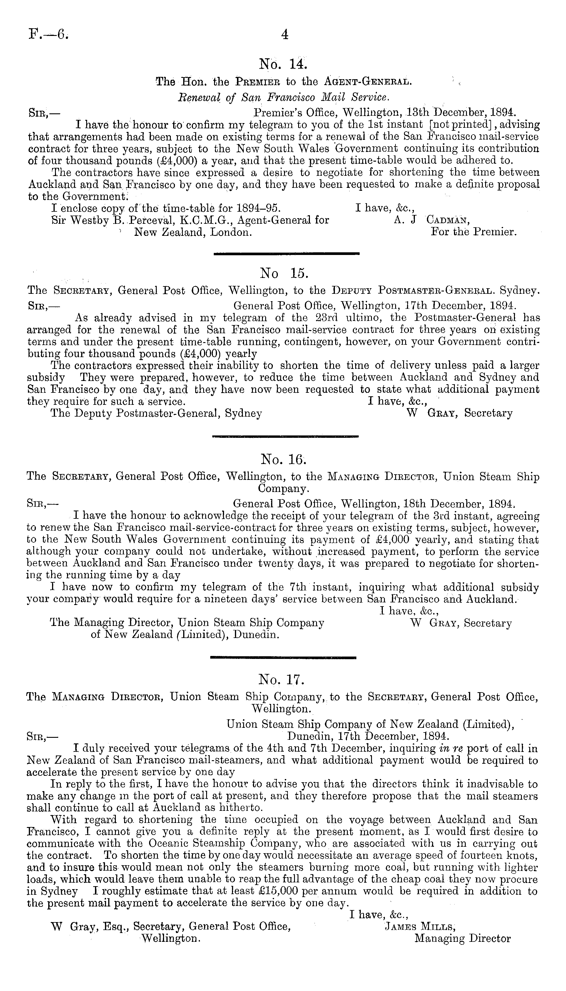 No. 16. The Seceetaey, General Post Office, Wellington, to the Managing Dieectoe, Union Steam Ship Company. Sic, — General Post Office, Wellington, 18th December, 1894. I have the honour to acknowledge the receipt of your telegram of the 3rd instant, agreeing to renew the San Francisco mail-service-contract for three years on existing terms, subject, however, to the New South Wales Government continuing its payment of £4,000 yearly, and. stating that although your company could not undertake, without increased payment, to perform the service between Auckland and San Francisco under twenty days, it was prepared to negotiate for shortening the running time by a day I have now to confirm my telegram of the 7th instant, inquiring what additional subsidy your company would require for a nineteen days' service between San Francisco and Auckland. I have, &c, The Managing Director, Union Steam Ship Company W Gray, Secretary of New Zealand (Limited), Dunedin.