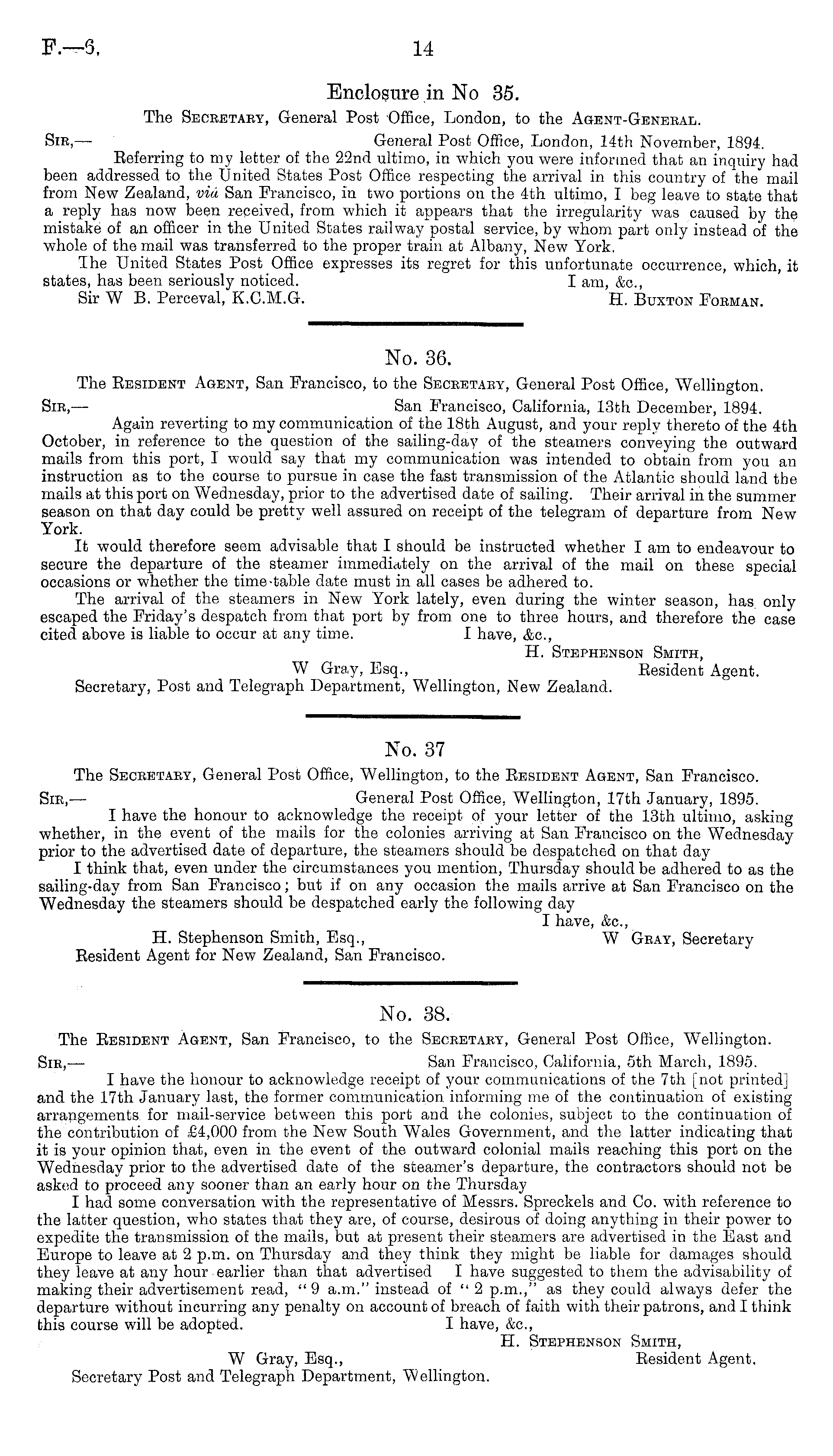 No. 36. The Resident Agent, San Francisco, to the Seceetaby, General Post Office, Wellington. Sir, — San Francisco, California, 13th December, 1894. Again reverting to my communication of the 18th August, and your reply thereto of the 4th October, in reference to the question of the sailing-day of the steamers conveying the outward mails from this port, I would say that my communication was intended to obtain from you an instruction as to the course to pursue in case the fast transmission of the Atlantic should land the mails at this port on Wednesday, prior to the advertised date of sailing. Their arrival in the summer season on that day could be pretty well assured on receipt of the telegram of departure from New York. It would therefore seem advisable that I should be instructed whether I am to endeavour to secure the departure of the steamer immediately on the arrival of the mail on these special occasions or whether the time-table date must in all cases be adhered to. The arrival of the steamers in New York lately, even during the winter season, has only escaped the Friday's despatch from that port by from one to three hours, and therefore the case cited above is liable to occur at any time. I have, &c, H. Stephenson Smith, W Gray, Esq., Resident Agent. Secretary, Post and Telegraph Department, Wellington, New Zealand.