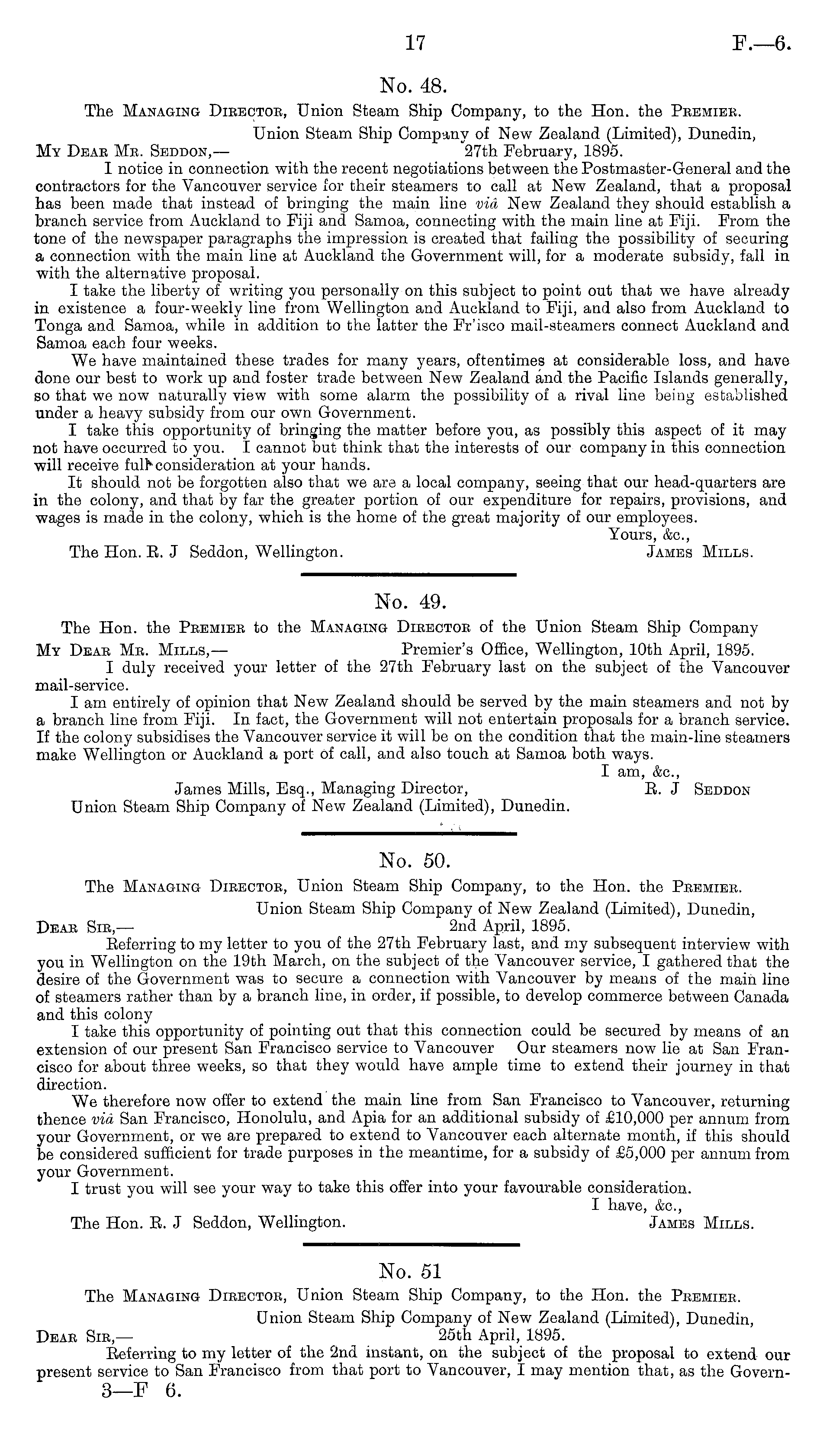 No. 50. The Managing Dieectoe, Union Steam Ship Company, to the Hon. the Pebmiee. Union Steam Ship Company of New Zealand (Limited), Dunedin, Deae Sib,— 2nd April, 1895. Eeferring to mv letter to you of the 27th February last, and my subsequent interview with you in Wellington on the 19th March, on the subject of the Vancouver service, I gathered that the desire of the Government was to secure a connection with Vancouver by means of the main line of steamers rather than by a branch line, in order, if possible, to develop commerce between Canada and this colony I take this opportunity of pointing out that this connection could be secured by means of an extension of our present San Francisco service to Vancouver Our steamers now lie at San Francisco for about three weeks, so that they would have ample time to extend their journey in that direction. We therefore now offer to extend the main line from. San Francisco to Vancouver, returning thence via San Francisco, Honolulu, and Apia for an additional subsidy of £10,000 per annum from your Government, or we are prepared to extend to Vancouver each alternate month, if this should be considered sufficient for trade purposes in the meantime, for a subsidy of £5,000 per annum from your Government. I trust you will see your way to take this offer into your favourable consideration. I have, &c, The Hon. E. J Seddon, Wellington. James Mills.