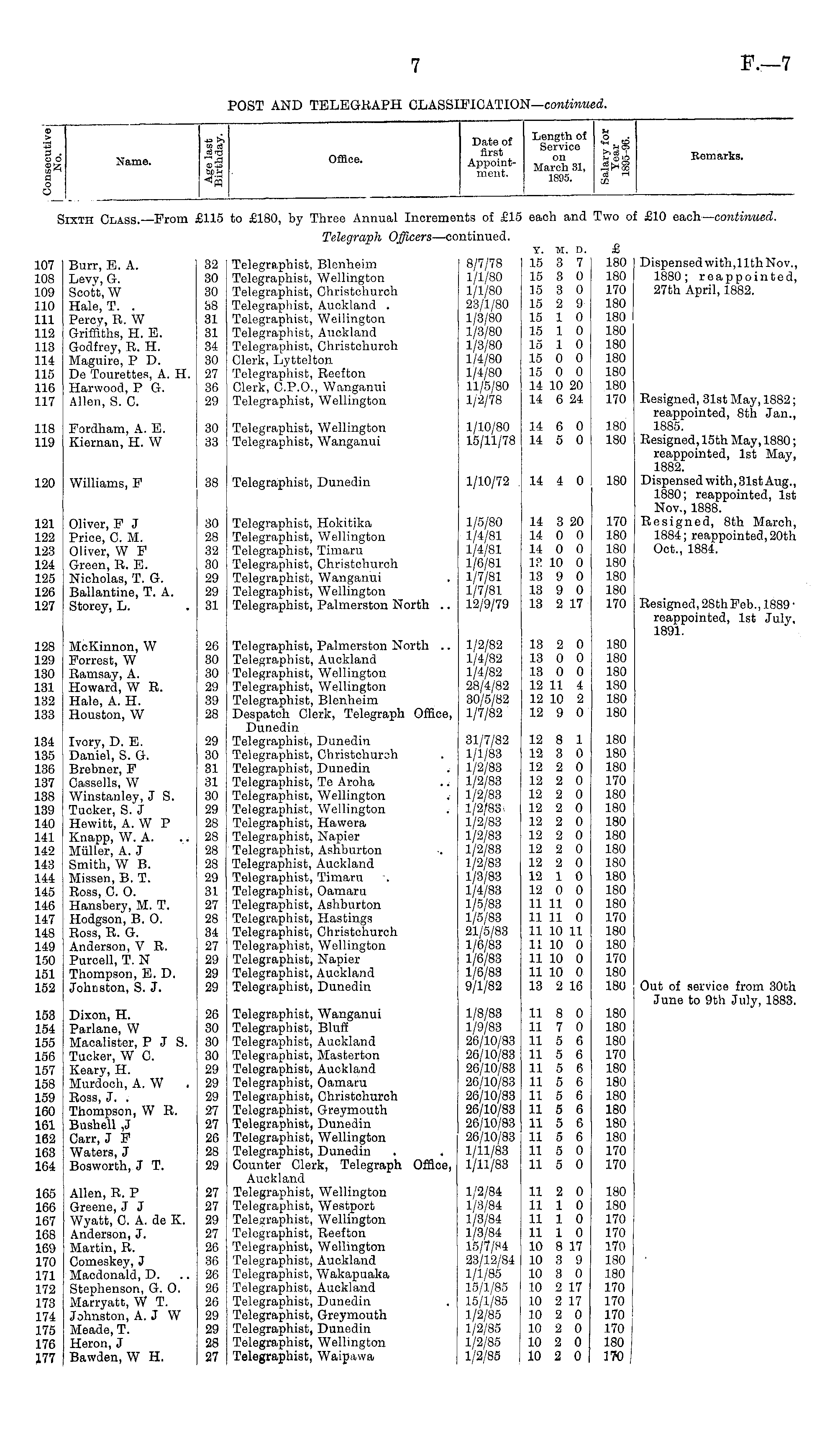 > o O o 43 i^ BE* - Office. Appoint- March31 meut 189S. $ - 1 Remarks. Name. Sixth Class. —From )115 to £180, by Three Annual Increme: its of £11 each and Two o: £10 each— continued. Telegraph Officers —co itinued. Y. M. D. 15 3 7 15 3 0 15 3 0 15 2 9 15 1 0 15 1 0 15 1 0 15 0 0 15 0 0 14 10 20 14 6 24 £ 180 180 170 180 180 180 180 180 180 180 170 Dispensed with,11th Nov., 1880; reappointed, 27th April, 1882. .07 .08 09 10 .11 .12 .13 .14 .15 .16 .17 Burr, E. A. Levy, G. Scott, W Hale, T. . Percy, R. W Griffiths, H. E. Godfrey, R. H. Maguire, P D. De Tourettes, A. H. Harwood, P G. Allen, S. C. 32 Telegraphist, Blenheim 30 Telegraphist, Wellington 30 Telegraphist, Christchurch 88 Telegraphist, Auckland . 31 Telegraphist, Wellington 31 Telegraphist, Auckland 34 Telegraphist, Christchurch 30 Clerk, Lyttelton 27 Telegraphist, Reefton 36 Clerk, C.P.O., Wanganui 29 Telegraphist, Wellington 8/7/78 1/1/80 1/1/80 23/1/80 1/3/80 1/3/80 1/3/80 1/4/80 1/4/80 11/5/80 1/2/78 .18 .19 Fordham, A. E. Kiernan, H. W 30 Telegraphist, Wellington 33 Telegraphist, Wanganui 1/10/80 15/11/78 14 6 0 14 5 0 14 4 0 180 180 180 Resigned, 31st May, 1882; reappointed, 8th Jan., 1885. Resigned, 15th May, 1880; reappointed, 1st May, 1882. Dispensed with, 31st Aug., 1880; reappointed, 1st Nov., 1888. Resigned, 8th March, 1884; reappointed, 20th Oct., 1884. .20 Williams, P 38 Telegraphist, Dunedin 38 1/10/72 .21 .22 .23 24 .25 .26 27 Oliver, F J Price, C. M. Oliver, W F Green, R. E. j Nicholas, T. G. Ballantine, T. A. Storey, L. 30 Telegraphist, Hokitika 28 Telegraphist, Wellington 32 Telegraphist, Timaru 30 Telegraphist, Christchurch 29 Telegraphist, Wanganui 29 Telegraphist, Wellington 31 Telegraphist, Palmerston North .. 30 28 32 30 29 2!) 31 1/5/80 1/4/81 1/4/81 1/6/81 1/7/81 1/7/81 12/9/79 14 3 20 14 0 0 14 0 0 1?. 10 0 13 9 0 13 9 0 13 2 17 170 180 180 180 180 180 170 Resigned, 28thFeb., 1889 ■ reappointed, 1st July, 1891. 128 129 130 131 132 133 McKinnon, W Forrest, W Ramsay, A. Howard, W R. Hale, A. H. Houston, W 26 Telegraphist, Palmerston North .. 30 Telegraphist, Auckland 30 Telegraphist, Wellington 29 Telegraphist, Wellington 39 Telegraphist, Blenheim 28 Despatch Clerk, Telegraph Office, Dunedin 29 Telegraphist, Dunedin 30 Telegraphist, Ohristchurch 31 Telegraphist, Dunedin 31 Telegraphist, Te Aroha 30 Telegraphist, Wellington 29 Telegraphist, Wellington 28 Telegraphist, Hawera 28 Telegraphist, Napier 28 Telegraphist, Ashburton 28 Telegraphist, Auckland 29 Telegraphist, Timaru 31 Telegraphist, Oamaru 27 Telegraphist, Ashburton 28 Telegraphist, Hastings 34 Telegraphist, Christchurch 27 Telegraphist, Wellington 29 Telegraphist, Napier 29 Telegraphist, Auckland 29 Telegraphist, Dunedin 26 30 :)<) 29 39 28 1/2/82 1/4/82 1/4/82 28/4/82 30/5/82 1/7/82 13 2 0 13 0 0 13 0 0 12 11 4 12 10 2 12 9 0 180 180 180 180 180 180 134 135 136 137 138 139 140 141 142 143 144 145 146 147 148 149 150 151 152 Ivory, D. E. Daniel, S. G. Brebner, F Cassells, W Winstanley, J S. Tucker, S. J Hewitt, A. W P Knapp, W. A. Miiller, A. J Smith, W B. Missen, B. T. Ross, C. 0. Hansbery, M. T. Hodgson, B. 0. Ross, R. G. Anderson, V R. Puroell, T. N Thompson, E. D. Johnston, S. J. 29 30 81 31 30 29 28 28 28 ■M 29 31 27 28 84 27 29 29 29 31/7/82 1/1/83 1/2/83 1/2/83 1/2/83 1/2/831/2/83 1/2/83 1/2/83 1/2/83 1/3/83 1/4/83 1/5/83 1/5/83 21/5/83 1/6/83 1/6/83 1/6/83 9/1/82 12 8 1 12 3 0 12 2 0 12 2 0 12 2 0 12 2 0 12 2 0 12 2 0 12 2 0 12 2 0 12 1 0 12 0 0 11 11 0 11 11 0 11 10 11 V, 10 0 11 10 0 11 10 0 13 2 16 180 180 180 170 180 180 180 180 180 180 180 180 180 170 180 180 170 180 180 Out of service from 30th June to 9th July, 1883. 153 154 155 156 157 158 159 160 161 162 163 164 Dixon, H. Parlane, W Macalister, P J S. I Tucker, W C. : Keary, H. Murdoch, A. W Ross, J. . Thompson, W R. Bushell ,J Carr, J F Waters, J Bosworth, J T. 26 Telegraphist, Wanganui 30 Telegraphist, Bluff 30 Telegraphist, Auckland 30 Telegraphist, Masterton 29 Telegraphist, Auckland 29 Telegraphist, Oamaru 29 Telegraphist, Christchurch 27 Telegraphist, Greymouth 27 Telegraphist, Dunedin 26 Telegraphist, Wellington 28 Telegraphist, Dunedin . . 29 Counter Clerk, Telegraph Office, Auckland 27 Telegraphist, Wellington 27 Telegraphist, Westport 29 Telegraphist, Wellington 27 Telegraphist, Reefton 26 Telegraphist, Wellington 36 Telegraphist, Auckland 26 Telegraphist, Wakapuaka 26 Telegraphist, Auckland 26 Telegraphist, Dunedin 29 Telegraphist, Greymouth 29 Telegraphist, Dunedin 28 Telegraphist, Wellington 27 Telegraphist, Waipawa 20 80 30 30 29 29 29 27 27 2G 28 29 1/8/83 1/9/83 26/10/83 26/10/83 26/10/83 26/10/83 26/10/83 26/10/83 26/10/83 26/10/83 1/11/83 1/11/83 11 8 0 11 7 0 11 5 6 11 5 6 11 5 6 11 5 6 11 5 6 11 5 6 11 5 6 11 5 6 11 5 0 11 5 0 180 180 180 170 180 180 180 180 180 180 170 170 165 166 167 168 169 170 171 172 173 174 175 176 177 Allen, R. P Greene, J J Wyatt, 0. A. de K. Anderson, J. Martin, R. Comeskey, J Macdonald, D. Stephenson, G. 0. Marryatt, W T. Johnston, A. J W Meade, T. Heron, J Bawden, W H. 27 27 21) 27 26 86 26 26 26 29 29 28 27 1/2/84 1/3/84 1/3/84 1/3/84 15/7/84 23/12/84 1/1/85 15/1/85 15/1/85 1/2/85 1/2/85 1/2/85 1/2/85 11 2 0 11 1 0 11 1 0 11 1 0 10 8 17 10 3 9 10 3 0 10 2 17 10 2 17 10 2 0 10 2 0 10 2 0 10 2 0 180 180 170 170 170 180 180 170 170 170 170 180 370