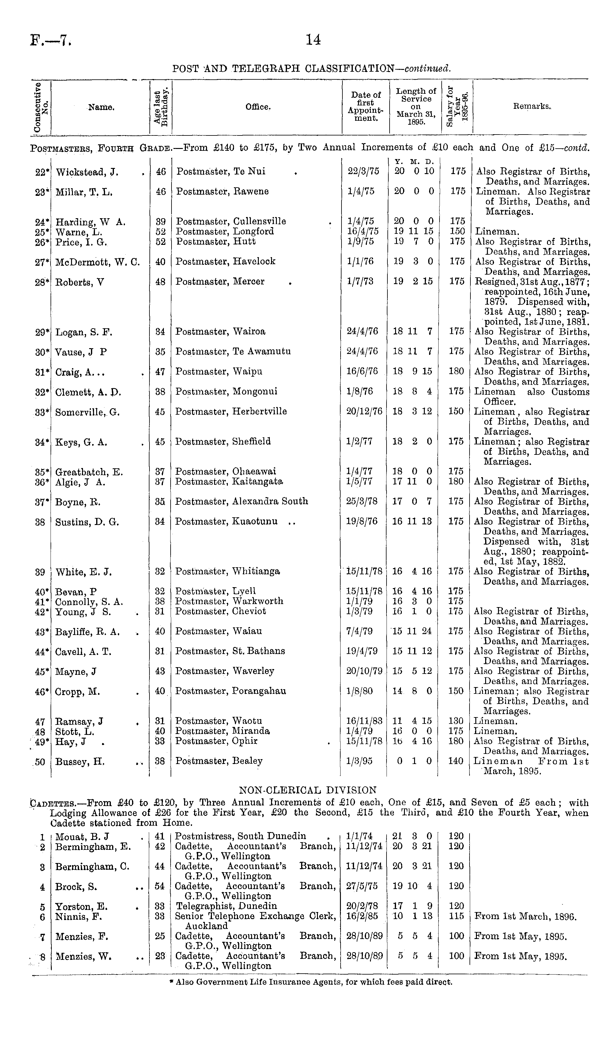 u o Name. Office. Date of first Appointment. Length of o Service *s^9 on j* Qio March 31, ,5S*S> 1895. $ rt Remarks. ?osi MASTERS, FOUBTH GRADE ;ADE .—From £140 to £175, by Two Anni ual Increments of £: .0 eaci i and One of £15— contd. 22* Wickstead, J. . 46 46 Postmaster, Te Nui Y. M. D. 22/3/75 20 0 10 175 Also Registrar of Births, Deaths, and Marriages. Lineman. Also Registrar of Births, Deaths, and Marriages. 23* Millar, T. L. 46 46 Postmaster, Rawene 1/4/75 20 0 0 175 24* 25* 26* Harding, W A. 39 Warne, L. 52 Price, I. G. 52 39 52 52 Postmaster, Cullensville Postmaster, Longford Postmaster, Hutt 1/4/75 20 0 0 16/4/75 19 11 15 1/9/75 19 7 0 175 150 175 Lineman. Also Registrar of Births, Deaths, and Marriages. Also Registrar of Births, Deaths, and Marriages. Resigned, 31st Aug., 1877; reappointed, 16th June, 1879. Dispensed with, 31st Aug., 1880; reappointed, 1st June, 1881. Also Registrar of Births, Deaths, and Marriages. Also Registrar of Births, Deaths, and Marriages. Also Registrar of Births, Deaths, and Marriages. Lineman also Customs Officer. Lineman, also Registrar of Births, Deaths, and Marriages. Lineman; also Registrar of Births, Deaths, and Marriages. 27* McDermott, W. C. 40 40 Postmaster, Havelook 1/1/76 19 3 0 175 28* Roberts, V 48 4H Postmaster, Mercer I 1/7/73 19 2 15 J 175 Logan, S. F. 34 Postmaster, Wairoa 24/4/76 18 11 7 29* 34 175 30* Vause, J P 35 35 Postmaster, Te Awamutu 24/4/76 18 11 7 J 175 31* Craig, A. .. .47 47 Postmaster, Waipu 16/6/76 18 9 15 180 32* Clemett, A. D. 38 38 Postmaster, Mongonui 1/8/76 18 8 4 175 33* Somerville, G. 45 45 Postmaster, Herbertville 20/12/76 18 3 12 150 34* Keys, G. A. . 45 4;"> Postmaster, Sheffield 1/2/77 18 2 0 175 35* 36* Greatbatch, E. 37 Algie, J A. 37 37 37 Postmaster, Obaeawai Postmaster, Kaitangata 1/4/77 18 0 0 1/5/77 17 11 0 175 180 Also Registrar of Births, Deaths, and Marriages. Also Registrar of Births, Deaths, and Marriages. Also Registrar of Births, Deaths, and Marriages. Dispensed with, 31st Aug., 1880; reappointed, 1st May, 1882. Also Registrar of Births, Deaths, and Marriages. 37* Boyne, R. 35 35 Postmaster, Alexandra South 25/3/78 17 0 7 175 38 Sustins, D. G. 34 34 Postmaster, Kuaotunu .. 19/8/76 16 11 13 175 White, E. J. 32 Postmaster, Whitianga 15/11/78 16 4 16 39 32 175 40* 41* 42* Bevan, P 32 Connolly, S. A. 38 Young, J S. .31 32 38 31 Postmaster, Lyell Postmaster, Warkworth Postmaster, Cheviot 15/11/78 16 4 16 1/1/79 16 3 0 1/3/79 16 1 0 175 175 175 Also Registrar of Births, Deaths, and Marriages. Also Registrar of Births, Deaths, and Marriages. Also Registrar of Births, Deaths, and Marriages. Also Registrar of Births, Deaths, and Marriages. Lineman; also Registrar of Births, Deaths, and Marriages. Lineman. Lineman. Also Registrar of Births, Deaths, and Marriages. Lineman From 1st March, 1895. 43* Bayliffe, R. A. . 40 40 Postmaster, Waiau 7/4/79 15 11 24 175 44* Cavell, A. T. 31 31 Postmaster, St. Bathans 19/4/79 15 11 12 175 45* Mayne, J 43 43 Postmaster, Waverley 20/10/79 15 5 12 175 46* Cropp, M. . 40 40 Postmaster, Porangahau 1/8/80 14 8 0 150 47 48 49* Ramsay, J . 31 Stott, L. 40 Hay, J . 33 31 40 33 Postmaster, Waotu Postmaster, Miranda Postmaster, Ophir 16/11/83 11 4 15 1/4/79 16 0 0 15/11/78 lb 4 16 130 175 180 50 Bussey, H. .. 38 38 Postmaster, Bealey 1/3/95 0 10 140 ettes.—From £40 to £12( Lodging Allowance of £26 Cadette stationed from H NON-CLERICAL DIA 0, by Three Annual Increments of £ 1 for the First Year, £20 the Secom VISION E10 each, One of £lf d, £15 the Third, a Seven of £5 each ; with ) the Fourth Year, when Dad: i, and md £li !ome. 1 2 Mouat, B. J . 41 ] Bermingham, E. 42 41 42 I Postmistress, South Dunedin . | Cadette, Accountant's Branch, G.P.O., Wellington Cadette, Accountant's Branch, G.P.O., Wellington Cadette, Accountant's Branch, G.P.O., Wellington Telegraphist, Dunedin I Senior Telephone Exchange Clerk, Auckland Cadette, Accountant's Branch, G.P.O., Wellington Cadette, Accountant's Branch, G.P.O., Wellington 1/1/74 j 21 3 0 11/12/74 20 3 21 120 120 3 Bermingham, C. 44 44 11/12/74 20 3 21 120 From 1st March, 1896. 4 Brock, S. .. 54 54 27/5/75 19 10 4 120 5 6 Yorston, E. .33 Ninnis, F. 33 I 33 33 20/2/78 17 1 9 16/2/85 10 1 13 120 115 7 Menzies, F. 25 25 28/10/89 5 5 4 100 From 1st May, 1895. 8 Menzies, W. .. 23 23 28/10/89 5 5 4 100 From 1st May, 1895. Also Government Life Insurance Agents, for which fees paid direct.