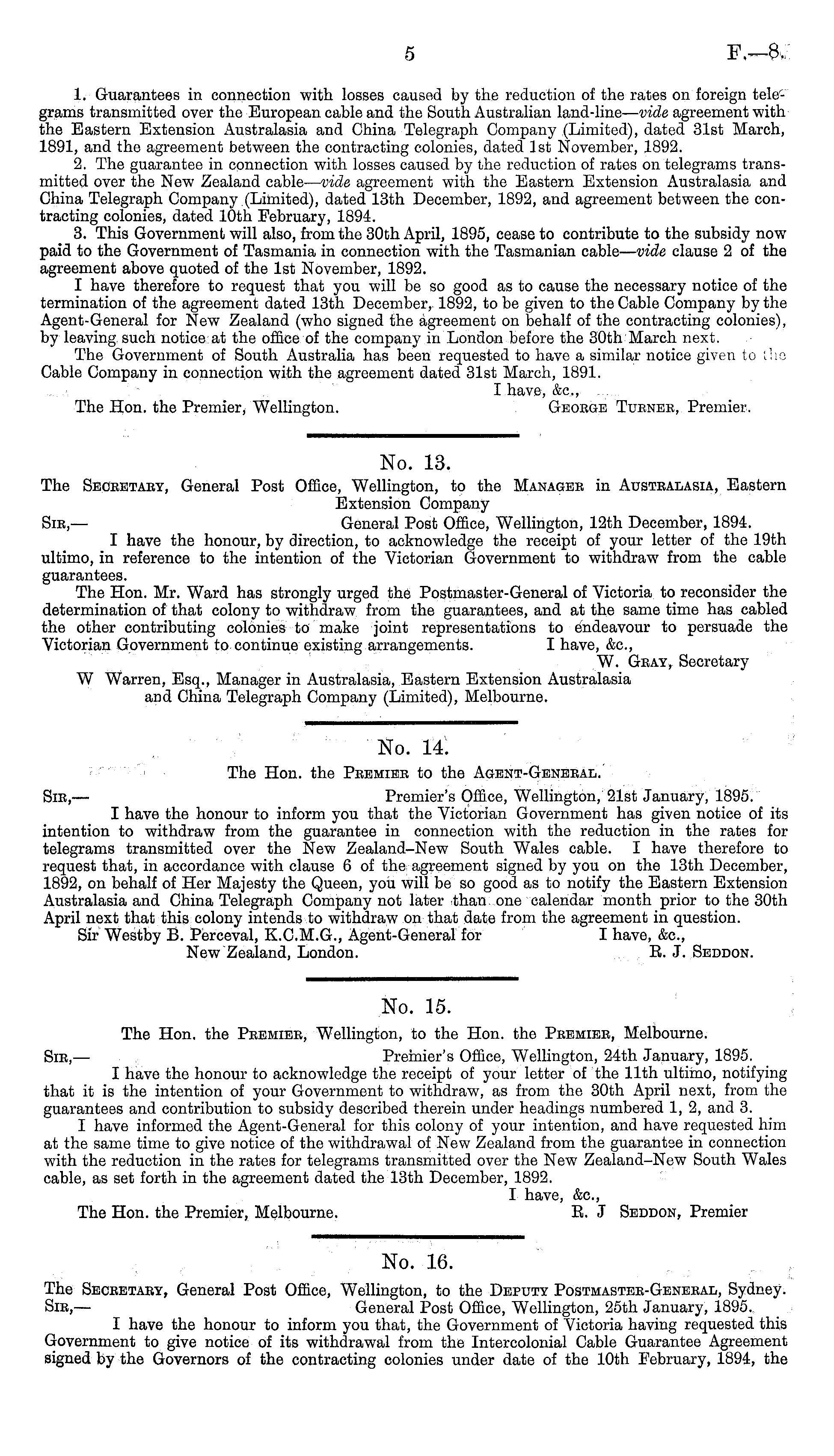 No. 15. The Hon. the Peemiee, Wellington, to the Hon. the Peemiee, Melbourne. Sib, — Premier's Office, Wellington, 24th January, 1895. I have the honour to acknowledge the receipt of your letter of the 11th ultimo, notifying that it is the intention of your Government to withdraw, as from the 30th April next, from the guarantees and contribution to subsidy described therein under headings numbered 1, 2, and 3. I have informed the Agent-General for this colony of your intention, and have requested him at the same time to give notice of the withdrawal of New Zealand from the guarantee in connection with the reduction in the rates for telegrams transmitted over the New Zealand-New South Wales cable, as set forth in the agreement dated the 13th December, 1892. I have, &c, The Hon. the Premier, Melbourne. E. J Seddon, Premier