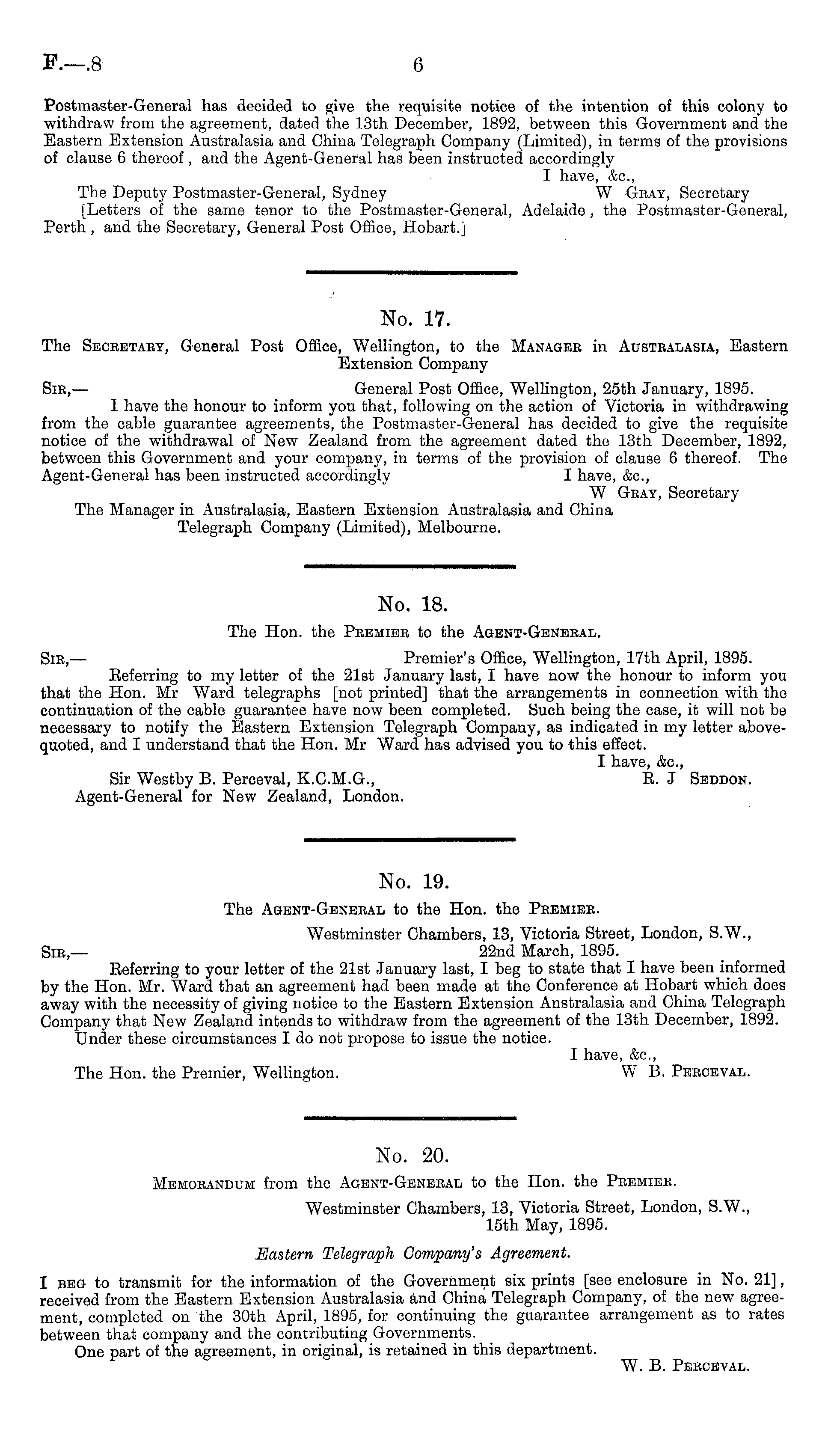 No. 19. The Agent-Geneeal to the Hon. the Peemiee. Westminster Chambers, 13, Victoria Street, London, S.W., Sib,— 22nd March, 1895. Referring to your letter of the 21st January last, I beg to state that I have been informed by the Hon. Mr. Ward that an agreement had been made at the Conference at Hobart which does away with the necessity of giving notice to the Eastern Extension Anstralasia and China Telegraph Company that New Zealand intends to withdraw from the agreement of the 13th December, 1892. Under these circumstances I do not propose to issue the notice. I have, &c, The Hon. the Premier, Wellington. W B. Peeceval.
