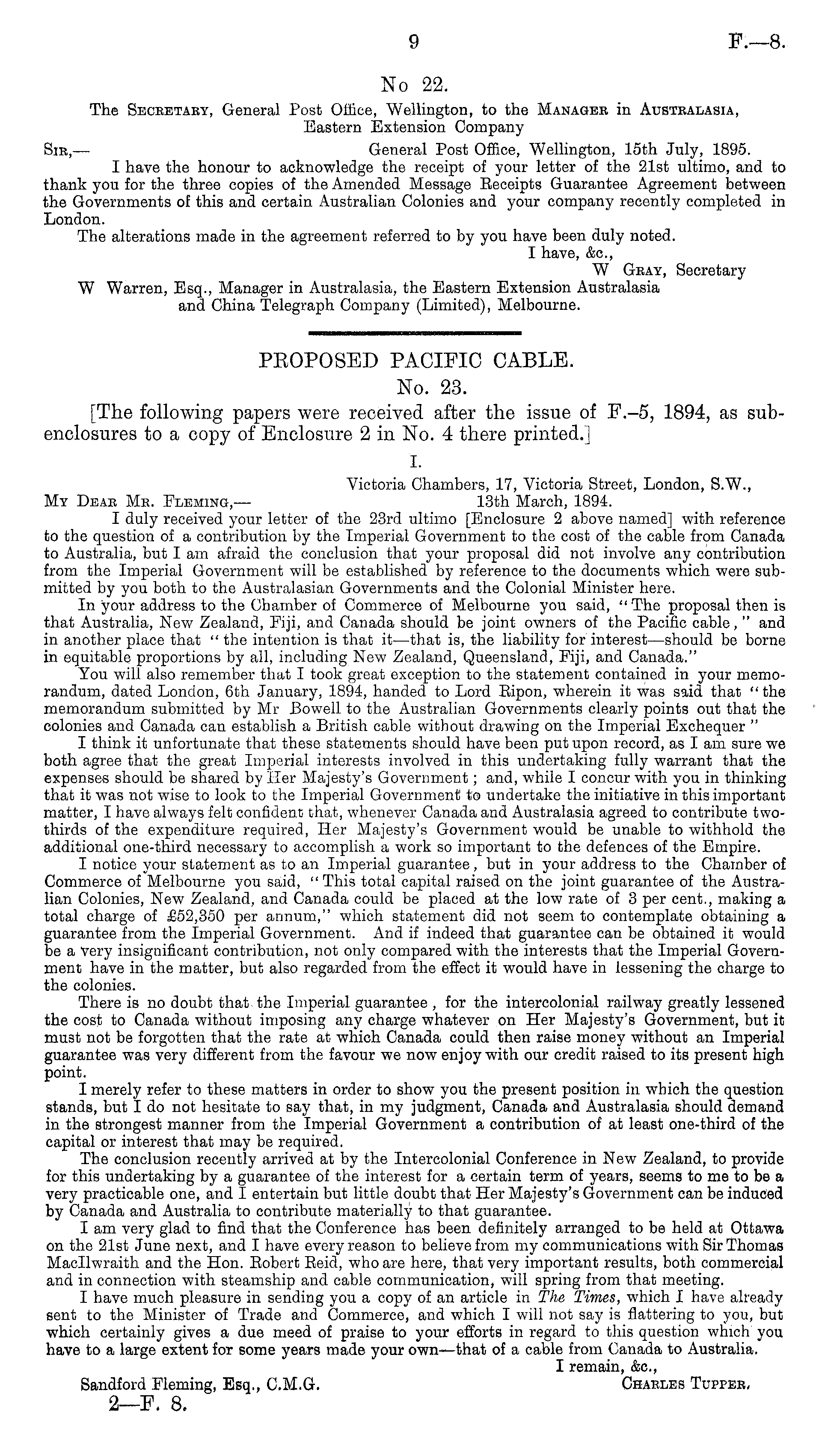 PEOPOSED PACIFIC CABLE. No. 23. [The following papers were received after the issue of F.-5, 1894, as subenclosures to a copy of Enclosure 2 in No. 4 there printed.] I. Victoria Chambers, 17, Victoria Street, London, S.W., My Dear Me. Fleming,-— 13th March, 1894. I duly received your letter of the 23rd ultimo [Enclosure 2 above named] with reference to the question of a contribution by the Imperial Government to the cost of the cable from Canada to Australia, but I am afraid the conclusion that your proposal did not involve any contribution from the Imperial Government will be established by reference to the documents which were submitted by you both to the Australasian Governments and the Colonial Minister here. In your address to the Chamber of Commerce of Melbourne you said, "The proposal then is that Australia, New Zealand, Fiji, and Canada should be joint owners of the Pacific cable, " and in another place that " the intention is that it—that is, the liability for interest —should be borne in equitable proportions by all, including New Zealand, Queensland, Fiji, and Canada." You will also remember that I took great exception to the statement contained in your memorandum, dated London, 6th January, 1894, handed to Lord Eipon, wherein it was said that " the memorandum submitted by Mr Bowell to the Australian Governments clearly points out that the colonies and Canada can establish a British cable without drawing on the Imperial Exchequer " I think it unfortunate that these statements should have been put upon record, as I am sure we both agree that the great Imperial interests involved in this undertaking fully warrant that the expenses should be shared by Her Majesty's Government; and, while I concur with you in thinking that it was not wise to look to the Imperial Government to undertake the initiative in this important matter, I have always felt confident that, whenever Canada and Australasia agreed to contribute twothirds of the expenditure required, Her Majesty's Government would be unable to withhold the additional one-third necessary to accomplish a work so important to the defences of the Empire. I notice your statement as to an Imperial guarantee, but in your address to the Chamber of Commerce of Melbourne you said, " This total capital raised on the joint guarantee of the Australian Colonies, New Zealand, and Canada could be placed at the low rate of 3 per cent., making a total charge of £52,350 per annum," which statement did not seem to contemplate obtaining a guarantee from the Imperial Government. And if indeed that guarantee can be obtained it would be a very insignificant contribution, not only compared with the interests that the Imperial Government have in the matter, but also regarded from the effect it would have in lessening the charge to the colonies. There is no doubt that the Imperial guarantee , for the intercolonial railway greatly lessened the cost to Canada without imposing any charge whatever on Her Majesty's Government, but it must not be forgotten that the rate at which Canada could then raise money without an Imperial guarantee was very different from the favour we now enjoy with our credit raised to its present high point. I merely refer to these matters in order to show you the present position in which the question stands, but I do not hesitate to say that, in my judgment, Canada and Australasia should demand in the strongest manner from the Imperial Government a contribution of at least one-third of the capital or interest that may be required. The conclusion recently arrived at by the Intercolonial Conference in New Zealand, to provide for this undertaking by a guarantee of the interest for a certain term of years, seems to me to be a very practicable one, and I entertain but little doubt that Her Majesty's Government can be induced by Canada and Australia to contribute materially to that guarantee. I am very glad to find that the Conference has been definitely arranged to be held at Ottawa on the 21st June next, and I have every reason to believe from my communications with Sir Thomas Macllwraith and the Hon. Eobert Eeid, who are here, that very important results, both commercial and in connection with steamship and cable communication, will spring from that meeting. I have much pleasure in sending you a copy of an article in The Times, which I have already sent to the Minister of Trade and Commerce, and which I will not say is flattering to you, but which certainly gives a due meed of praise to your efforts in regard to this question which you have to a large extent for some years made your own—that of a cable from Canada to Australia. I remain, &c, Sandford Fleming, Esq., C.M.G. Charles Tuppeb, 2—F. 8.