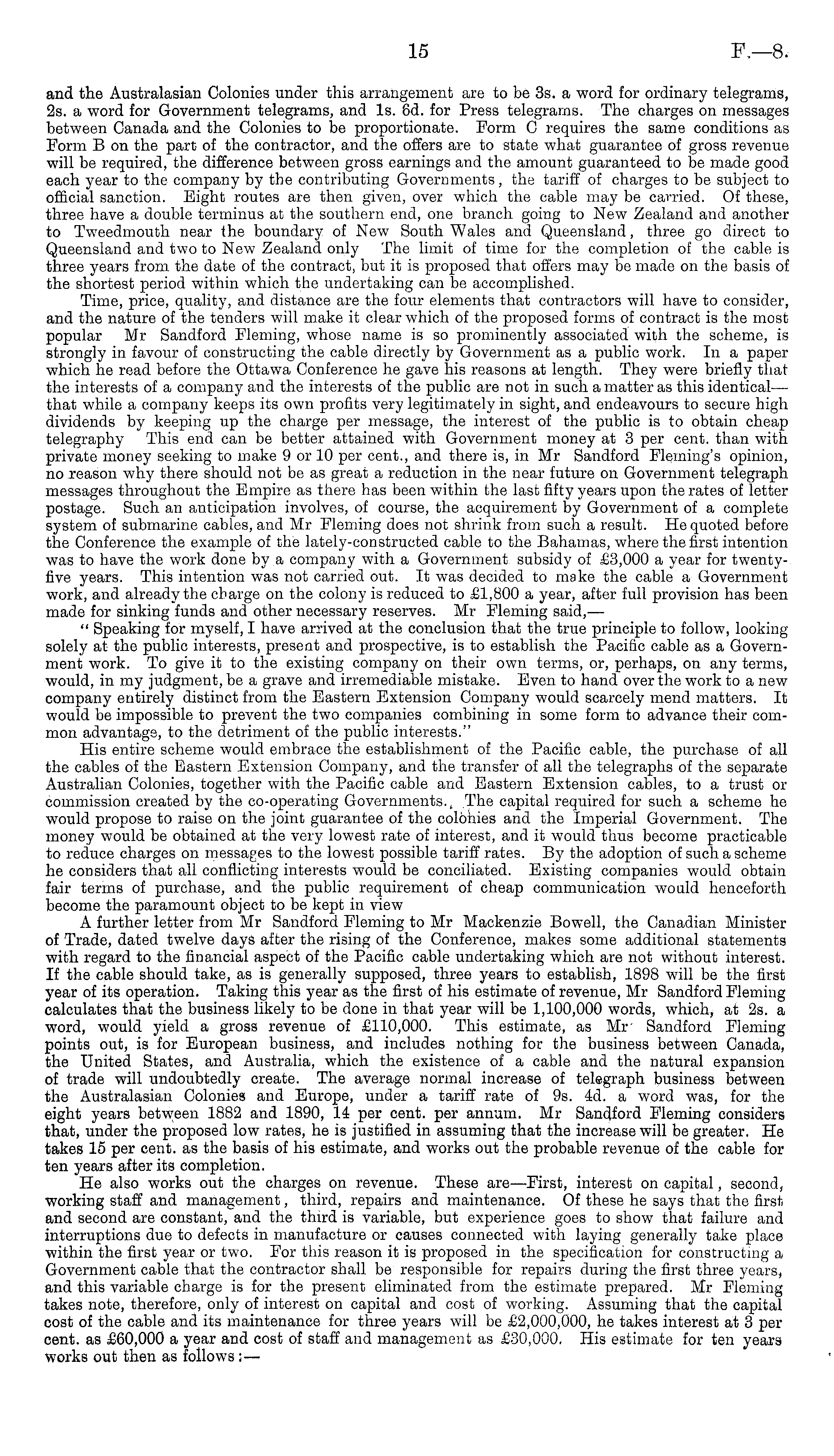 and the Australasian Colonies under this arrangement are to be 3s. a word for ordinary telegrams, 2s. a word for Government telegrams, and Is. 6d. for Press telegrams. The charges on messages between Canada and the Colonies to be proportionate. Form C requires the same conditions as Form B on the part of the contractor, and the offers are to state what guarantee of gross revenue will be required, the difference between gross earnings and the amount guaranteed to be made good each year to the company by the contributing Governments, the tariff of charges to be subject to official sanction. Eight routes are then given, over which the cable may be carried. Of these, three have a double terminus at the southern end, one branch going to New Zealand and another to Tweedmouth near the boundary of New South Wales and Queensland, three go direct to Queensland and two to New Zealand only The limit of time for the completion of the cable is three years from the date of the contract, but it is proposed that offers may be made on the basis of the shortest period within which the undertaking can be accomplished. Time, price, quality, and distance are the four elements that contractors will have to consider, and the nature of the tenders will make it clear which of the proposed forms of contract is the most popular Mr Sandford Fleming, whose name is so prominently associated with the scheme, is strongly in favour of constructing the cable directly by Government as a public work. In a paper which he read before the Ottawa Conference he gave his reasons at length. They were briefly that the interests of a company and the interests of the public are not in such a matter as this identical— that while a company keeps its own profits very legitimately in sight, and endeavours to secure high dividends by keeping up the charge per message, the interest of the public is to obtain cheap telegraphy This end can be better attained with Government money at 3 per cent, than with private money seeking to make 9or 10 per cent., and there is, in Mr Sandford Fleming's opinion, no reason why there should not be as great a reduction in the near future on Government telegraph messages throughout the Empire as there has been within the last fifty years upon the rates of letter postage. Such an anticipation involves, of course, the acquirement by Government of a complete system of submarine cables, and Mr Fleming does not shrink from such a result. He quoted before the Conference the example of the lately-constructed cable to the Bahamas, where the first intention was to have the work done by a company with a Government subsidy of £3,000 a year for twentyfive years. This intention was not carried out. It was decided to make the cable a Government work, and already the charge on the colony is reduced to £1,800 a year, after full provision has been made for sinking funds and other necessary reserves. Mr Fleming said, — " Speaking for myself, I have arrived at the conclusion that the true principle to follow, looking solely at the public interests, present and prospective, is to establish the Pacific cable as a Government work. To give it to the existing company on their own terms, or, perhaps, on any terms, would, in my judgment, be a grave and irremediable mistake. Even to hand over the work to a new company entirely distinct from the Eastern Extension Company would scarcely mend matters. It would be impossible to prevent the two companies combining in some form to advance their common advantage, to the detriment of the public interests." His entire scheme would embrace the establishment of the Pacific cable, the purchase of all the cables of the Eastern Extension Company, and the transfer of all the telegraphs of the separate Australian Colonies, together with the Pacific cable and Eastern Extension cables, to a trust or commission created by the co-operating Governments.,. The capital required for such a scheme he would propose to raise on the joint guarantee of the colonies and the Imperial Government. The money would be obtained at the very lowest rate of interest, and it would thus become practicable to reduce charges on messages to the lowest possible tariff rates. By the adoption of such a scheme he considers that all conflicting interests would be conciliated. Existing companies would obtain fair terms of purchase, and the public requirement of cheap communication would henceforth become the paramount object to be kept in view A further letter from Mr Sandford Fleming to Mr Mackenzie Bowell, the Canadian Minister of Trade, dated twelve days after the rising of the Conference, makes some additional statements with regard to the financial aspect of the Pacific cable undertaking which are not without interest. If the cable should take, as is generally supposed, three years to establish, 1898 will be the first year of its operation. Taking this year as the first of his estimate of revenue, Mr Sandford Fleming calculates that the business likely to be done in that year will be 1,100,000 words, which, at 2s. a word, would yield a gross revenue of £110,000. This estimate, as Mr Sandford Fleming points out, is for European business, and includes nothing for the business between Canada, the United States, and Australia, which the existence of a cable and the natural expansion of trade will undoubtedly create. The average normal increase of telegraph business between the Australasian Colonies and Europe, under a tariff rate of 9s. 4d. a word was, for the eight years between 1882 and 1890, 14 per cent, per annum. Mr Sandford Fleming considers that, under the proposed low rates, he is justified in assuming that the increase will be greater. He takes 15 per cent, as the basis of his estimate, and works out the probable revenue of the cable for ten years after its completion. He also works out the charges on revenue. These are —First, interest on capital, second, working staff and management, third, repairs and maintenance
