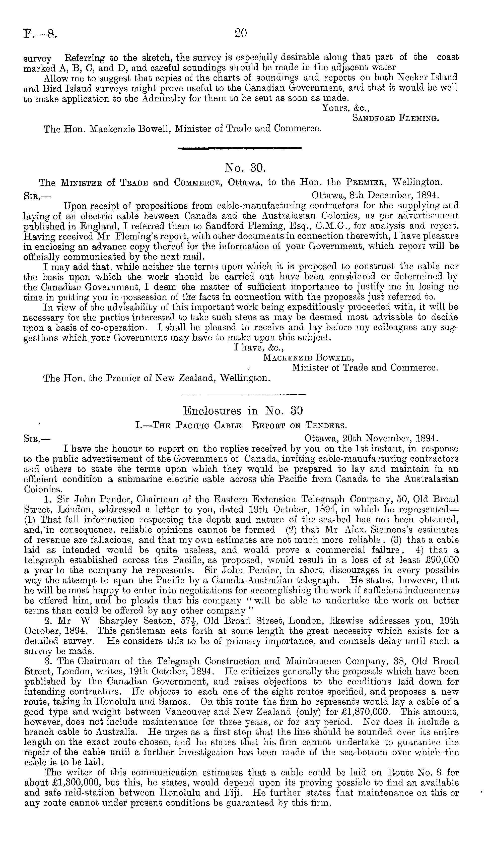 No. 30. The MiNisTEE of Trade and Commeecb, Ottawa, to the Hon. the Peemiee, Wellington. Sic, — Ottawa, Bth December, 1894. Upon receipt of propositions from cable-manufacturing contractors for the supplying and laying of an electric cable between Canada and the Australasian Colonies, as per advertisement published in England, I referred them to Sandford Fleming, Esq., C.M.G., for analysis and report. Having received Mr Fleming's report, with other documents in connection therewith, I have pleasure in enclosing an advance copy thereof for the information of your Government, which report will be officially communicated by the next mail. I may add that, while neither the terms upon which it is proposed to construct the cable nor the basis upon which the work should be carried out have been considered or determined by the Canadian Government, I deem the matter of sufficient importance to justify me in losing no time in putting you in possession of the facts in connection with the proposals just referred to. In view of the advisability of this important work being expeditiously proceeded with, it will be necessary for the parties interested to take such steps as may be deemed most advisable to decide upon a basis of co-operation. I shall be pleased to receive and lay before my colleagues any suggestions which your Government may have to make upon this subject. I have, &c, Mackenzie Bowell, Minister of Trade and Commerce. The Hon. the Premier of New Zealand, Wellington.