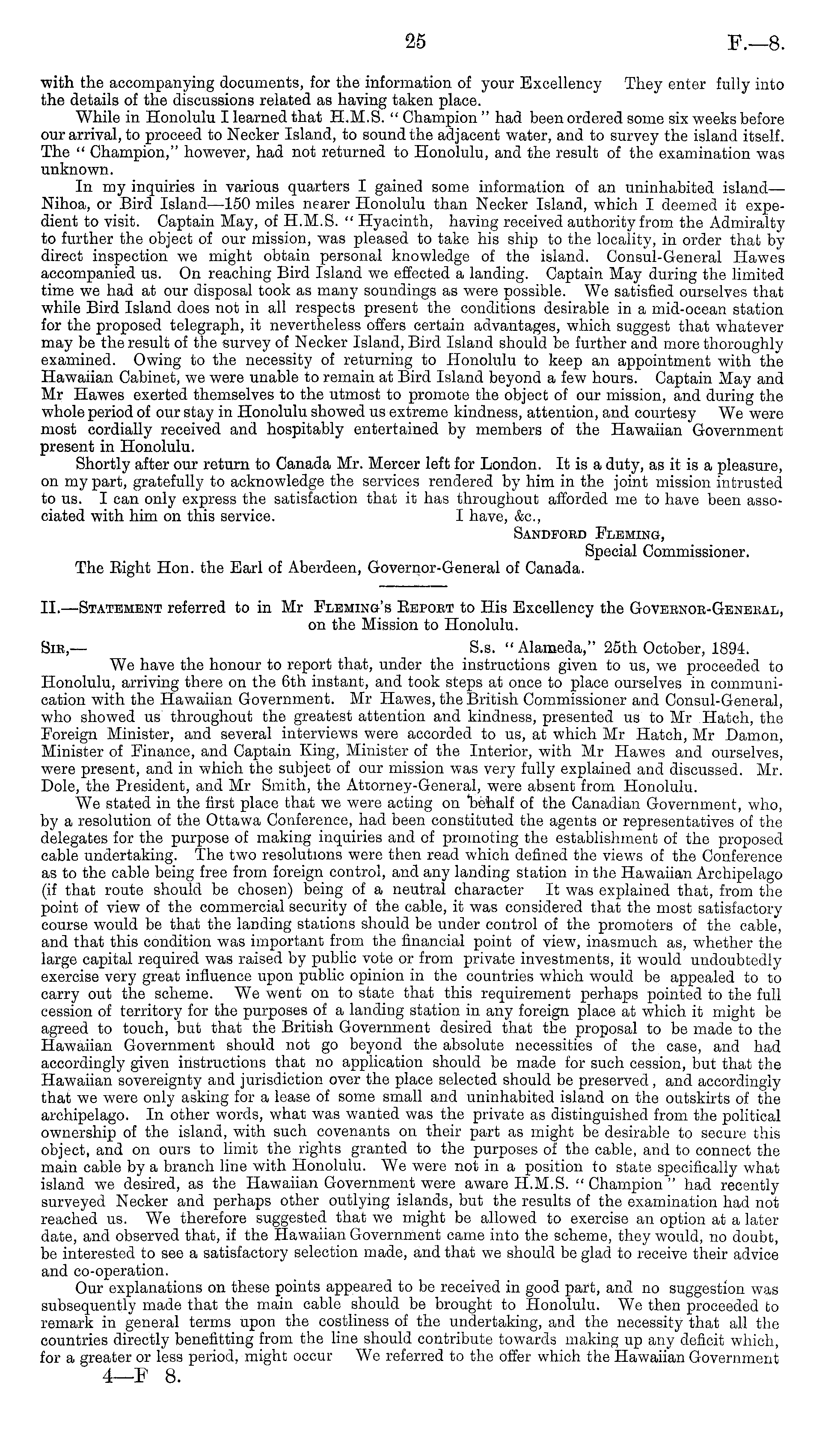 with the accompanying documents, for the information of your Excellency They enter fully into the details of the discussions related as having taken place. While in Honolulu I learned that H.M.S. " Champion " had been ordered some six weeks before our arrival, to proceed to Necker Island, to sound the adjacent water, and to survey the island itself. The " Champion," however, had not returned to Honolulu, and the result of the examination was unknown. In my inquiries in various quarters I gained some information of an uninhabited island— Nihoa, or Bird Island—lso miles nearer Honolulu than Necker Island, which I deemed it expedient to visit. Captain May, of H.M.S. " Hyacinth, having received authority from the Admiralty to further the object of our mission, was pleased to take his ship to the locality, in order that bydirect inspection we might obtain personal knowledge of the island. Consul-General Hawes accompanied us. On reaching Bird Island we effected a landing. Captain May during the limited time we had at our disposal took as many soundings as were possible. We satisfied ourselves that while Bird Island does not in all respects present the conditions desirable in a mid-ocean station for the proposed telegraph, it nevertheless offers certain advantages, which suggest that whatever may be the result of the survey of Necker Island, Bird Island should be further and more thoroughly examined. Owing to the necessity of returning to Honolulu to keep an appointment with the Hawaiian Cabinet, we were unable to remain at Bird Island beyond a few hours. Captain May and Mr Hawes exerted themselves to the utmost to promote the object of our mission, and during the whole period of our stay in Honolulu showed us extreme kindness, attention, and courtesy We were most cordially received and hospitably entertained by members of the Hawaiian Government present in Honolulu. Shortly after our return to Canada Mr. Mercer left for London. It is a duty, as it is a pleasure, on my part, gratefully to acknowledge the services rendered by him in the joint mission intrusted to us. I can only express the satisfaction that it has throughout afforded me to have been associated with him on this service. I have, &c, Sandfoed Fleming, Special Commissioner. The Eight Hon. the Earl of Aberdeen, Governor-General of Canada.