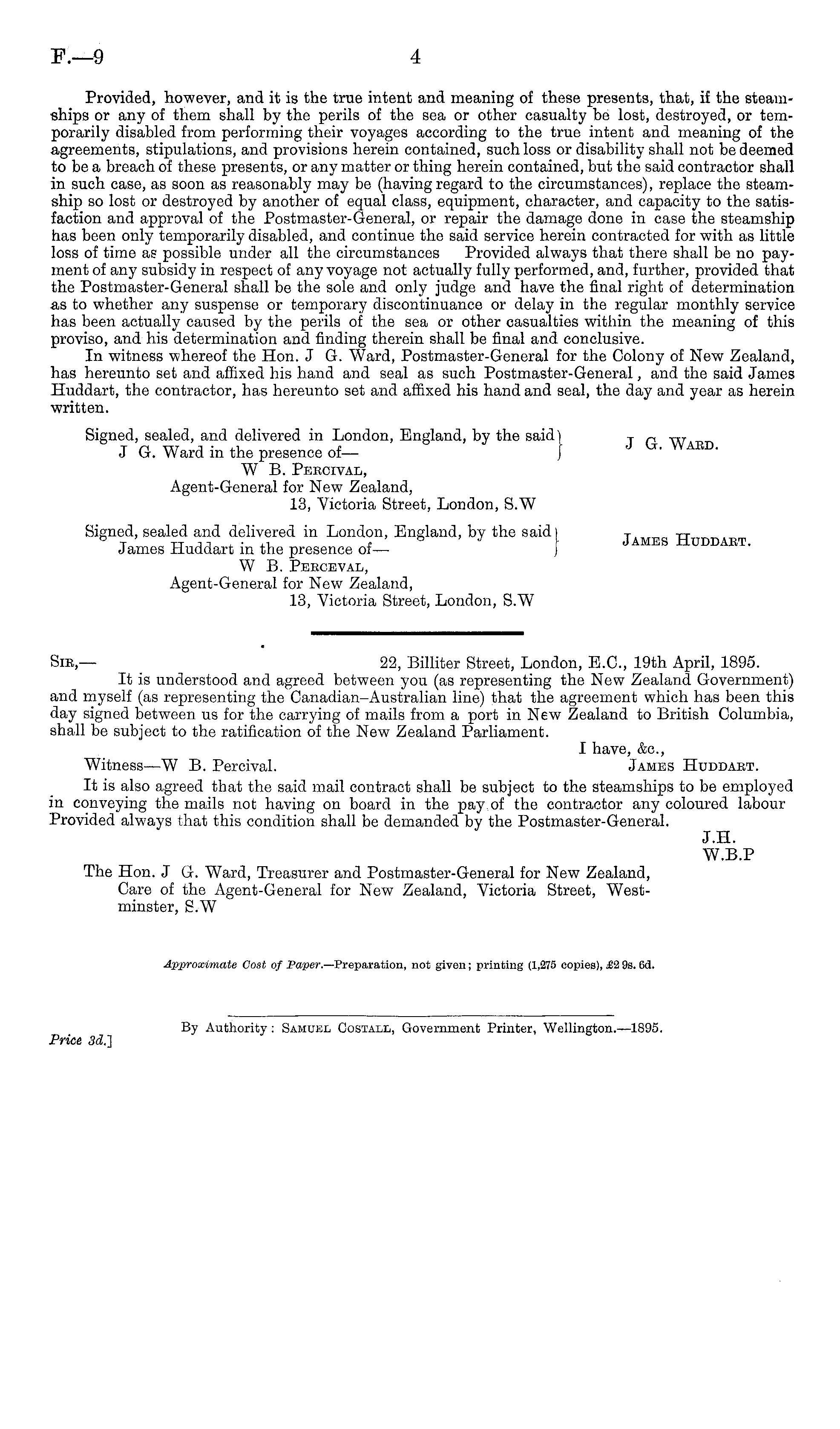 Sib,— 22, Billiter Street, London, 8.C., 19th April, 1895. It is understood and agreed between you (as representing the New Zealand Government) and myself (as representing the Canadian-Australian line) that the agreement which has been this day signed between us for the carrying of mails from a port in New Zealand to British Columbia, shall be subject to the ratification of the New Zealand Parliament. I have, &c, Witness—W B. Percival. James Huddaet. It is also agreed that the said mail contract shall be subject to the steamships to be employed in conveying the mails not having on board in the pay of the contractor any coloured labourProvided always that this condition shall be demanded by the Postmaster-General. J.H. W.B.P The Hon. J G. Ward, Treasurer and Postmaster-General for New Zealand, Care of the Agent-General for New Zealand, Victoria Street, Westminster, S.W Approximate Cost of Paper.— Preparation, not given; printing (1,275 copies), £& 9s. 6d.