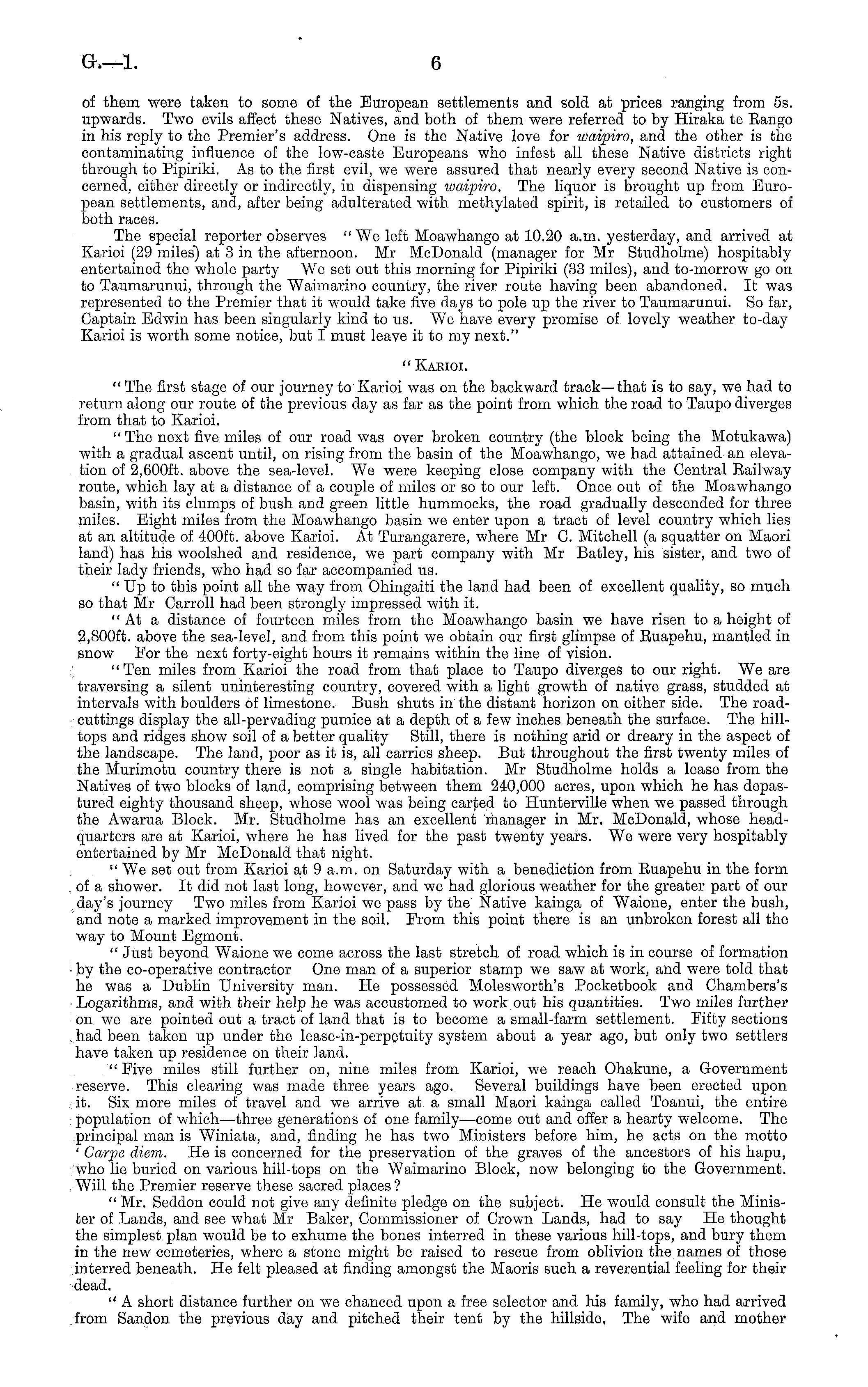 of them were taken to some of the European settlements and sold at prices ranging from ss. upwards. Two evils affect these Natives, and both of them were referred to by Hiraka te Eango in his reply to the Premier's address. One is the Native love for waipiro, and the other is the contaminating influence of the low-caste Europeans who infest all these Native districts right through to Pipiriki. As to the first evil, we were assured that nearly every second Native is concerned, either directly or indirectly, in dispensing waipiro. The liquor is brought up from European settlements, and, after being adulterated with methylated spirit, is retailed to customers of both races. The special reporter observes "We left Moawhango at 10.20 a.m. yesterday, and arrived at Karioi (29 miles) at 3in the afternoon. Mr McDonald (manager for Mr Studholme) hospitably entertained the whole party We set out this morning for Pipiriki (33 miles), and to-morrow go on to Taumarunui, through the Waimarino country, the river route having been abandoned. It was represented to the Premier that it would take five days to pole up the river to Taumarunui. So far, Captain Edwin has been singularly kind to us. We have every promise of lovely weather to-day Karioi is worth some notice, but I must leave it to my next." " Kaeioi. " The first stage of our journey to' Karioi was on the backward track—that is to say, we had to return along our route of the previous day as far as the point from which the road to Taupo diverges from that to Karioi. " The next five miles of our road was over broken country (the block being the Motukawa) with a gradual ascent until, on rising from the basin of the Moawhango, we had attained an elevation of 2,600 ft. above the sea-level. We were keeping close company with the Central Eailway route, which lay at a distance of a couple of miles or so to our left. Once out of the Moawhango basin, with its clumps of bush and green little hummocks, the road gradually descended for three miles. Eight miles from the Moawhango basin we enter upon a tract of level country which lies at an altitude of 400 ft. above Karioi. At Turangarere, where Mr C. Mitchell (a squatter on Maori land) has his woolshed and residence, we part company with Mr Batley, his sister, and two of their lady friends, who had so far accompanied us. " Up to this point all the way from Ohingaiti the land had been of excellent quality, so much so that Mr Carroll had been strongly impressed with it. "At a distance of fourteen miles from the Moawhango basin we have risen to a height of 2,800 ft. above the sea-level, and from this point we obtain our first glimpse of Buapehu, mantled in snow For the next forty-eight hours it remains within the line of vision. "Ten miles from Karioi the road from that place to Taupo diverges to our right. We are traversing a silent uninteresting country, covered with a light growth of native grass, studded at intervals with boulders of limestone. Bush shuts in the distant horizon on either side. The roadcuttings display the all-pervading pumice at a depth of a few inches beneath the surface. The hilltops and ridges show soil of a better quality Still, there is nothing arid or dreary in the aspect of the landscape. The land, poor as it is, all carries sheep. But throughout the first twenty miles of the Murimotu country there is not a single habitation. Mr Studholme holds a lease from the Natives of two blocks of land, comprising between them 240,000 acres, upon which he has depastured eighty thousand sheep, whose wool was being carted to Hunterville when we passed through the Awarua Block. Mr. Studholme has an excellent manager in Mr. McDonald, whose headquarters are at Karioi, where he has lived for the past twenty years. We were very hospitably entertained by Mr McDonald that night. " We set out from Karioi at 9 a.m. on Saturday with a benediction from Euapehu in the form of a shower. It did not last long, however, and we had glorious weather for the greater part of our day's journey Two miles from Karioi we pass by the Native kainga of Waione, enter the bush, and note a marked improvement in the soil. From this point there is an unbroken forest all the way to Mount Egmont. " Just beyond Waione we come across the last stretch of road which is in course of formation by the co-operative contractor One man of a superior stamp we saw at work, and were told that he was a Dublin University man. He possessed Molesworth's Pocketbook and Chambers's Logarithms, and with their help he was accustomed to work out his quantities. Two miles further on we are pointed out a tract of land that is to become a small-farm settlement. Fifty sections had been taken up under the lease-in-perpetuity system about a year ago, but only two settlers have taken up residence on their land. " Five miles still further on, nine miles from Karioi, we reach Ohakune, a Government reserve. This clearing was made three years ago. Several buildings have been erected upon it. Six more miles of travel and we arrive at a small Maori kainga called Toanui, the entire population of which-—three generations of one family—come out and offer a hearty welcome. The principal man is Winiata, and, finding he has two Ministers before him, he acts on the motto ' Garpe diem. He is concerned for the preservation of the graves of the ancestors of his hapu, who lie buried on various hill-tops on the Waimarino Block, now belonging to the Government. Will the Premier reserve these sacred places ? " Mr. Seddon could not give any definite pledge on the subject. He would consult the Minister of Lands, and see what Mr Baker, Commissioner of Crown Lands, had to say He thought the simplest plan would be to exhume the bones interred in these various hill-tops, and bury them in the new cemeteries, where a stone might be raised to rescue from oblivion the names of those interred beneath. He felt pleased at finding amongst the Maoris such a reverential feeling for their dea