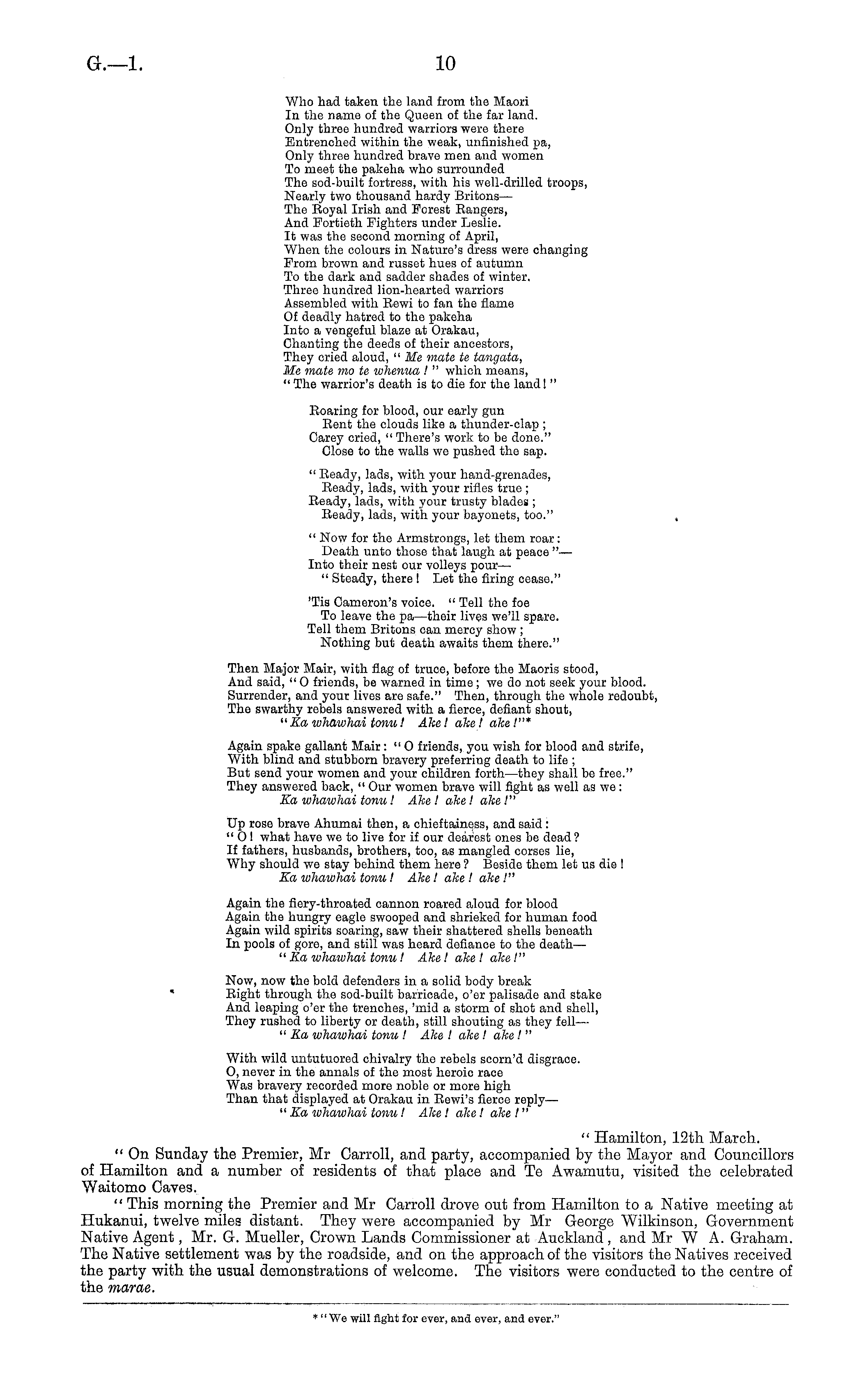 Who had taken the land from the Maori In the name of the Queen of the far land. Only three hundred warriors were there Entrenched within the weak, unfinished pa, Only three hundred brave men and women To meet the pakeha who surrounded The sod-built fortress, with his well-drilled troops, Nearly two thousand hardy Britons— The Royal Irish and Forest Eangers, And Fortieth Fighters under Leslie. It was the second morning of April, When the colours in Nature's dress were changing From brown and russet hues of autumn To the dark and sadder shades of winter. Three hundred lion-hearted warriors Assembled with Eewi to fan the flame Of deadly hatred to the pakeha Into a vengeful blaze at Orakau, Chanting the deeds of their ancestors, They cried aloud, " Me mate te tangata, Me mate mo te whenua ! " which means, " The warrior's death is to die for the land I " Roaring for blood, our early gun Rent the clouds like a thunder-clap ; Carey cried, " There's work to be done." Close to the walls we pushed the sap. " Ready, lads, with your hand-grenades, Ready, lads, with your rifles true ; Ready, lads, with your trusty blades ; Ready, lads, with your bayonets, too." " Now for the Armstrongs, let them roar: Death unto those that laugh at peace " — Into their nest our volleys pour— " Steady, there ! Let the firing cease." 'Tis Cameron's voice. " Tell the foe To leave the pa —their lives we'll spare. Tell them Britons can mercy show ; Nothing but death awaits them there." Then Major Mair, with flag of truce, before the Maoris stood, And said, " 0 friends, be warned in time ; we do not seek your blood. Surrender, and your lives are safe." Then, through the whole redoubt, The swarthy rebels answered with a fierce, defiant shout, "Kα whawhai tonu! Ake! ahe! ake !"* Again spake gallant Mair : " 0 friends, you wish for blood and strife, With blind and stubborn bravery preferring death to life ; But send your women and your children forth —they shall be free." They answered back, " Our women brave will fight as well as we: Kα whawhai tonu! Ake! ake! ake!" Up rose brave Ahumai then, a chieffcainess, and said : " 0 1 what have we to live for if our dearest ones be dead? If fathers, husbands, brothers, too, as mangled corses lie, Why should we stay behind them here ? Beside them let us die ! Kα whawhai tonu I Ahe! ake! ake!" Again the fiery-throated cannon roared aloud for blood Again the hungry eagle swooped and shrieked for human food Again wild spirits soaring, saw their shattered shells beneath In pools of gore, and still was heard defiance to the death— "Kα whawhai tonu! Ake! ake I ake!" Now, now the bold defenders in a solid body break Right through the sod-built barricade, o'er palisade and stake And leaping o'er the trenches, 'mid a storm of shot and shell, They rushed to liberty or death, still shouting as they fell — "Kα whawhai tonu ! Ake I ake ! ake I " With wild untutuored chivalry the rebels scorn'd disgrace. O, never in the annals of the most heroic race Was bravery recorded more noble or more high Than that displayed at Orakau in Rewi's fierce reply— " Kα whawhai tonu! Ake! ake I ake!" " Hamilton, 12th March. " On Sunday the Premier, Mr Carroll, and party, accompanied by the Mayor and Councillors of Hamilton and a number of residents of that place and Te Awamutu, visited the celebrated Waitomo Caves. " This morning the Premier and Mr Carroll drove out from Hamilton to a Native meeting at Hukanui, twelve miles distant. They were accompanied by Mr George Wilkinson, Government Native Agent, Mr. G. Mueller, Crown Lands Commissioner at Auckland , and Mr W A. Graham. The Native settlement was by the roadside, and on the approach of the visitors the Natives received the party with the usual demonstrations of welcome. The visitors were conducted to the centre of the marae.