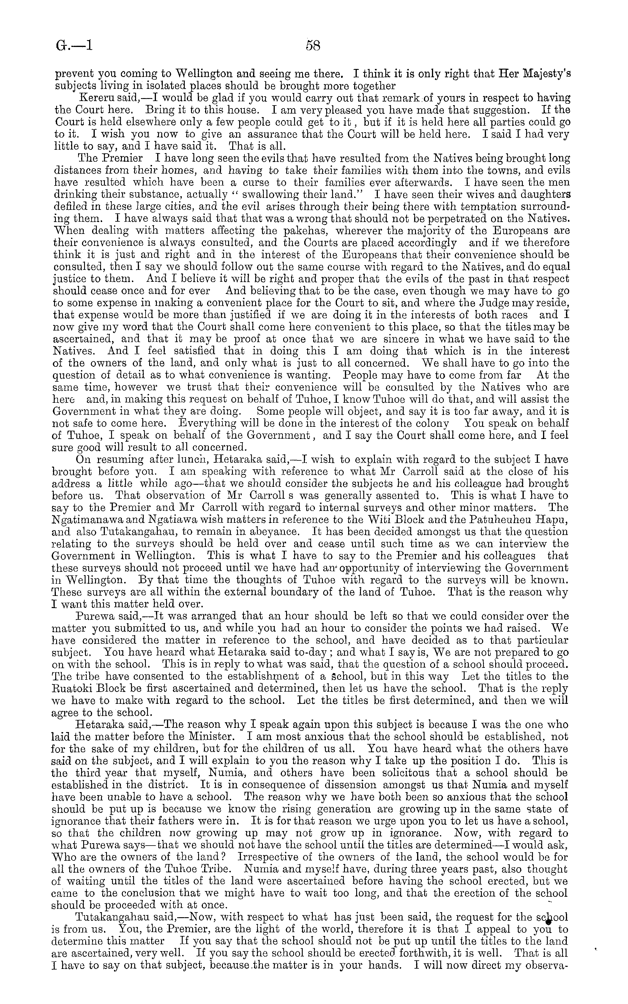 prevent you coming to Wellington and seeing me there. I think it is only right that Her Majesty's subjects living in isolated places should be brought more together Kereru said, —I would be glad if you would carry out that remark of yours in respect to having the Court here. Bring it to this house. lam very pleased you have made that suggestion. If the Court is held elsewhere only a few people could get to it, but if it is held here all parties could go to it. I wish you now to give an assurance that the Court will be held here. I said I had very little to say, and I have said it. That is all. The Premier I have long seen the evils that have resulted from the Natives being brought long distances from their homes, and having to take their families with them into the towns, and evils have resulted which have been a curse to their families ever afterwards. I have seen the men drinking their substance, actually " swallowing their land." I have seen their wives and daughters defiled in these large cities, and the evil arises through their being there with temptation surrounding them. I have always said that that was a wrong that should not be perpetrated on the Natives. When dealing with matters affecting the pakehas, wherever the majority of the Europeans are their convenience is always consulted, and the Courts are placed accordingly and if we therefore think it is just and right and in the interest of the Europeans that their convenience should be consulted, then I say we should follow out the same course with regard to the Natives, and do equal justice to them. And I believe it will be right and proper that the evils of the past in that respect should cease once and for ever And believing that to be the case, even though we may have to go to some expense in making a convenient place for the Court to sit, and where the Judge may reside, that expense would be more than justified if we are doing it in the interests of both races and I now give my word that the Court shall come here convenient to this place, so that the titles may be ascertained, and that it may be proof at once that we are sincere in what we have said to the Natives. And I feel satisfied that in doing this I am doing that which is in the interest of the owners of the land, and only what is just to all concerned. We shall have to go into the question of detail as to what convenience is wanting. People may have to come from far At the same time, however we trust that their convenience will be consulted by the Natives who are here and, in making this request on behalf of Tuhoe, I know Tuhoe will do that, and will assist the Government in what they are doing. Some people will object, and say it is too far away, and it is not safe to come here. Everything will be done in the interest of the colony You speak on behalf of Tuhoe, I speak on behalf of the Government, and I say the Court shall come here, and I feel sure good will result to all concerned. On resuming after lunch, Hetaraka said, —I wish to explain with regard to the subject I have brought before you. I am speaking with reference to what Mr Carroll said at the close of his address a little while ago—that we should consider the subjects he and his colleague had brought before us. That observation of Mr Carroll s was generally assented to. This is what I have to say to the Premier and Mr Carroll with regard to internal surveys and other minor matters. The Ngatimanawa and Ngatiawa wish matters in reference to the Witi Block and the Patuheuheu Hapu, and also Tutakangahau, to remain in abeyance. It has been decided amongst us that the question relating to the surveys should be held over and cease until such time as we can interview the Government in Wellington. This is what I have to say to the Premier and his colleagues that these surveys should not proceed until we have had an opportunity of interviewing the Government in Wellington. By that time the thoughts of Tuhoe with regard to the surveys will be known. These surveys are all within the external boundary of the land of Tuhoe. That is the reason why I want this matter held over. Purewa said, —It was arranged that an hour should be left so that we could consider over the matter you submitted to us, and while you had an hour to consider the points we had raised. We have considered the matter in reference to the school, and have decided as to that particular subject. You have heard what Hetaraka said to-day ; and what I say is, We are not prepared to go on with the school. This is in reply to what was said, that the question of a school should proceed. The tribe have consented to the establishment of a school, but in this way Let the titles to the Euatoki Block be first ascertained and determined, then let us have the school. That is the reply we have to make with regard to the school. Let the titles be first determined, and then we will agree to the school. Hetaraka said, —The reason why I speak again upon this subject is because I was the one who laid the matter before the Minister. lam most anxious that the school should be established, not for the sake of my children, but for the children of us all. You have heard what the others have said on the subject, and I will explain to you the reason why I take up the position I do. This is the third year that myself, Numia, and others have been solicitous that a school should be established in the district. It is in consequence of dissension amongst us that Numia and myself have been unable to have a school. The reason why we have both been so anxious that the school should be put up is because we know the rising generation are growing up in the same state of ignorance that their fathers were in. It is for that reason we urge upon you to let us have a school, so that the children now growing up may not grow up in ignorance. Now, with regard to what Purewa says —that we should not have the school until the titles are determined—l would ask, Who are the owners of t