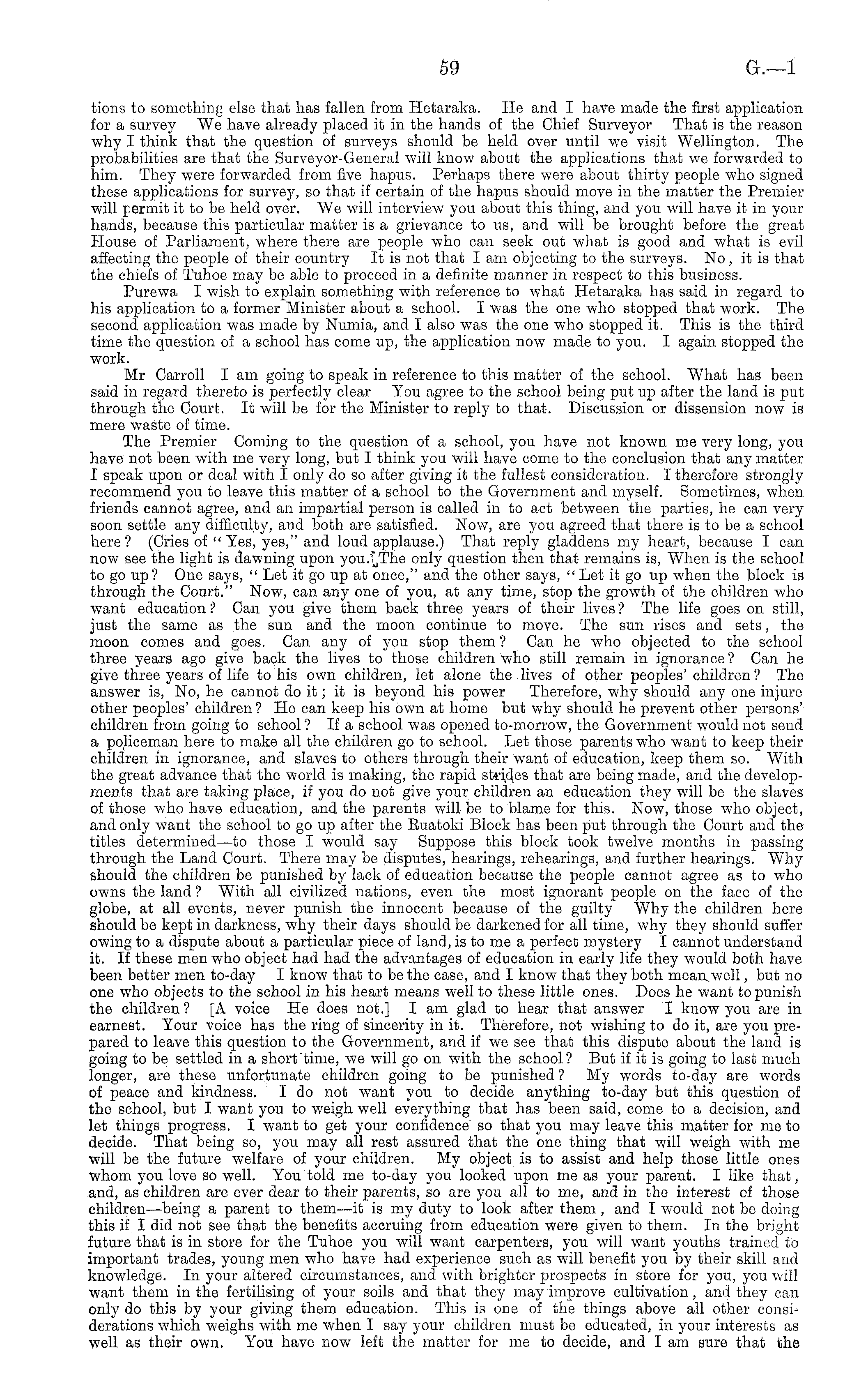 tions to something else that has fallen from Hetaraka. He and I have made the first application for a survey We have already placed it in the hands of the Chief Surveyor That is the reason why I think that the question of surveys should be held over until we visit Wellington. The probabilities are that the Surveyor-General will know about the applications that we forwarded to him. They were forwarded from five hapus. Perhaps there were about thirty people who signed these applications for survey, so that if certain of the hapus should move in the matter the Premier will permit it to be held over. We will interview you about this thing, and you will have it in your hands, because this particular matter is a grievance to us, and will be brought before the great House of Parliament, where there are people who can seek out what is good and what is evil affecting the people of their country It is not that lam objecting to the surveys. No, it is that the chiefs of Tuhoe may be able to proceed in a definite manner in respect to this business. Purewa I wish to explain something with reference to what Hetaraka has said in regard to his application to a former Minister about a school. I was the one who stopped that work. The second application was made by Numia, and I also was the one who stopped it. This is the third time the question of a school has come up, the application now made to you. I again stopped the work. Mr Carroll I am going to speak in reference to this matter of the school. What has been said in regard thereto is perfectly clear You agree to the school being put up after the land i 3 put through the Court. It will be for the Minister to reply to that. Discussion or dissension now is mere waste of time. The Premier Coming to the question of a school, you have not known me very long, you have not been with me very long, but I think you will have come to the conclusion that any matter I speak upon or deal with I only do so after giving it the fullest consideration. I therefore strongly recommend you to leave this matter of a school to the Government and myself. Sometimes, when friends cannot agree, and an impartial person is called in to act between the parties, he can very soon settle any difficulty, and both are satisfied. Now, are you agreed that there is to be a school here? (Cries of "Yes, yes," and loud applause.) That reply gladdens my heart, because I can now see the light is dawning upon only question then that remains is, When is the school to go up? One says, " Let it go up at once," and the other says, " Let it go up when the block is through the Court." Now, can any one of you, at any time, stop the growth of the children who want education ? Can you give them back three years of their lives ? The life goes on still, just the same as the sun and the moon continue to move. The sun rises and sets, the moon comes and goes. Can any of you stop them ? Can he who objected to the school three years ago give back the lives to those children who still remain in ignorance ? Can he give three years of life to his own children, let alone the lives of other peoples'children? The answer is, No, he cannot do it; it is beyond his power Therefore, why should any one injure other peoples' children ? He can keep his own at home but why should he prevent other persons' children from going to school ? If a school was opened to-morrow, the Government would not send a policeman here to make all the children go to school. Let those parents who want to keep their children in ignorance, and slaves to others through their want of education, keep them so. With the great advance that the world is making, the rapid strides that are being made, and the developments that are taking place, if you do not give your children an education they will be the slaves of those who have education, and the parents will be to blame for this. Now, those who object, and only want the school to go up after the Euatoki Block has been put through the Court and the titles determined—to those I would say Suppose this block took twelve months in passing through the Land Court. There may be disputes, hearings, rehearings, and further hearings. Why should the children be punished by lack of education because the people cannot agree as to who owns the land ? With all civilized nations, even the most ignorant people on the face of the globe, at all events, never punish the innocent because of the guilty Why the children here should be kept in darkness, why their days should be darkened for all time, why they should suffer owing to a dispute about a particular piece of land, is to me a perfect mystery I cannot understand it. If these men who object had had the advantages of education in early life they would both have been better men to-day I know that to be the case, and I know that they both mean, well, but no one who objects to the school in his heart means well to these little ones. Does he want to punish the children? [A voice He does not.] I am glad to hear that answer I know you are in earnest. Your voice has the ring of sincerity in it. Therefore, not wishing to do it, are you prepared to leave this question to the Government, and if we see that this dispute about the land is going to be settled in a short time, we will go on with the school ? But if it is going to last much longer, are these unfortunate children going to be punished ? My words to-day are words of peace and kindness. Ido not want you to decide anything to-day but this question of the school, but I want you to weigh well everything that has been said, come to a decision, and let things progress. I want to get your confidence so that you may leave this matter for me to decide. That being so, you may all rest assured that the one thing that will weigh with me will be the future welfare of your children. My object is to assist and help those little ones whom you love so well. You told me to-day you looked upon me as your parent. I like that, and, as childr