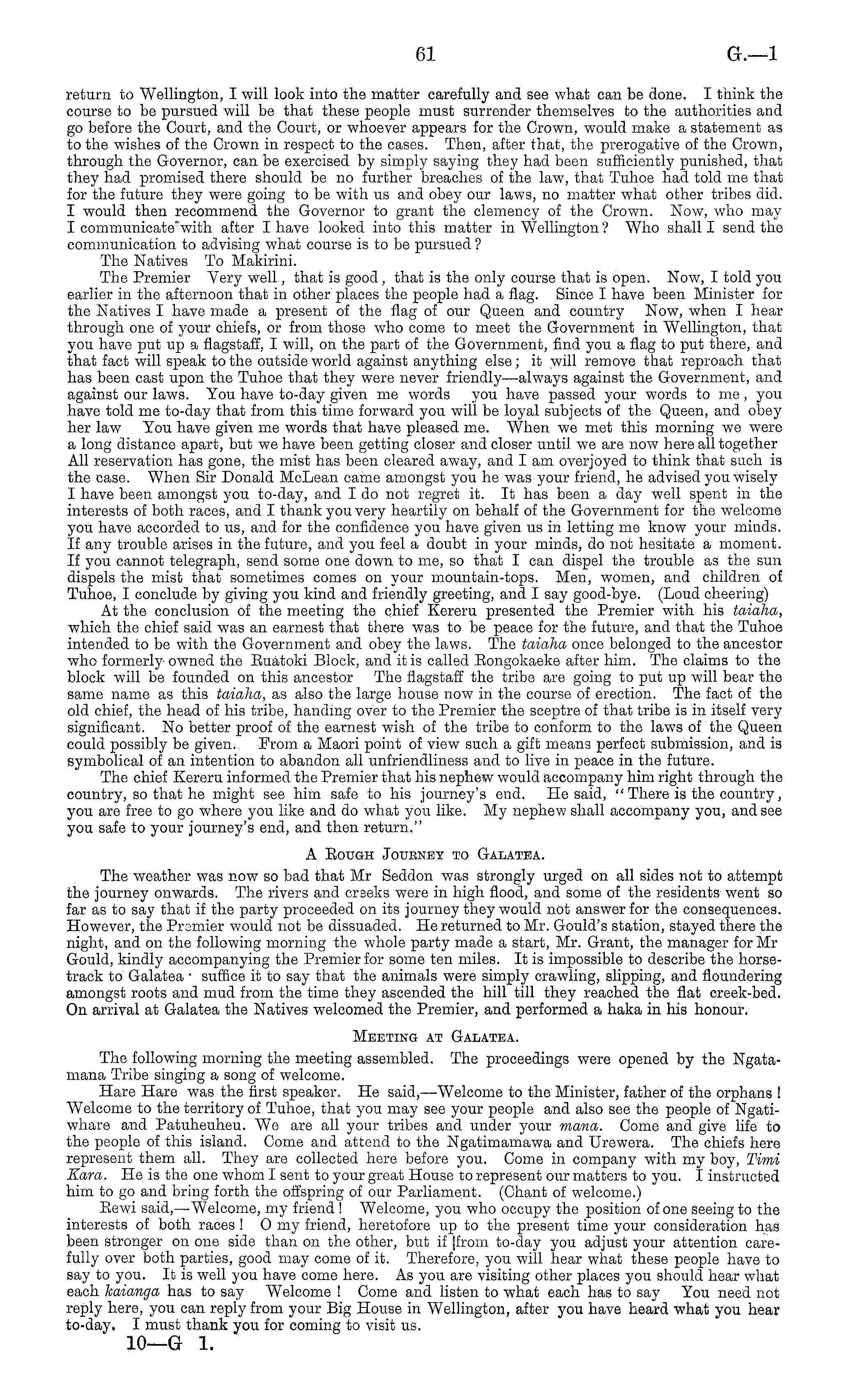 return to Wellington, I will look into the matter carefully and see what can be done. I think the course to be pursued will be that these people must surrender themselves to the authorities and go before the Court, and the Court, or whoever appears for the Crown, would make a statement as to the wishes of the Crown in respect to the cases. Then, after that, the prerogative of the Crown, through the Governor, can be exercised by simply saying they had been sufficiently punished, that they had promised there should be no further breaches of the law, that Tuhoe had. told me that for the future they were going to be with us and obey our laws, no matter what other tribes did. I would then recommend the Governor to grant the clemency of the Crown. Now, who may I communicate*with after I have looked into this matter in Wellington ? Who shall I send the communication to advising what course is to be pursued ? The Natives To Makirini. The Premier Very well, that is good, that is the only course that is open. Now, I told you earlier in the afternoon that in other places the people had a flag. Since I have been Minister for the Natives I have made a present of the flag of our Queen and country Now, when I hear through one of your chiefs, or from those who come to meet the Government in Wellington, that you have put up a flagstaff, I will, on the part of the Government, find you a flag to put there, and that fact will speak to the outside world against anything else; it will remove that reproach that has been cast upon the Tuhoe that they were never friendly—always against the Government, and against our laws. You have to-day given me words you have passed your words to me , you have told me to-day that from this time forward you will be loyal subjects of the Queen, and obey her law You have given me words that have pleased me. When we met this morning we were a long distance apart, but we have been getting closer and closer until we are now here all together All reservation has gone, the mist has been cleared away, and I am overjoyed to think that such is the case. When Sir Donald McLean came amongst you he was your friend, he advised you wisely I have been amongst you to-day, and Ido not regret it. It has been a day well spent in the interests of both races, and I thank you very heartily on behalf of the Government for the welcome you have accorded to us, and for the confidence you have given us in letting me know your minds. If any trouble arises in the future, and you feel a doubt in your minds, do not hesitate a moment. If you cannot telegraph, send some one down to me, so that I can dispel the trouble as the sun dispels the mist that sometimes comes on your mountain-tops. Men, women, and children of Tuhoe, I conclude by giving you kind and friendly greeting, and I say good-bye. (Loud cheering) At the conclusion of the meeting the chief Kereru presented the Premier with his taiaha, which the chief said was an earnest that there was to be peace for the future, and that the Tuhoe intended to be with the Government and obey the laws. The taiaha once belonged to the ancestor who formerly owned the Euatoki Block, and it is called Eongokaeke after him. The claims to the block will be founded on this ancestor The flagstaff the tribe are going to put up will bear the same name as this taiaha, as also the large house now in the course of erection. The fact of the old chief, the head of his tribe, handing over to the Premier the sceptre of that tribe is in itself very significant. No better proof of the earnest wish of the tribe to conform to the laws of the Queen could possibly be given. From a Maori point of view such a gift means perfect submission, and is symbolical of an intention to abandon all unfriendliness and to live in peace in the future. The chief Kereru informed the Premier that his nephew would accompany him right through the country, so that he might see him safe to his journey's end. He said, " There is the country, you are free to go where you like and do what you like. My nephew shall accompany you, and see you safe to your journey's end, and then return." A Bough Jouenby to Galatea. The weather was now so bad that Mr Seddon was strongly urged on all sides not to attempt the journey onwards. The rivers and creeks were in high flood, and some of the residents went so far as to say that if the party proceeded on its journey they would not answer for the consequences. However, the Prsmier would not be dissuaded. He returned to Mr. Gould's station, stayed there the night, and on the following morning the whole party made a start, Mr. Grant, the manager for Mr Gould, kindly accompanying the Premier for some ten miles. It is impossible to describe the horsetrack to Galatea ■ suffice it to say that the animals were simply crawling, slipping, and floundering amongst roots and mud from the time they ascended the hill till they reached the flat creek-bed. On arrival at Galatea the Natives welcomed the Premier, and performed a haka in his honour. Meeting at Galatea. The following morning the meeting assembled. The proceedings were opened by the Ngatamana Tribe singing a song of welcome. Hare Hare was the first speaker. He said, —Welcome to the Minister, father of the orphans ! Welcome to the territory of Tuhoe, that you may see your people and also see the people of Ngatiwhare and Patuheuheu. We are all your tribes and under your mana. Come and give life to the people of this island. Come and attend to the Ngatimamawa and Urewera. The chiefs here represent them all. They are collected here before you. Come in company with my boy, Tirfrm Kara, He is the one whom I sent to your great House to represent our matters to you. I instructed him to go and bring forth the offspring of our Parliament. (Chant of welcome.) Kewi said, —Welcome, my friend ! Welcome, you who occupy the position of one seeing to the interests of both races ! 0 my friend, heretofore up to the present time your consideratio