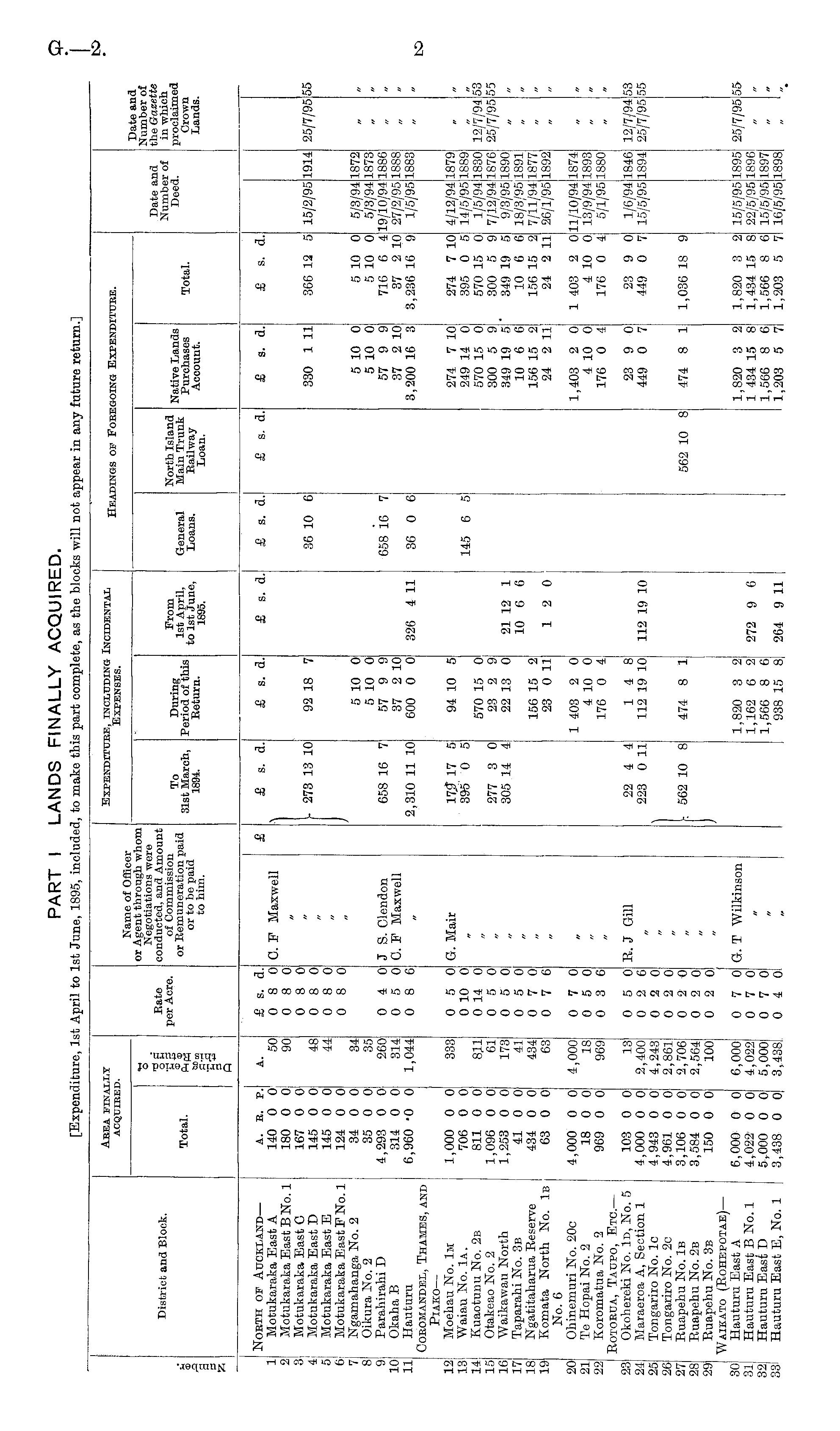 Aeea fina acquire: jLY sxpendituee, including incidental Expenses. Headings op Foeegoing Expendituee. District and Block. o If q Bate per Acre. or Agent through whom Negotiations were conducted, and Amount of Commission or Remuneration paid or to be paid to him. Date and Number of Deed. Date and Number of the Gazette in "which proclaimed Crown Lands. I Total. To 31st March, 1894. During Period of this Return. From 1st April, to 1st June, 1895. General Loans. North Island Main Trunk Railway Loan. Native Lands Purchases Account. Total. 1 3 1 4 5 6' 8 9 10i 11 12' 13 15 16 17 18 19 Noeth of Auckland — Motukaraka East A Motukaraka East B No. 1 Motukaraka East C Motukaraka East D Motukaraka East E Motukaraka East F No. 1 Ngarnahanga No. 2 Oikura No. 2 Parahiraki D Okaha B Hauturu COEOMANDEL, THAMES, AHD PlAKO — Moehau No. Iμ Waiau No. Iα. Kuaoturm No. 2b Otakeao No. 2 Waikawau North Taparahi No. 3b Ngatitaharua Eeserve Komata North No. Iβ No. 6 Ohinemuri No. 20c Te Hopai No. 2 Koromatua No. 2 Eotobua, Taupo, Etc. — Okohereki No. Id, No. 5 Maraeroa A, Section 1 Tongariro No. lc Tongariro No. 2c Euapehu No. Iβ Euapehu No. 2b Euapehu No. 3b Waikato (Bohepotae) — Hauturu East A Hauturu East B No. 1 Hauturu East D Hauturu East E, No. 1 A. B. P. 140 0 0 180 0 0 167 0 0 145 0 0 145 0 0 124 0 0 34 0 0 35 0 0 4,293 0 0 314 0 0 ! 6,960 -0 0 1,000 0 0 706 0 0 1 811 0 0i 1,096 0 0 1,253 0 0 41 0 0 434 0 0 63 0 0 A. 50 90 48 44 34 35 260 314 1,044 333j 811 61 173 41 434 63 £ s. a. 0 8 0 0 8 0 0 8 0 0 8 0 0 8 0 0 8 0 0 4 0 0 5 0 0 8 6 0 5 0 0 10 0 0 14 0 0 5 0 0 5 0 0 5 0 0 7 0 0 7 6 C. F Maxwell J S. Clendon 0. F Maxwell G. Mair £ s. a. I 273 13 10 658 16 7 2,310 11 10 17.? 17 5 395 0 5 277 3 0 305 14 4 £ s. a. 92 18 7 5 10 0 5 10 0 57 9 9 37 2 10 600 0 0 94 10 5 570 15 0 23 2 9 22 13 0 326 4 11 21 12 1 10 6 6 £ s. d. £ s. a. 36 10 6 658 16 7 36 0 6 145 6 5 £ s. a. s s. a. 330 1 11 5 10 0 5 10 0 57 9 9 37 2 10 3,200 16 3 274 7 10 249 14 0 570 15 0 300 5 9 349 19 5 10 6 6 156 15 2 24 2 Hi £ s. d. 366 12 5 5 10 0 5 10 0 716 6 4 37 2 10 3,236 16 9 274 7 10 395 0 5 570 15 0 300 5 9 349 19 5 10 6 6 156 15 2 24 2 11 15/2/95 5/3/94 5/3/94 19/10/94 27/2/95 1/5/95 4/12/94 14/5/95 1/5/94 7/12/94 9/3/95 18/3/95 7/11/94 26/1/95 1872 1873! 1886! 18881 1883 !l879 18S9 1830 1876 1890 1891 1877 1892 1914 25/7/95 12/7/94 25/7/95 5*8 55 156 15 2 23 0 11 12 0 20 21 22 4,000 0 0 18 0 0 969 0 0 4,000 18 969 0 7 0 0 5 0 0 3 6 1 403 2 0 4 10 0 176 0 4 1,403 2 0 4 10 0 176 0 4 1 403 2 0 4 10 0 176 0 4 11/10/94 13/9/94 5/1/95 1874 1893 1880 23 24 25 26 27 28 29 103 0 0 4,000 0 0 4,943 0 0 4,961 0 0 3,106 0 0 3,584 0 0 150 0 0 13 2,400 4,243 2,86ll 2,706| 2,564| 1001 0 5 0 0 2 6 0 2 0 0 2 0 0 2 0 0 2 0 0 2 0 B. J Gill 22 4 4 223 0 11 [■. 562 10 8 14 8 112 19 10 474 8 1 112 19 10 23 9 0 449 0 7 474 8 1 23 9 0 449 0 7 1,036 18 9 1/6/94 15/5/95 1846 1894 12/7/94 25/7/95 5; 51 562 10 8 30 31 32 33 6,000 0 0 4,022 0 0 5,000 0 0 3,438 0 0 6,OOo[ 4,022 5,000 3,438i 0 7 0 0 7 0 0 7 0 0 4 0 G. T Wilkinson 1,820 3 2 1,162 6 2 1,566 8 6 938 15 8 272 9 6 1,820 3 2 1 434 15 8 1,566 8 6 1,203 5 7 1,820 3 2 1,434 15 8 1,566 8 6 1,203 5 7 15/5/95 22/5/95 15/5/95 16/5/95 1895 1896 1897 1898 25/7/95 55 264 9 11 '»