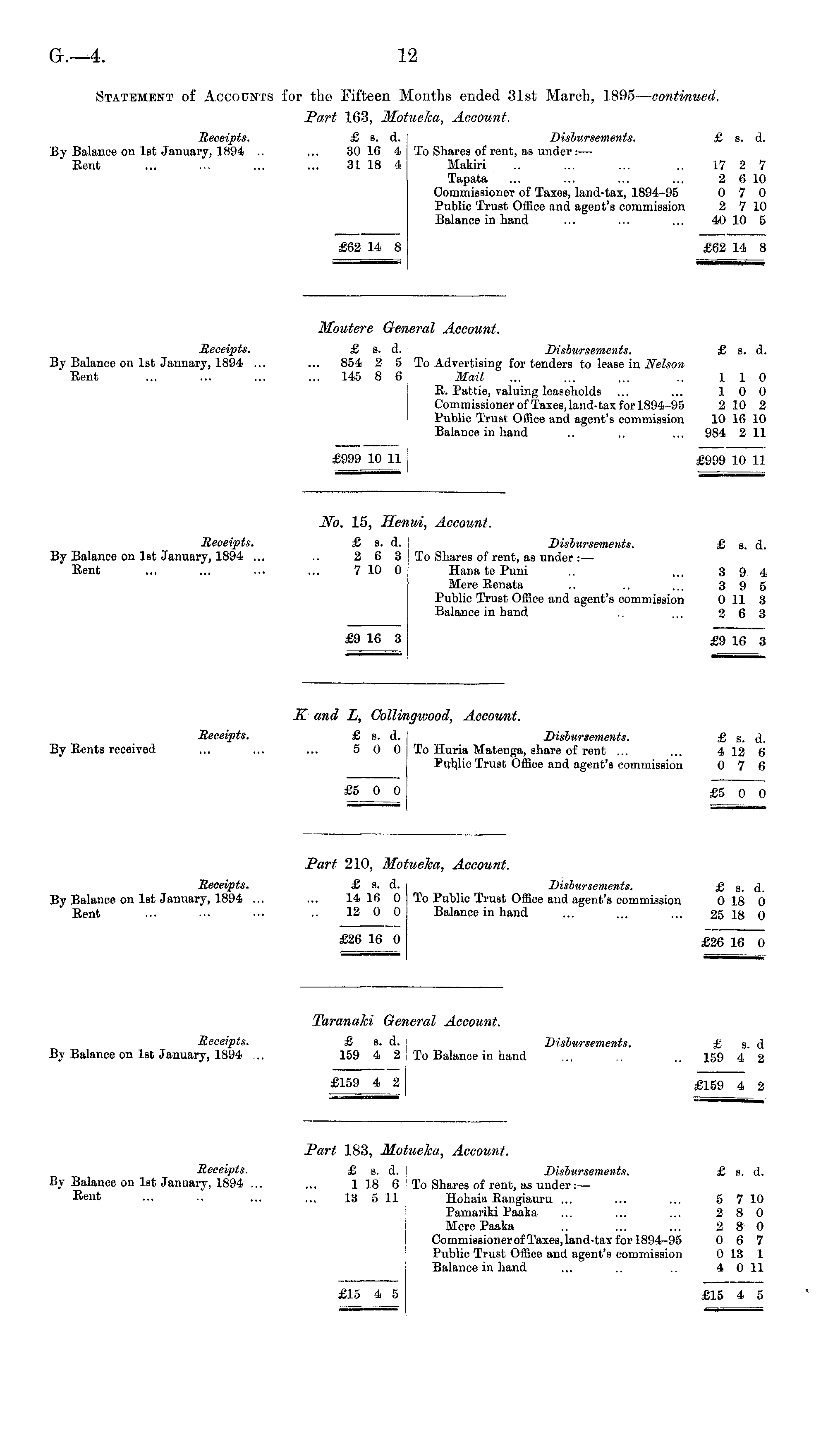 X and L, Collingwood, Account. Receipts. £ s. d. Disbursements. £ s. d. By Rents received ... ... ... 5 0 0 To Huria Matenga, share of rent ... ... 4 12 6 Public Trust Office and agent's commission 0 7 6 £5 0 0 £5 0 0