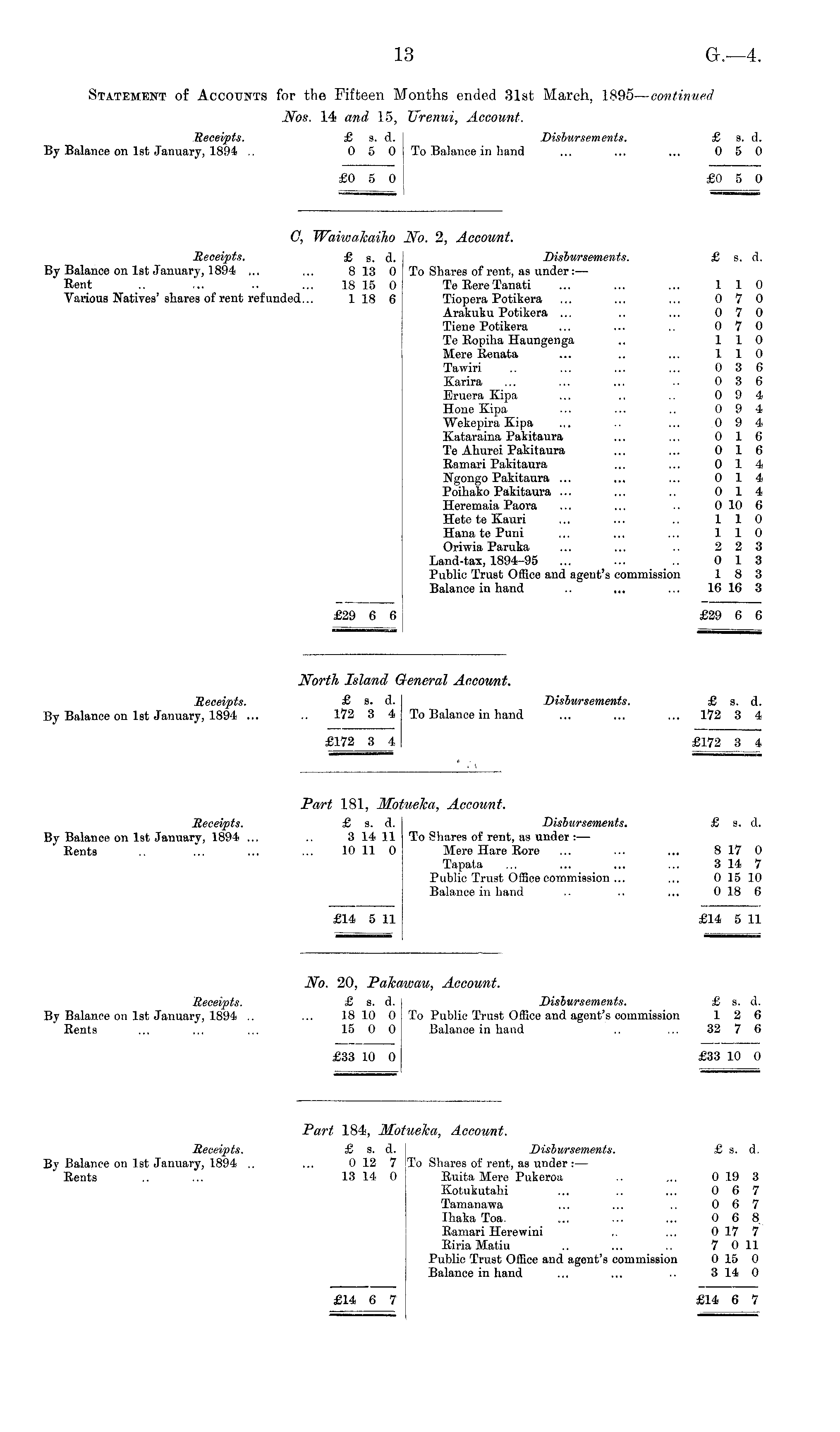 Part 184, Motueka, Account. Receipts. £ s. d. Disbursements. £ s. d. By Balance on Ist January, 1894 .. ... 0 12 7 To Shares of rent, as under : — Rents .. ... 13 14 0 Ruita Mere Pukeroa .. ... 0 19 3 Kotukutahi ... .. ... 0 6 7 Tamanawa ... ... .. 0 6 7 Ihaka Toa. ... ... ... 0 6 8 Ramari Herewini .. ... 0 17 7 Riria Matiu .. ... .. 7 0 11 Public Trust Office and agent's commission 0 15 0 Balance in hand ... ... .. 3 14 0 £14 6 7 £14 6 7