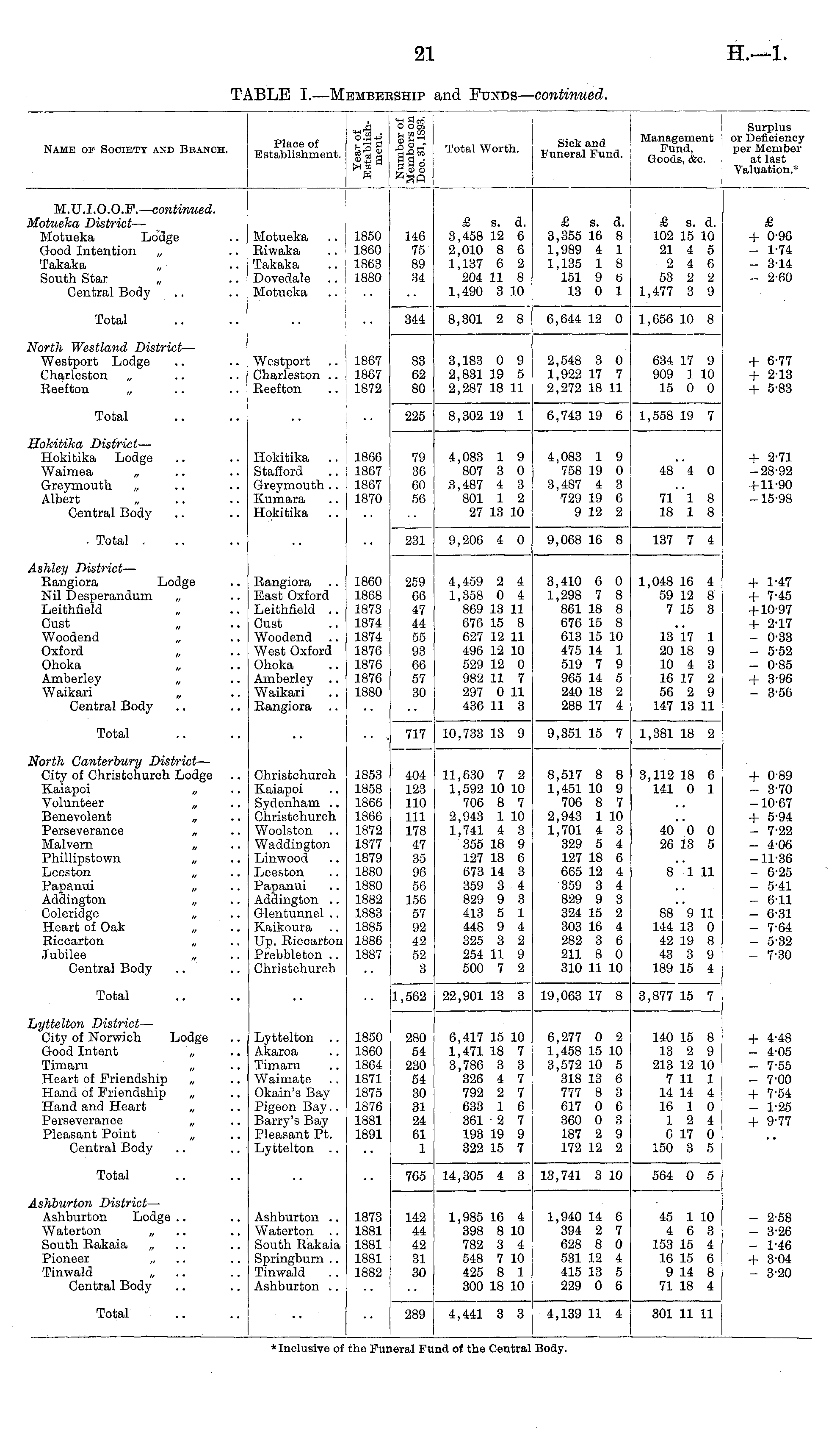 Name of Society and Branch. Place of Establishment. III H gad Total Worth. Fn Zi?^ Dd . Surplus Management or Deficiency Fund, per Member Goods, &c. at last Valuation.* M.U.I.O.O.F.— continued, lotueha District — Motueka Lodge Good Intention „ Takaka South Star Central Body Motueka Riwaka Takaka Dovedale Motueka 1850 1860 1863 1880 146 75 89 34 £ s. d. 3,458 12 6 2,010 8 6 1,137 6 2 204 11 8 1,490 3 10 £ s. d. 3,355 16 8 1,989 4 1 1,135 1 8 151 9 6 13 0 1 £ s. d. 102 15 10 21 4 5 2 4 6 53 2 2 1,477 3 9 & + 0-96 - 1-74 - 3-14 - 2-60 Total 344 8,301 2 8 6,644 12 0 1,656 10 8 + 6-77 + 2-13 + 5-83 r orth Westland District — Westport Lodge Charleston „ Reefton „ Westport Charleston .. Reefton 1867 1867 1872 83 G2 80 3,183 0 9 2,831 19 5 2,287 18 11 2,548 3 0 1,922 17 7 2,272 18 11 634 17 9 909 1 10 15 0 0 Total 225 8,302 19 1 6,743 19 6 1,558 19 7 Tokitika District — Hokitika Lodge Waimea „ Greymouth „ Albert Central Body Hokitika Stafford Greymouth .. Kumara Hokitika 1866 1867 1867 1870 79 36 60 56 4,083 1 9 807 3 0 3,487 4 3 801 1 2 27 13 10 4,083 1 9 758 19 0 3,487 4 3 729 19 6 9 12 2 48 4 0 7l"l 8 18 1 8 + 2-71 -28-92 + 11-90 -15-98 . Total . 231 9,206 4 0 9,068 16 8 137 7 4 + 1-47 + 7-45 + 10-97 + 2-17 - 0-33 - 5-52 - 0-85 + 3-96 - 3-56 .shley District — Rangiora Lodge Nil Desperandum „ Leithfield „ Oust Woodend „ Oxford Ohoka „ Amberley „ Waikari Central Body Rangiora East Oxford Leithfield .. Cust Woodend West Oxford Ohoka Amberley Waikari Rangiora 1860 1868 1873 1874 1874 1876 1876 1876 1880 259 66 47 44 55 93 66 57 30 4,459 2 4 1,358 0 4 869 13 11 676 15 8 627 12 11 496 12 10 529 12 0 982 11 7 297 0 11 436 11 3 3,410 6 0 1,298 7 8 861 18 8 676 15 8 613 15 10 475 14 1 519 7 9 965 14 5 240 18 2 288 17 4 1,048 16 4 59 12 8 7 15 3 13 17 1 20 18 9 10 4 3 16 17 2 56 2 9 147 13 11 Total 717 10,733 13 9 9,351 15 7 1,381 18 2 forth Canterbury District — City of Chris tchurch Lodge Kaiapoi „ Volunteer „ Benevolent „ Perseverance „ Malvern „ Phillipstown „ Leeston Papanui „ Addington „ Coleridge „ Heart of Oak „ Biooarton „ Jubilee „ Central Body Christchurch Kaiapoi Sydenham .. Christchurch Woolston Waddington Linwood Leeston Papanui Addington .. Glentunnel .. Kaikoura .. Up. Riccarton Prebbleton .. Christehurch 1853 1858 1866 1866 1872 1877 1879 1880 1880 1882 1883 1885 1886 1887 404 123 110 111 178 47 35 96 56 156 57 92 42 52 3 11,630 7 2 1,592 10 10 706 8 7 2,943 1 10 1,741 4 3 355 18 9 127 18 6 673 14 3 359 3 4 829 9 3 413 5 1 448 9 4 325 3 2 254 11 9 500 7 2 8,517 8 8 1,451 10 9 706 8 7 2,943 1 10 1,701 4 3 329 5 4 127 18 6 665 12 4 359 3 4 829 9 3 324 15 2 303 16 4 282 3 6 211 8 0 310 11 10 3,112 18 6 141 0 1 40 0 0 26 13 5 8 1 11 + 0-89 - 3-70 -10-67 + 5-94 - 7-22 - 4-06 -11-36 - 6-25 - 5-41 - 6-11 - 6-31 - 7-64 - 5-32 - 7-30 88 9 11 144 13 0 42 19 8 43 3 9 189 15 4 Total 1,562 22,901 13 3 19,063 17 8 3,877 15 7 lyttelton District — City of Norwich Lodge Good Intent „ Timaru „ Heart of Friendship „ Hand of Friendship „ Hand and Heart „ Perseverance „ Pleasant Point „ Central Body Lyttelton Akaroa Timaru Waimate Okain's Bay Pigeon Bay.. Barry's Bay Pleasant Pt. Lyttelton .. 1850 1860 1864 1871 1875 1876 1881 1891 280 54 230 54 30 31 24 61 1 6,417 15 10 1,471 18 7 3,786 3 3 326 4 7 792 2 7 633 1 6 361 2 7 193 19 9 322 15 7 6,277 0 2 1,458 15 10 3,572 10 5 318 13 6 777 8 3 617 0 6 360 0 3 187 2 9 172 12 2 140 15 8 13 2 9 213 12 10 7 11 1 14 14 4 16 1 0 12 4 6 17 0 150 3 5 + 4-48 - 4-05 - 7-55 - 7-00 + 7-54 - 1-25 + 9-77 ■■ Total 765 14,305 4 3 13,741 3 10 564 0 5 '.sKburton District — Ashburton Lodge .. Wafcerton „ South Rakaia „ Pioneer Tinwald „ Central Body Ashburton .. Waterton South Rakaia Springburn .. Tinwald Ashburton .. 1873 1881 1881 1881 1882 142 44 42 31 30 1,985 16 4 398 8 10 782 3 4 548 7 10 425 8 1 300 18 10 1,940 14 6 394 2 7 628 8 0 531 12 4 415 13 5 229 0 6 45 1 10 4 6 3 153 15 4 16 15 6 9 14 8 71 18 4 - 2-58 - 3-26 - 1-46 + 3-04 - 3-20 Total 4,441 3 3 4,139 11 4 301 11 11 289 * Inclusive of the Funeral Fund of the Central Bod;