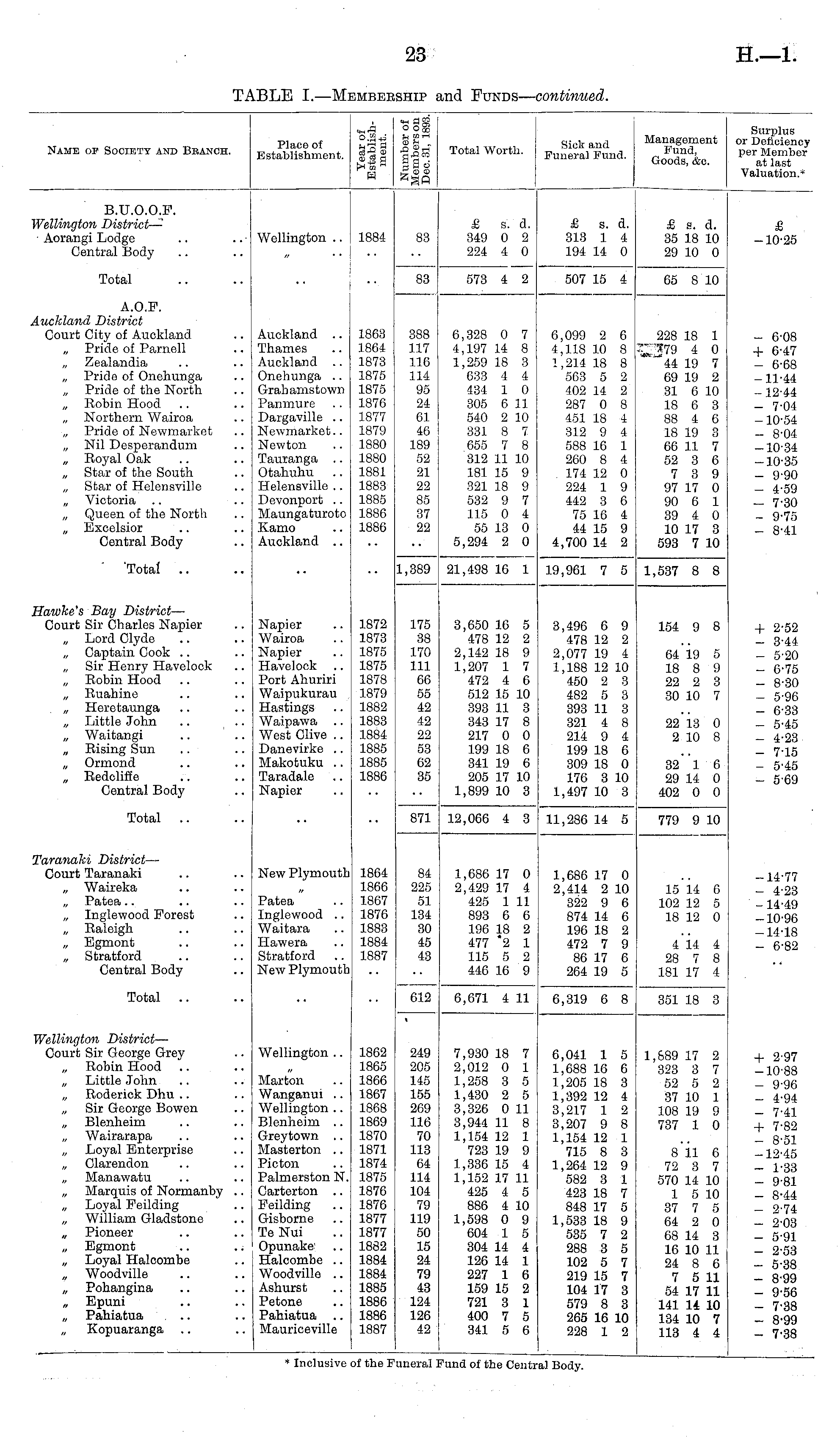 Name or Society and Branch. Place of Establishment. ■sjL III H j Surplus 8 E 1 si.,1. „„/> Management or Deficiency ||d Total Wort,, per Member Valuation.* B.U.O.O.F. Wellington District— Aorangi Lodge Central Body Wellington .. i 1884 83 £ s. d. 349 0 2 224 4 0 £ s. d. 313 1 4 194 14 0 £ s. d. 35 18 10 29 10 0 -10-25 Total •■ 83 573 4 2 507 15 4 65 8 10 A.O.F. Auckland District Court City of Auckland „ Pride of Parnell „ Zealandia „ Pride of Onehunga „ Pride of the North „ Robin Hood „ Northern Wairoa „ Pride of Newmarket „ Nil Desperandum „ Royal Oak „ Star of the South „ Star of Helensville „ Victoria „ Queen of the North „ Excelsior Central Body 1 j - 6-08 + 6-47 - 6-68 -11-44 -12-44 - 7-04 -10-54 - 8-04 -10-34 -10-35 - 9-90 - 4-59 - 7-30 - 9-75 - 8-41 Auckland .. Thames Auckland Onehunga .. Grahams town Panmure Dargaville .. Newmarket.. Newton Tauranga Otahuhu Helensville .. Devonport .. Maungaturoto Kamo Auckland .. 1863 1864 1873 1875 1875 1876 1877 1879 1880 1880 1881 1883 1885 1886 1886 388 117 116 I 114 I 95 24 61 46 189 52 21 22 85 37 22 6,328 0 7 4,197 14 8 ! 1,259 18 3 633 4 4 434 1 0 305 6 11 540 2 10 331 8 7 655 7 8 312 11 10 181 15 9 321 18 9 532 9 7 115 0 4 55 13 0 5,294 2 0 6,099 2 6 4,118 10 8 1,214 18 8 563 5 2 402 14 2 287 0 8 451 18 4 312 9 4 588 16 1 260 8 4 174 12 0 224 1 9 442 8 6 75 16 4 44 15 9 4,700 14 2 228 18 1 5379 4 0 44 19 7 69 19 2 31 6 10 18 6 3 88 4 6 18 19 3 66 11 7 52 3 6 7 3 9 97 17 0 90 6 1 39 4 0 10 17 3 593 7 10 'Total .. 1,389 21,498 16 1 19,961 7 5 1,537 8 8 Hawke's Bay District — Court Sir Charles Napier „ Lord Clyde „ Captain Cook .. „ Sir Henry Havelock „ Robin Hood „ Ruahine „ Heretaunga „ Little John .. .. „ Waitangi „ Rising Sun „ Ormond „ Redcliffe Central Body Napier Wairoa Napier Havelock Port Ahuriri Waipukurau Hastings Waipawa West Olive .. Danevirke .. Makotuku .. Taradale Napier 1872 1873 1875 1875 1878 1879 1882 1883 1884 1885 1885 1886 175 38 170 111 66 55 42 42 22 53 62 35 3,650 16 5 478 12 2 2,142 18 9 1,207 1 7 472 4 6 512 15 10 393 11 3 343 17 8 217 0 0 199 18 6 341 19 6 205 17 10 1,899 10 3 3.496 6 9 478 12 2 2,077 19 4 1,188 12 10 450 2 8 482 5 3 393 11 3 321 4 8 214 9 4 199 18 6 309 18 0 176 3 10 1.497 10 3 154 9 8 64 19 5 18 8 9 22 2 3 30 10 7 + 2-52 - 3-44 - 5-20 - 6-75 - 8-30 - 5-96 - 6-33 - 5-45 - 4-23 - 7-15 - 5-45 - 5-69 22 13 0 2 10 8 32 1 6 29 14 0 402 0 0 Total .. 871 12,066 4 3 11,286 14 5 779 9 10 Taranaki District — Court Taranaki „ Waireka „ Patea.. „ Inglewood Forest „ Raleigh „ Egmont „ Stratford Central Body New Plymouth 1864 1866 1867 1876 1883 1884 1887 84 225 51 134 30 45 43 1,686 17 0 2,429 17 4 425 1 11 893 6 6 196 18 2 477 *2 1 115 5 2 446 16 9 1,686 17 0 2,414 2 10 322 9 6 874 14 6 196 18 2 472 7 9 86 17 6 264 19 5 15 14 6 102 12 5 18 12 0 -14-77 - 4-23 - 14-49 -10-96 -14-18 - 6-82 Patea Inglowood .. Waitara Hawera Stratford New Plymouth 4 14 4 28 7 8 181 17 4 Total 612 6,671 4 11 6,319 6 8 351 18 3 Wellington District — Court Sir George Grey „ Robin Hood „ Little John „ Roderick Dhu .. „ Sir George Bowen „ Blenheim „ Wairarapa „ Loyal Enterprise „ Clarendon „ Manawatu „ Marquis of Normanby .. „ Loyal Feilding „ William Gladstone „ Pioneer „ Egmont „ Loyal Halcombe ,, Woodville „ Pohangina „ Epuni „ Pahiatua .. Kopuaranga Wellington .. Marton Wanganui .. Wellington .. Blenheim .. Greytown .. Masterton .. Picton Palmerston N. Carterton Feilding Gisborne Te Nui Opunake Halcombe .. Woodville .. Ashurst Petone Pahiatua Mauriceville 1862 1865 1866 1867 1868 1869 1870 1871 1874 1875 1876 1876 1877 1877 1882 1884 1884 1885 1886 1886 1887 249 205 145 155 269 116 70 113 64 114 104 79 119 50 15 24 79 43 124 126 42 7,930 18 7 2,012 0 1 1,258 3 5 1,430 2 5 3,326 0 11 3,944 11 8 1,154 12 1 723 19 9 1,336 15 4 1,152 17 11 425 4 5 886 4 10 1,598 0 9 604 1 5 304 14 4 126 14 1 227 1 6 159 15 2 721 3 1 400 7 5 341 5 6 6,041 1 5 1,688 16 6 1,205 18 3 1,392 12 4 3,217 1 2 3,207 9 8 1,154 12 1 715 8 3 1,264 12 9 582 3 1 423 18 7 848 17 5 1,533 18 9 535 7 2 288 3 5 102 5 7 219 15 7 104 17 3 579 8 3 265 16 10 228 1 2 1,889 17 2 323 3 7 52 5 2 37 10 1 108 19 9 737 1 0 8 11 6 72 3 7 570 14 10 1 5 10 37 7 5 64 2 0 68 14 3 16 10 11 24 8 6 7 5 11 54 17 11 141 H 10 134 10 7 113 4 4 + 2-97 -10-88 - 9-96 - 4-94 - 7-41 + 7-82 - 8-51 -12-45 - 1-33 - 9-81 - 8-44 - 2-74 - 2-03 - 5-91 - 2-53 - 5-38 - 8-99 - 9-56 - 7-38 - 8-99 - 7-38 • Inclusive of the Funeral Fund of the Central Bod;