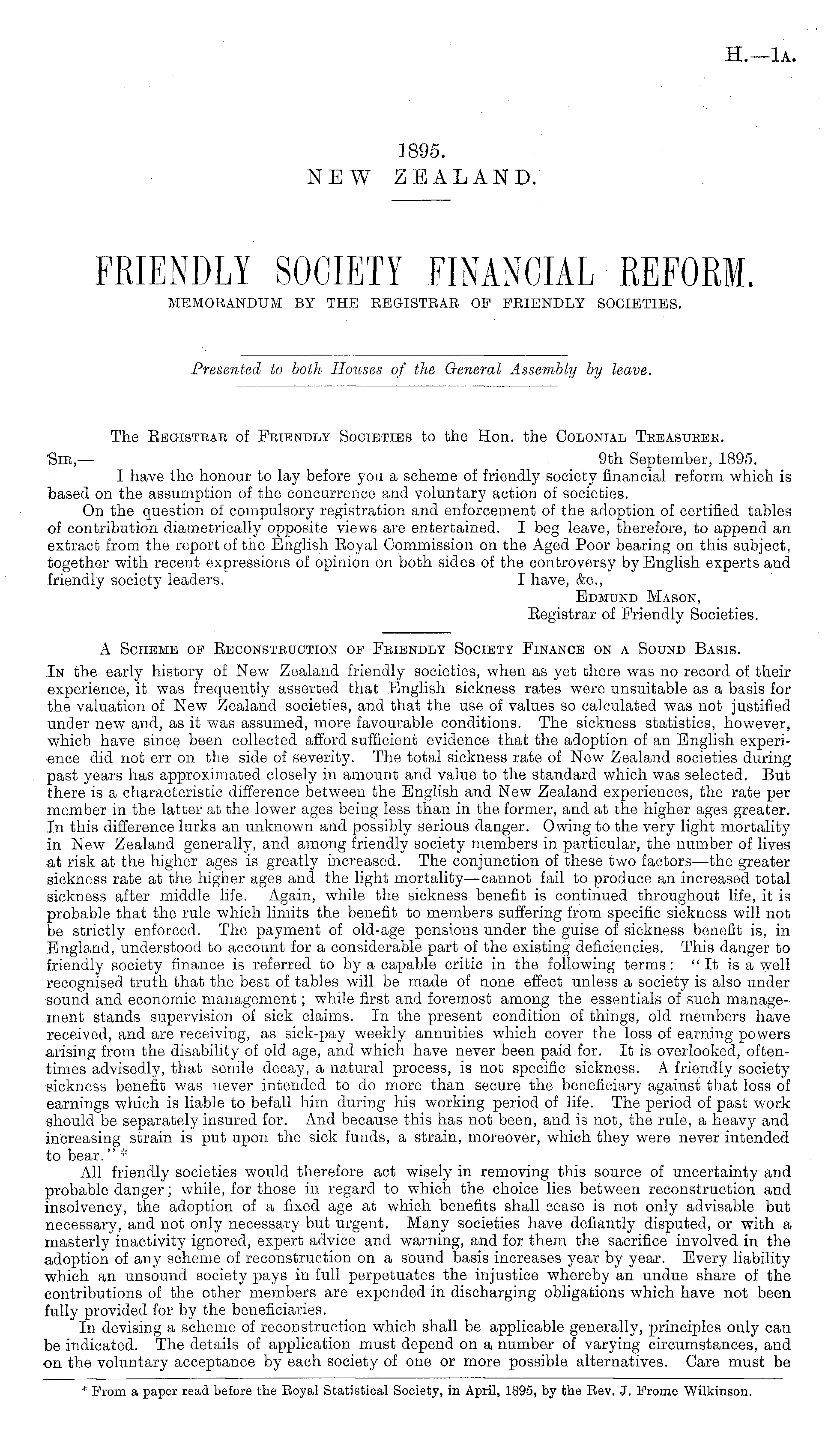 The Begistbak of Fbiendly Societies to the Hon. the Colonial Tbeasuber. Sik,— 9th September, 1895. I have the honour to lay before you a scheme of friendly society financial reform which is based on the assumption of the concurrence and voluntary action of societies. On the question of compulsory registration and enforcement of the adoption of certified tables of contribution diametrically opposite views are entertained. I beg leave, therefore, to append an extract from the report of the English Eoyal Commission on the Aged Poor bearing on this subject, together with recent expressions of opinion on both sides of the controversy by English experts and friendly society leaders. I have, &c, Edmund Mason, Eegistrar of Friendly Societies.