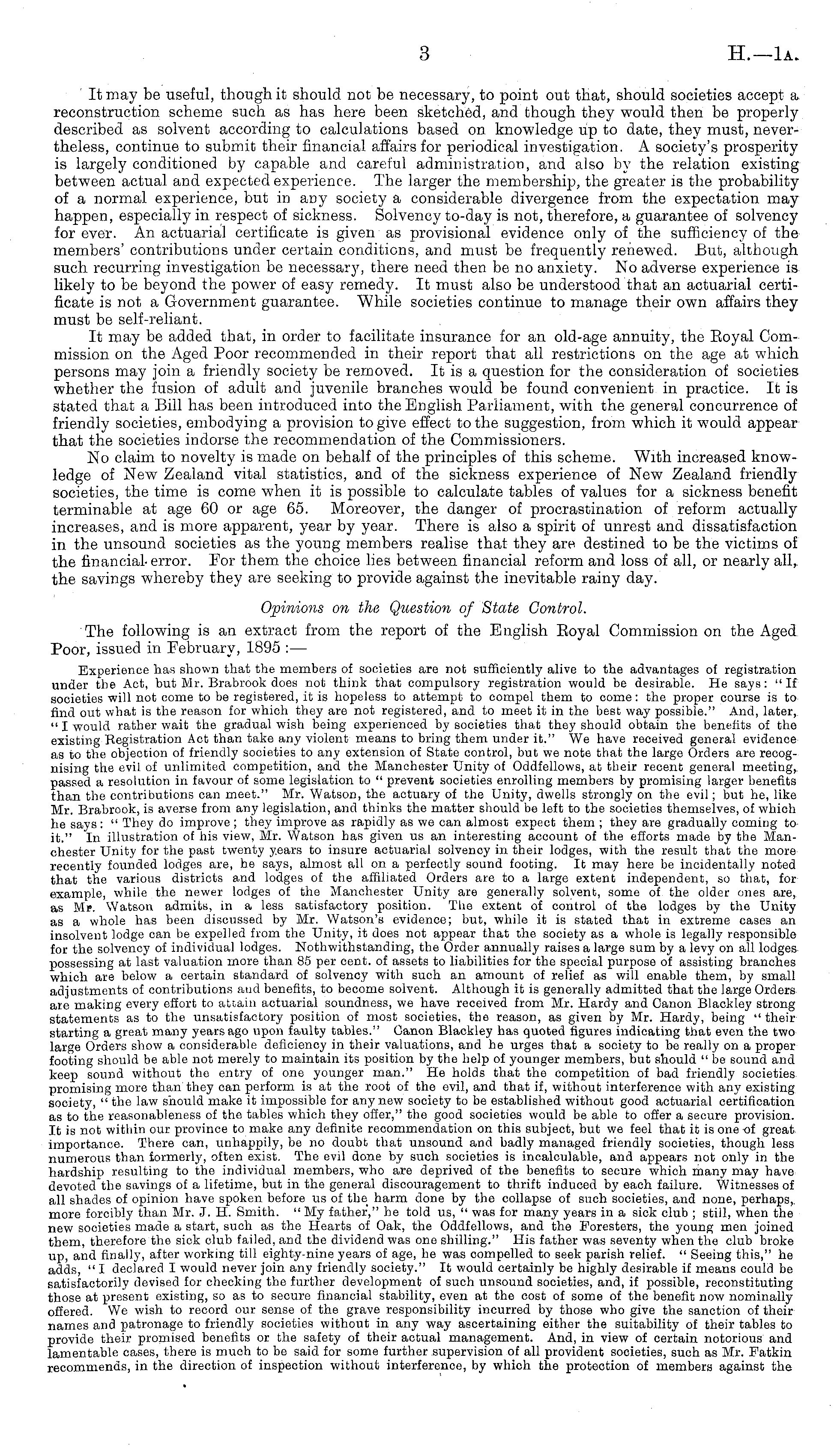 It may be useful, though it should not be necessary, to point out that, should societies accept a reconstruction scheme such as has here been sketched, and though they would then be properly described as solvent according to calculations based on knowledge up to date, they must, nevertheless, continue to submit their financial affairs for periodical investigation. A society's prosperity is largely conditioned by capable and careful administration, and also by the relation existing between actual and expected experience. The larger the membership, the greater is the probability of a normal experience, but in any society a considerable divergence from the expectation may happen, especially in respect of sickness. Solvency to-day is not, therefore, a guarantee of solvency for ever. An actuarial certificate is given as provisional evidence only of the sufficiency of the members' contributions under certain conditions, and must be frequently renewed. But, although such recurring investigation be necessary, there need then be no anxiety. No adverse experience is likely to be beyond the power of easy remedy. It must also be understood that an actuarial certificate is not a Government guarantee. While societies continue to manage their own affairs they must be self-reliant. It may be added that, in order to facilitate insurance for an old-age annuity, the Eoyal Commission on the Aged Poor recommended in their report that all restrictions on the age at which persons may join a friendly society be removed. It is a question for the consideration of societies whether the fusion of adult and juvenile branches would be found convenient in practice. It is stated that a Bill has been introduced into the English Parliament, with the general concurrence of friendly societies, embodying a provision to give effect to the suggestion, from which it would appear that the societies indorse the recommendation of the Commissioners. No claim to novelty is made on behalf of the principles of this scheme. With increased knowledge of New Zealand vital statistics, and of the sickness experience of New Zealand friendly societies, the time is come when it is possible to calculate tables of values for a sickness benefit terminable at age 60 or age 65. Moreover, the danger of procrastination of reform actually increases, and is more apparent, year by year. There is also a spirit of unrest and dissatisfaction in the unsound societies as the young members realise that they are. destined to be the victims of the financial-error. For them the choice lies between financial reform and loss of all, or nearly all, the savings whereby they are seeking to provide against the inevitable rainy day. Opinions on the Question of State Control. The following is an extract from the report of the English Eoyal Commission on the Aged Poor, issued in February, 1895 : — Experience has shown that the members of societies are not sufficiently alive to the advantages of registration under the Act, but Mr. Brabrook does not think that compulsory registration would be desirable. He says: "If societies will not come to be registered, it is hopeless to attempt to compel them to come: the proper course is to find out what is the reason for which they are not registered, and to meet it in the best way possible." And, later, " I would rather wait the gradual wish being experienced by societies that they should obtain the benefits of the existing Registration Act than take any violent means to bring them under it." We have received general evidence as to the objection of friendly societies to any extension of State control, but we note that the large Orders are recognising the evil of unlimited competition, and the Manchester Unity of Oddfellows, at their recent general meeting, passed a resolution in favour of some legislation to " prevent societies enrolling members by promising larger benefits than the contributions can meet." Mr. Watson, the actuary of the Unity, dwells strongly on the evil; but he, like Mr. Brabrook, is averse from any legislation, and thinks the matter should be left to the societies themselves, of which he says : " They do improve ; they improve as rapidly as we can almost expect them ; they are gradually coming to it." In illustration of his view, Mr. Watson has given us an interesting account of the efforts made by the Manchester Unity for the past twenty years to insure actuarial solvency in their lodges, with the result that the more recently founded lodges are, he says, almost all on a perfectly sound footing. It may here be incidentally noted that the various districts and lodges of the affiliated Orders are to a large extent independent, so that, for example, while the newer lodges of the Manchester Unity are generally solvent, some of the older ones are, as Mr. Watson admits, in a less satisfactory position. The extent of control of the lodges by the Unity as a whole has been discussed by Mr. Watson's evidence; but, while it is stated that in extreme cases an insolvent lodge can be expelled from the Unity, it does not appear that the society as a whole is legally responsible for the solvency of individual lodges. Notwithstanding, the Order annually raises a large sum by a levy on all lodges possessing at last valuation more than 85 per cent, of assets to liabilities for the special purpose of assisting branches which are below a certain standard of solvency with such an amount of relief as will enable them, by small adjustments of contributions and benefits, to become solvent. Although it is generally admitted that the large Orders are making every effort to attain actuarial soundness, we have received from Mr. Hardy and Canon Blackley strong statements as to the unsatisfactory position of most societies, the reason, as given by Mr. Hardy, being " their starting a great many years ago upon faulty tables." Canon Blackley has quoted figures indicating that even the two large Orders show a considerable deficiency in their 