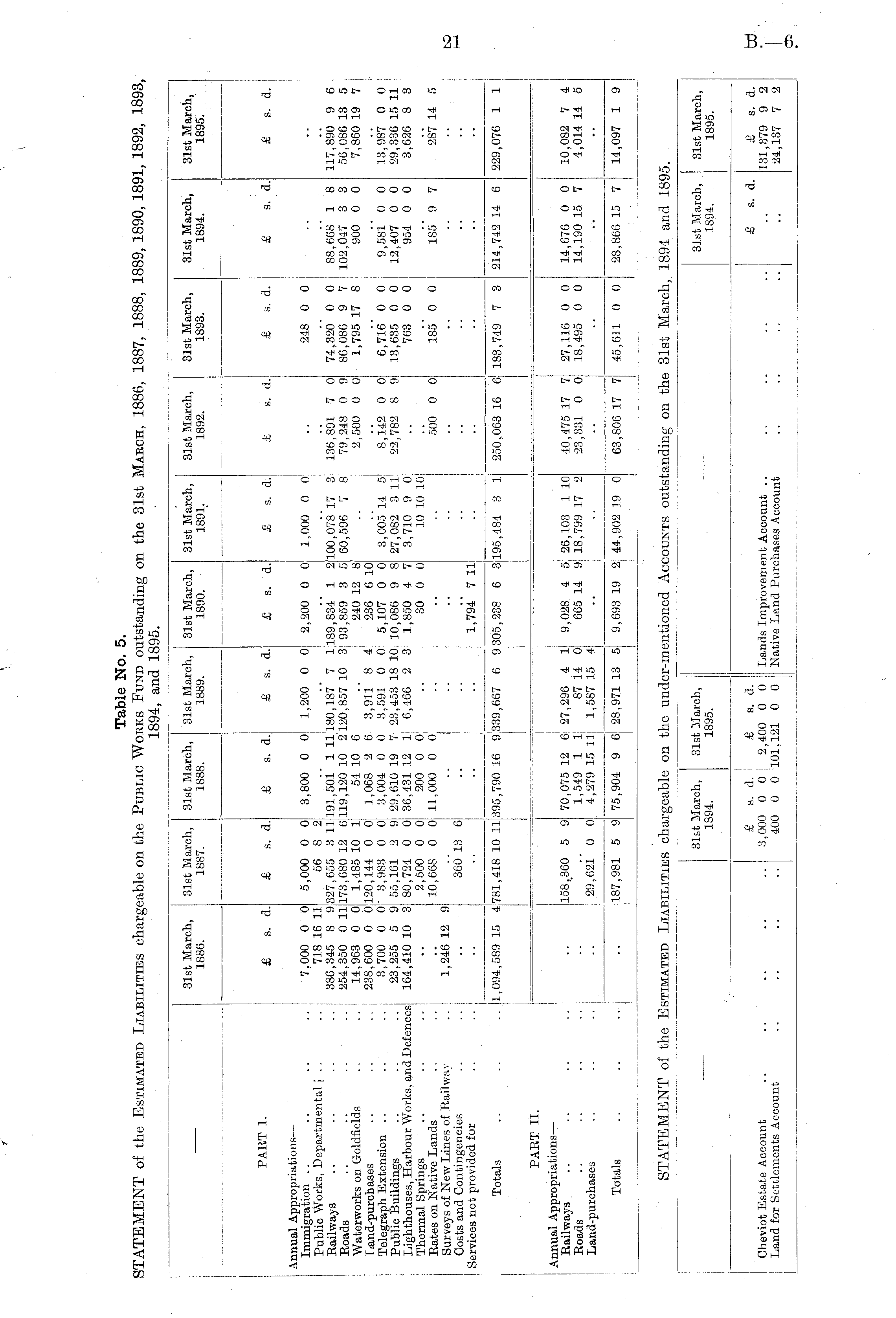Table No. 5. STATEMENT of the Estimated Liabilities chargeable on the Public Works Fund outstanding on the 31st March, 1886, 1887, 1888, 1889, 1890, 1891, 1892, 1893, 1894, and 1895.