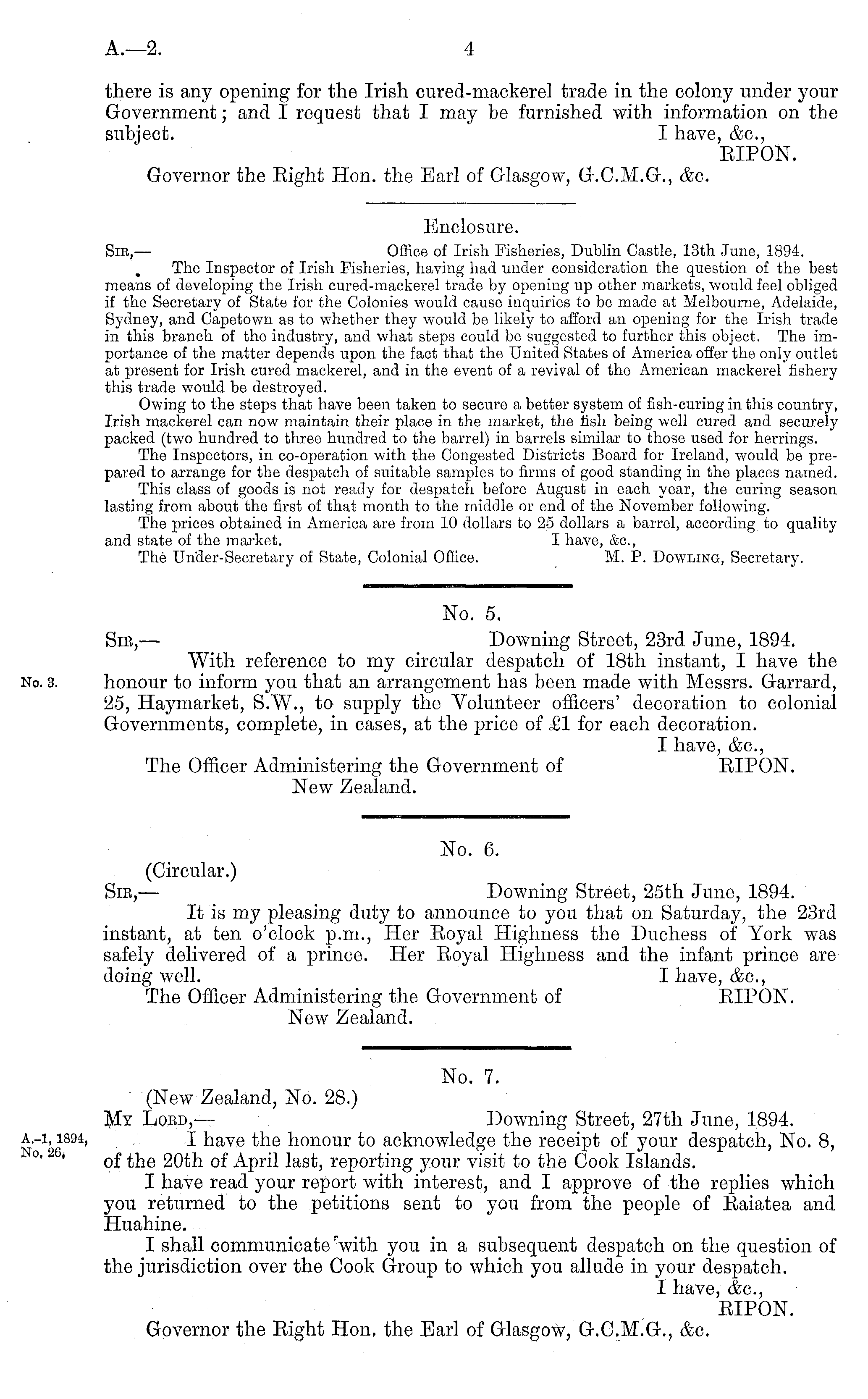 there is any opening for the Irish cured-mackerel trade in the colony under your Government; and I request that I may be furnished with information on the subject. I have, &c, EIPON. Governor the Eight Hon. the Earl of Glasgow, G.C.M.G., &c.