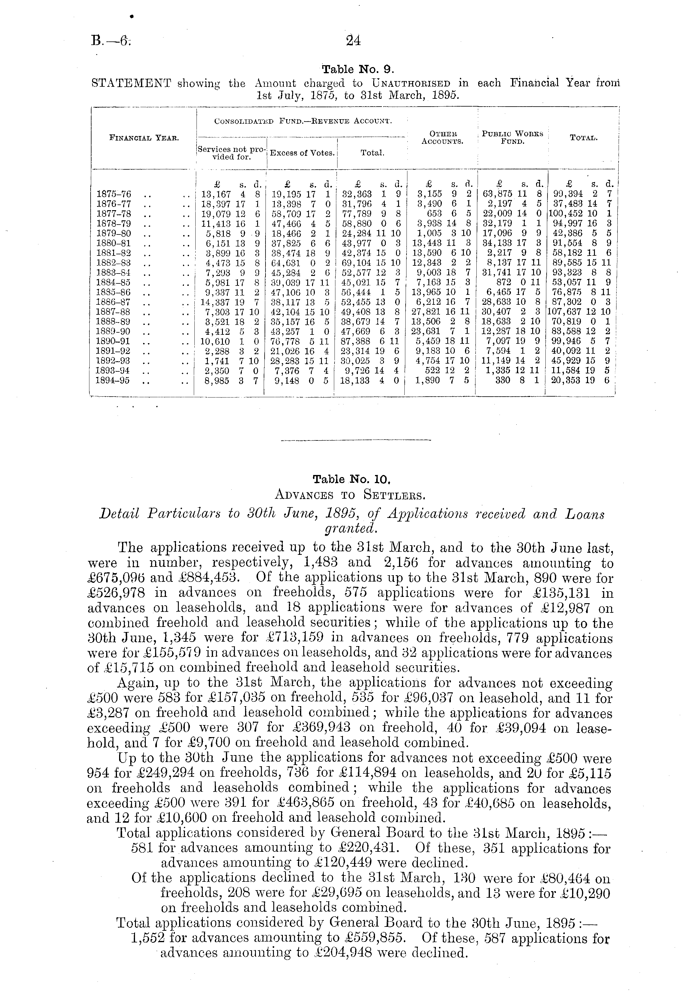 Table No. 9. STATEMENT showing the Amount charged to Unauthorised in each Financial Year from 1st July, 1875, to 31st March, 1895.