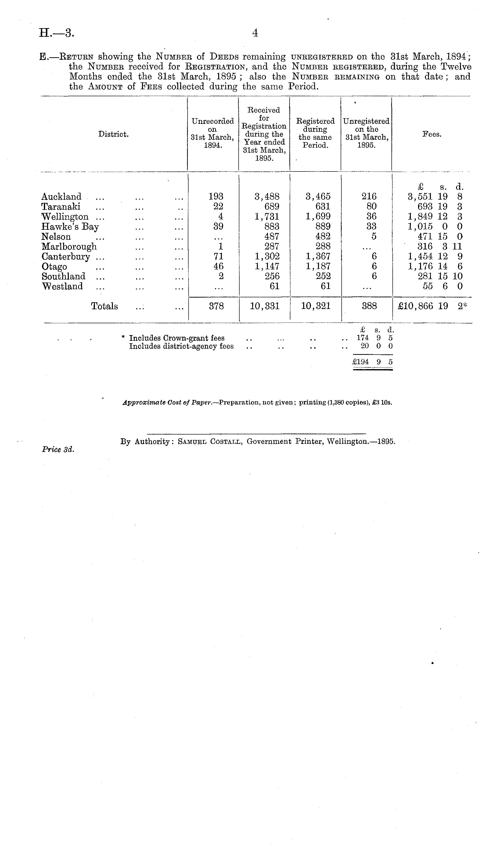 District. Unrecorded on 31st March, 1894. Received for Registration during the Year ended 31st March, 1895. Registered during the same Period. Unregistered on the 31st March, 1895. Fees. oickland 'aranaki Vellington ... lawke's Bay felson larlborough 'anterbury ... )tago iouthland ... Vestland 193 22 4 39 3,488 689 1,731 883 487 287 1,302 1,147 256 61 3,465 631 1,699 889 482 288 1,367 1,187 252 61 216 80 36 33 5 £ S. d. 3,551 19 8 693 19 3 1,849 12 3 1,015 0 0 471 15 0 316 3 11 1,454 12 9 1,176 14 6 281 15 10 55 6 0 1 71 46 2 6 6 6 Totals 378 10,331 10,321 388 £10,866 19 2*