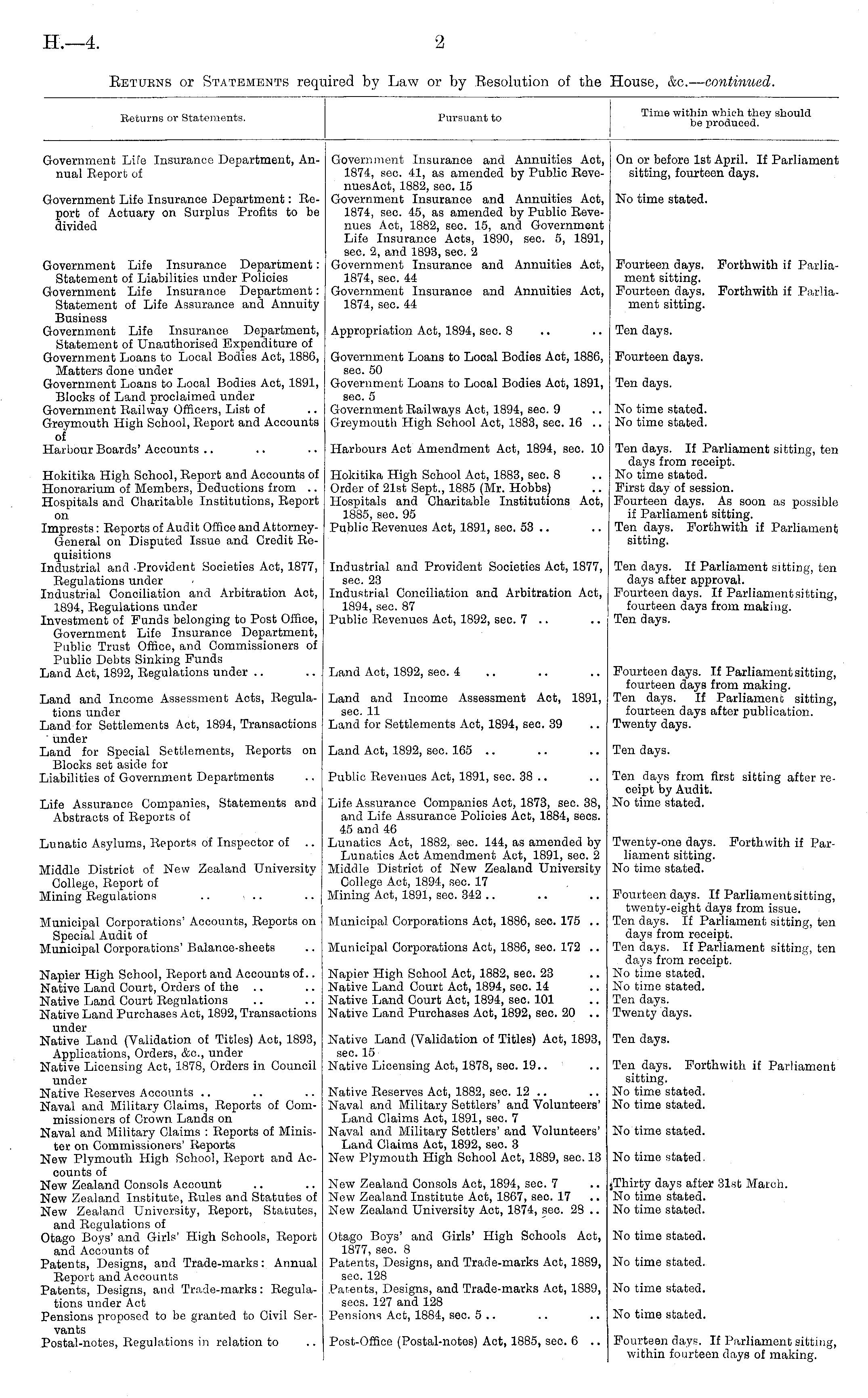 Returns or Statements. Government Life Insurance Department, Annual Report of Government Life Insurance Department: Report of Actuary on Surplus Profits to be divided Government Life Insurance Department: Statement of Liabilities under Policies Government Life Insurance Department: Statement of Life Assurance and Annuity Business Government Life Insurance Department, Statement of Unauthorised Expenditure of Government Loans to Local Bodies Act, 1886, Matters done under Government Loans to Local Bodies Act, 1891, Blocks of Land proclaimed under Government Railway Officers, List of Greymouth High School, Report and Accounts of Harbour Boards' Accounts Hokitika High School, Report and Accounts of Honorarium of Members, Deductions from .. Hospitals and Charitable Institutions, Report on Imprests: Reports of Audit Office and AttorneyGeneral on Disputed Issue and Credit Requisitions Industrial and -Provident Societies Act, 1877, Regulations under Industrial Conciliation and Arbitration Act, 1894, Regulations under Investment of Funds belonging to Post Office, Government Life Insurance Department, Public Trust Office, and Commissioners of Public Debts Sinking Funds Land Act, 1892, Regulations under Land and Incomo Assessment Acts, Regulations under Land for Settlements Act, 1894, Transactions under Land for Special Settlements, Reports on Blocks set aside for Liabilities of Government Departments Life Assurance Companies, Statements and Abstracts of Reports of Lunatic Asylums, Reports of Inspector of .. Middle District of New Zealand University College, Report of Mining Regulations .. ... Municipal Corporations' Accounts, Reports on Special Audit of Municipal Corporations' Balance-sheets Napier High School, Report and Accounts of.. Native Land Court, Orders of the .. Native Land Court Regulations Native Land Purchases Act, 1892, Transactions under Native Land (Validation of Titles) Act, 1893, Applications, Orders, &c, under Native Licensing Act, 1878, Orders in Council under Native Reserves Accounts Naval and Military Claims, Reports of Commissioners of Crown Lands on Naval and Military Claims : Reports of Minister on Commissioners' Reports New Plymouth High School, Report and Accounts of New Zealand Consols Account New Zealand Institute, Rules and Statutes of New Zealand University, Report, Statutes, and Regulations of Otago Boys' and Girls' High Schools, Report and Accounts of Patents, Designs, and Trade-marks: Annual Report and Accounts Patents, Designs, and Trade-marks: Regulations under Act Pensions proposed to be granted to Civil Servants Postal-notes, Regulations in relation to
