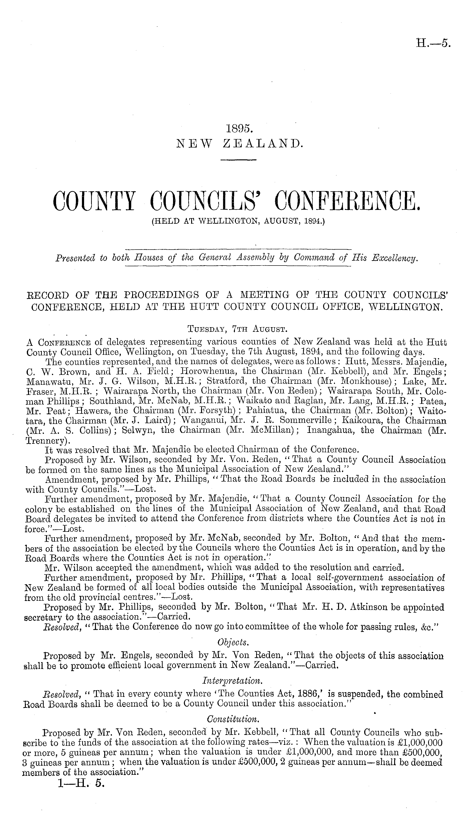 RECORD OP THE PROCEEDINGS OF A MEETING OP THE COUNTY COUNCILS' CONFERENCE, HELD AT THE HUTT COUNTY COUNCIL OFFICE, WELLINGTON. Tuesday, 7th August. A Confeeence of delegates representing various counties of New Zealand was held at the Hutt County Council Office, Wellington, on Tuesday, the 7th August, 1894, and the following days. The counties represented, and the names of delegates, were as follows : Hutt, Messrs. Majendie, C. W. Brown, and H. A. Field; Horowhenua, the Chairman (Mr. Kebbell), and Mr. Engels; Manawatu, Mr. J. G. Wilson, M.H.R.; Stratford, the Chairman (Mr. Monkhouse); Lake, Mr. Fraser, M.H.R. ; Wairarapa North, the Chairman (Mr. Yon Reden); Wairarapa South, Mr. Coleman Phillips ; Southland, Mr. McNab, M.H.R.; Waikato and Raglan, Mr. Lang, M.H.R.; Patea, Mr. Peat; Hawera, the Chairman (Mr. Forsyth); Pahiatua, the Chairman (Mr. Bolton); Waitotara, the Chairman (Mr. J. Laird); Wanganui, Mr. J. R. Sommerville ; Kaikoura, the Chairman (Mr. A. S. Collins); Selwyn, the Chairman (Mr. McMillan); Inangahua, the Chairman (Mr. Trennery). It was resolved that Mr. Majendie be elected Chairman of the Conference. Proposed by Mr. Wilson, seconded by Mr. Yon. Reden, "That a County Council Association be formed on the same lines as the Municipal Association of New Zealand." Amendment, proposed by Mr. Phillips, " That the Road Boards be included in the association with County Councils."—Lost. Further amendment, proposed by Mr. Majendie, "That a County Council Association for the colony be established on the lines of the Municipal Association of New Zealand, and that Road Board delegates be invited to attend the Conference from districts where the Counties Act is not in force." —Lost. Further amendment, proposed by Mr. McNab, seconded by Mr. Bolton, " And that the members of the association be elected by the Councils where the Counties Act is in operation, and by the Road Boards where the Counties Act is not in operation." Mr. Wilson accepted the amendment, which was added to the resolution and carried. Further amendment, proposed by Mr. Phillips, "That a local self-government association of New Zealand be formed of all local bodies outside the Municipal Association, with representatives from the old provincial centres."—Lost. Proposed by Mr. Phillips, seconded by Mr. Bolton, "That Mr. H. D. Atkinson be appointed secretary to the association."—Carried. Resolved, " That the Conference do now go into committee of the whole for passing rules, &c." Objects. Proposed by Mr. Engels, seconded by Mr. Yon Reden, " That the objects of this association shall be to promote efficient local government in New Zealand."—Carried. Interpretation. Resolved, " That in every county where 'The Counties Act, 1886,' is suspended, the combined Road Boards shall be deemed to be a County Council under this association." Constitution. Proposed by Mr. Yon Reden, seconded by Mr. Kebbell, "That all County Councils who subscribe to the funds of the association at the following rates—viz. : When the valuation is £1,000,000 or more, 5 guineas per annum; when the valuation is under £1,000,000, and more than £500,000, 3 guineas per annum ; when the valuation is under £500,000, 2 guineas per annum—shall be deemed members of the association." I—H. 5.