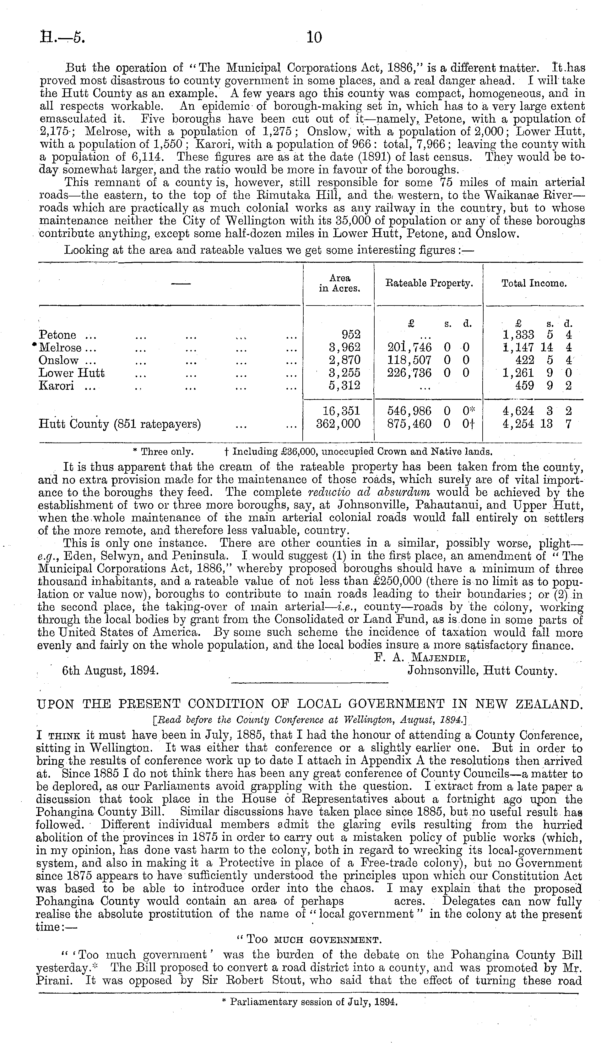 * Three only. t Including £36,000, unoccupied Crown and Native lands. It is thus apparent that the cream of the rateable property has been taken from the county, and no extra provision made for the maintenance of those roads, which surely are of vital importance to the boroughs they feed. The complete reductio ad absurdum would be achieved by the establishment of two or three more boroughs, say, at Johnsonville, Pahautanui, and Upper Hutt, when the whole maintenance of the main arterial colonial roads would fall entirely on settlers of the more remote, and therefore less valuable, country. This is only one instance. There are other counties in a similar, possibly worse, plight— e.g., Eden, Selwyn, and Peninsula. I would suggest (1) in the first place, an amendment of " The Municipal Corporations Act, 1886," whereby proposed boroughs should have a minimum of three thousand inhabitants, and a rateable value of not less than £250,000 (there is no limit as to population or value now), boroughs to contribute to main roads leading to their boundaries; or (2) in the second place, the taking-over of main arterial— i.e., county—roads by the colony, working through the local bodies by grant from the Consolidated or Land Fund, as is done in some parts of the United States of America. By some such scheme the incidence of taxation would fall more evenly and fairly on the whole population, and the local bodies insure a more satisfactory finance. F. A. Majendie, 6th August, 1894. Johnsonville, Hutt County.