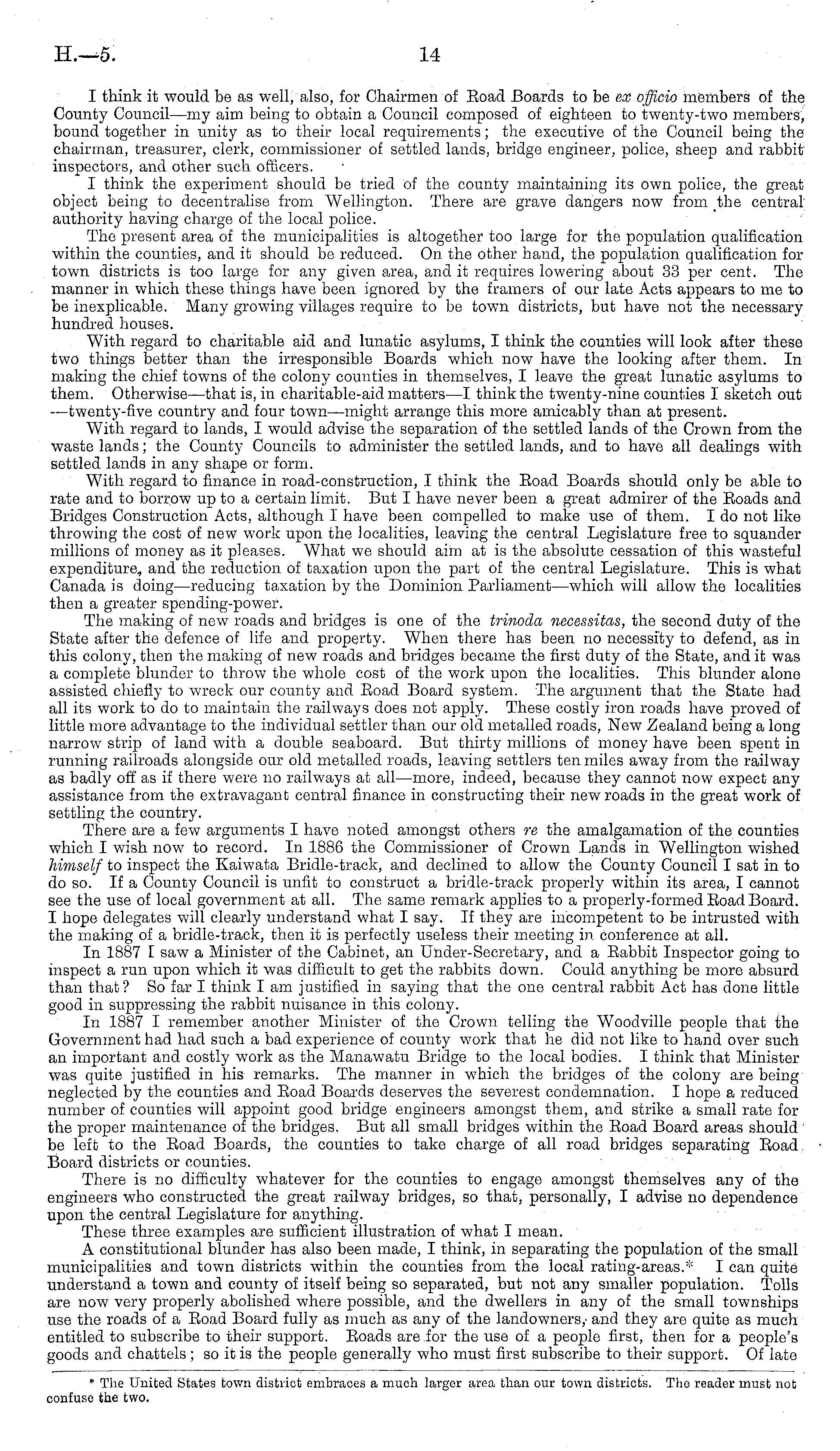 I think it would be as well, also, for Chairmen of Road Boards to be ex officio members of the County Council—my aim being to obtain a Council composed of eighteen to twenty-two members, bound together in unity as to their local requirements; the executive of the Council being the chairman, treasurer, clerk, commissioner of settled lands, bridge engineer, police, sheep and rabbit inspectors, and other such officers. I think the experiment should be tried of the county maintaining its own police, the great object being to decentralise from Wellington. There are grave dangers now from the central authority having charge of the local police. The present area of the municipalities is altogether too large for the population qualification within the counties, and it should be reduced. On the other hand, the population qualification for town districts is too large for any given area, and it requires lowering about 33 per cent. The manner in which these things have been ignored by the framers of our late Acts appears to me to be inexplicable. Many growing villages require to be town districts, but have not the necessary hundred, houses. With regard to charitable aid and lunatic asylums, I think the counties will look after these two things better than the irresponsible Boards which now have the looking after them. In making the chief towns of the colony counties in themselves, I leave the great lunatic asylums to them. Otherwise—that is, in charitable-aid matters—l think the twenty-nine counties I sketch out —twenty-five country and four town—might arrange this more amicably than at present. With regard to lands, I would advise the separation of the settled lands of the Crown from the waste lands; the County Councils to administer the settled lands, and to have all dealings with settled lands in any shape or form. With regard to finance in road-construction, I think the Road Boards should only be able to rate and to borrow up to a certain limit. But I have never been a great admirer of the Roads and Bridges Construction Acts, although I have been compelled to make use of them. Ido not like throwing the cost of new work upon the localities, leaving the central Legislature free to squander millions of money as it pleases. What we should aim at is the absolute cessation of this wasteful expenditure, and the reduction of taxation upon the part of the central Legislature. This is what Canada is doing —reducing taxation by the Dominion Parliament —which will allow the localities then a greater spending-power. The making of new roads and bridges is one of the trinoda necessitas, the second duty of the State after the defence of life and property. When there has been no necessity to defend, as in this colony, then the making of new roads and bridges became the first duty of the State, and it was a complete blunder to throw the whole cost of the work upon the localities. This blunder alone assisted chiefly to wreck our county and Road Board system. The argument that the State had all its work to do to maintain the railways does not apply. These costly iron roads have proved of little more advantage to the individual settler than our old metalled roads, New Zealand being a long narrow strip of land with a double seaboard. But thirty millions of money have been spent in running railroads alongside our old metalled roads, leaving settlers ten miles away from the railway as badly off as if there were no railways at all—more, indeed, because they cannot now expect any assistance from the extravagant central finance in constructing their new roads in the great work of settling the country. There are a few arguments I have noted amongst others re the amalgamation of the counties which I wish now to record. In 1886 the Commissioner of Crown Lands in Wellington wished himself to inspect the Kaiwata Bridle-track, and declined to allow the County Council I sat in to do so. If a County Council is unfit to construct a bridle-track properly within its area, I cannot see the use of local government at all. The same remark applies to a properly-formed Road Board. I hope delegates will clearly understand what I say. If they are incompetent to be intrusted with the making of a bridle-track, then it is perfectly useless their meeting in conference at all. In 1887 I saw a Minister of the Cabinet, an Under-Secretary, and a Rabbit Inspector going to inspect a run upon which it was difficult to get the rabbits down. Could anything be more absurd than that ? So far I think lam justified in saying that the one central rabbit Act has done little good in suppressing the rabbit nuisance in this colony. In 1887 I remember another Minister of the Crown telling the Woodville people that the Government had had such a bad experience of county work that he did not like to hand over such an important and costly work as the Manawatu Bridge to the local bodies. I think that Minister was quite justified in his remarks. The manner in which the bridges of the colony are being neglected by the counties and Road Boards deserves the severest condemnation. I hope a reduced number of counties will appoint good bridge engineers amongst them, and strike a small rate for the proper maintenance of the bridges. But all small bridges within the Road Board areas should be left to the Road Boards, the counties to take charge of all road bridges separating Road Board districts or counties. There is no difficulty whatever for the counties to engage amongst themselves any of the engineers who constructed the great railway bridges, so that, personally, I advise no dependence upon the central Legislature for anything. These three examples are sufficient illustration of what I mean. A constitutional blunder has also been made, I think, in separating the population of the small municipalities and town districts within the counties from the local rating-areas.* I can quite understand a town and county of itself being so separated, but not any small