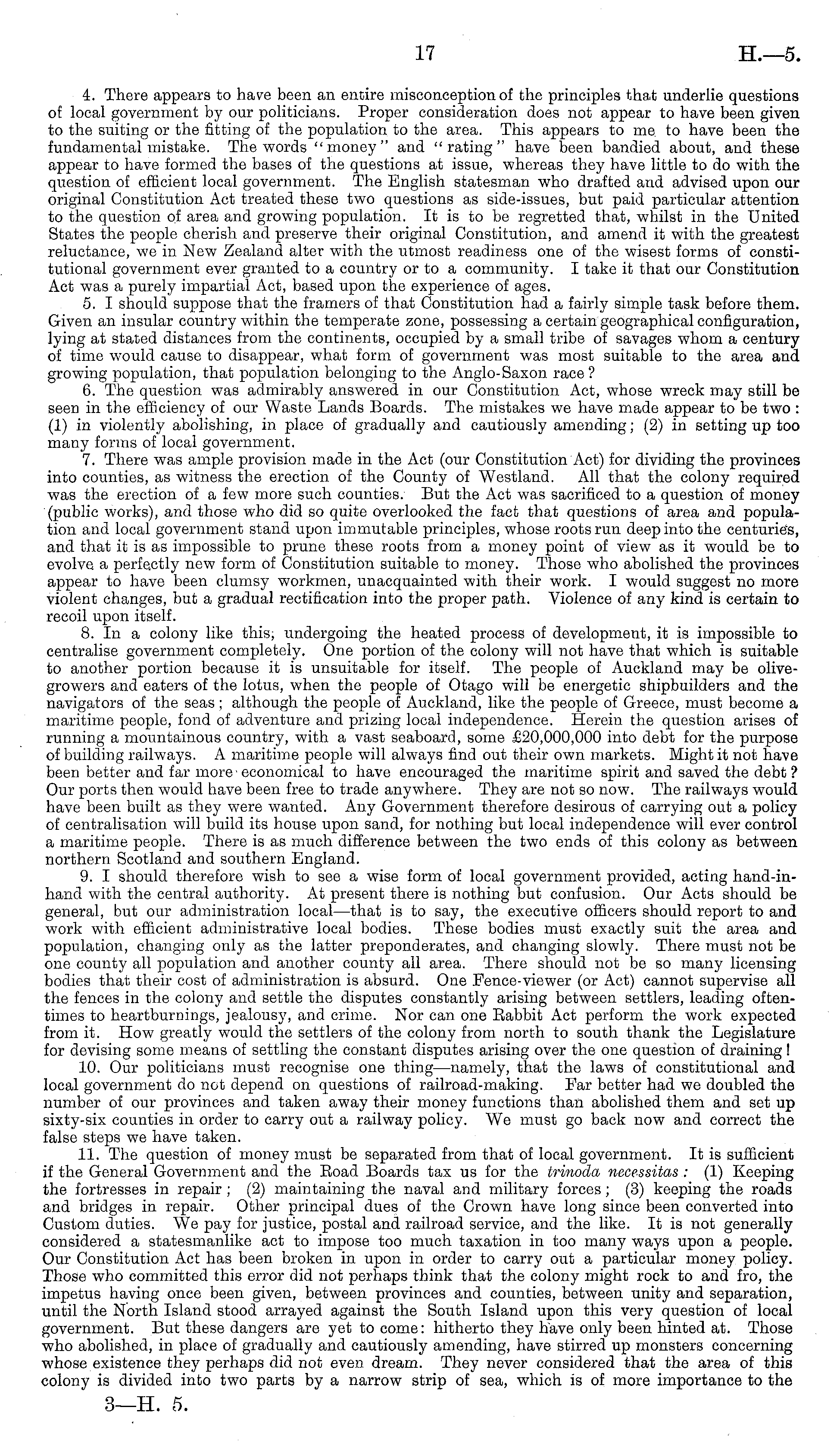 4. There appears to have been an entire misconception of the principles that underlie questions of local government by our politicians. Proper consideration does not appear to have been given to the suiting or the fitting of the population to the area. This appears to me. to have been the fundamental mistake. The words "money" and "rating" have been bandied about, and these appear to have formed the bases of the questions at issue, whereas they have little to do with the question of efficient local government. The English statesman who drafted and advised upon our original Constitution Act treated these two questions as side-issues, but paid particular attention to the question of area and growing population. It is to be regretted that, whilst in the United States the people cherish and preserve their original Constitution, and amend it with the greatest reluctance, we in New Zealand alter with the utmost readiness one of the wisest forms of constitutional government ever granted to a country or to a community. I take it that our Constitution Act was a purely impartial Act, based upon the experience of ages. 5. I should suppose that the framers of that Constitution had a fairly simple task before them. Given an insular country within the temperate zone, possessing a certain geographical configuration, lying at stated distances from the continents, occupied by a small tribe of savages whom a century of time would cause to disappear, what form of government was most suitable to the area and growing population, that population belonging to the Anglo-Saxon race ? 6. The question was admirably answered, in our Constitution Act, whose wreck may still be seen in the efficiency of our Waste Lands Boards. The mistakes we have made appear to be two : (1) in violently abolishing, in place of gradually and cautiously amending; (2) in setting up too many forms of local government. 7. There was ample provision made in the Act (our Constitution Act) for dividing the provinces into counties, as witness the erection of the County of Westland. All that the colony required was the erection of a few more such counties. But the Act was sacrificed to a question of money (public works), and those who did so quite overlooked the fact that questions of area and population and local government stand upon immutable principles, whose roots run deep into the centuries, and that it is as impossible to prune these roots from a money point of view as it would be to evolve a perfectly new form of Constitution suitable to money. Those who abolished the provinces appear to have been clumsy workmen, unacquainted with their work. I would suggest no more violent changes, but a gradual rectification into the proper path. Violence of any kind is certain to recoil upon itself. 8. In a colony like this, undergoing the heated process of development, it is impossible to centralise government completely. One portion of the colony will not have that which is suitable to another portion because it is unsuitable for itself. The people of Auckland may be olivegrowers and eaters of the lotus, when the people of Otago will be energetic shipbuilders and the navigators of the seas ; although the people of Auckland, like the people of Greece, must become a maritime people, fond of adventure and prizing local independence. Herein the question arises of running a mountainous country, with a vast seaboard, some £20,000,000 into debt for the purpose of building railways. A maritime people will always find out their own markets. Might it not have been better and far more' economical to have encouraged the maritime spirit and saved the debt ? Our ports then would have been free to trade anywhere. They are not so now. The railways would have been built as they were wanted. Any Government therefore desirous of carrying out a policy of centralisation will build its house upon sand, for nothing but local independence will ever control a maritime people. There is as much difference between the two ends of this colony as between northern Scotland and southern England. 9. I should therefore wish to see a wise form of local government provided, acting hand-in-hand with the central authority. At present there is nothing but confusion. Our Acts should be general, but our administration local —that is to say, the executive officers should report to and work with efficient administrative local bodies. These bodies must exactly suit the area and population, changing only as the latter preponderates, and changing slowly. There must not be one county all population and another county all area. There should not be so many licensing bodies that their cost of administration is absurd. One Fence-viewer (or Act) cannot supervise all the fences in the colony and settle the disputes constantly arising between settlers, leading oftentimes to heartburnings, jealousy, and crime. Nor can one Rabbit Act perform the work expected from it. How greatly would the settlers of the colony from north to south thank the Legislature for devising some means of settling the constant disputes arising over the one question of draining! 10. Our politicians must recognise one thing—namely, that the laws of constitutional and local government do not depend on questions of railroad-making. Far better had we doubled the number of our provinces and taken away their money functions than abolished them and set up sixty-six counties in order to carry out a railway policy. We must go back now and correct the false steps we have taken. 11. The question of money must be separated from that of local government. It is sufficient if the General Government and the Road Boards tax us for the trinoda necessitas : (1) Keeping the fortresses in repair ; (2) maintaining the naval and military forces ; (3) keeping the roads and bridges in repair. Other principal dues of the Crown have long since been converted into Custom duties. We pay for justice, postal and railroad service, and the like. It is not g