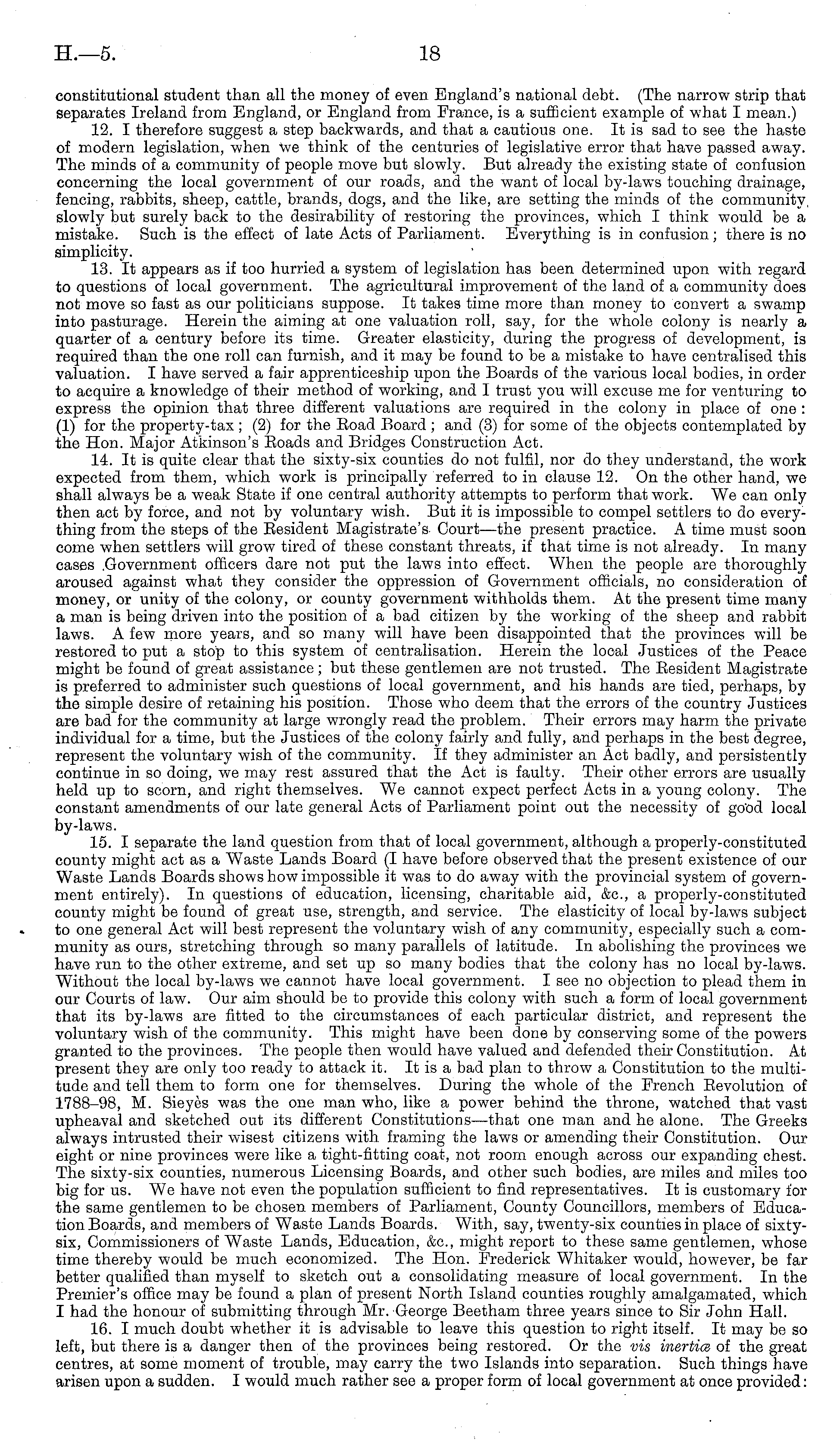 constitutional student than all the money of even England's national debt. (The narrow strip that separates Ireland from England, or England from France, is a sufficient example of what I mean.) 12. I therefore suggest a step backwards, and that a cautious one. It is sad to see the haste of modern legislation, when we think of the centuries of legislative error that have passed away. The minds of a community of people move but slowly. But already the existing state of confusion concerning the local government of our roads, and the want of local by-laws touching drainage, fencing, rabbits, sheep, cattle, brands, dogs, and the like, are setting the minds of the community, slowly but surely back to the desirability of restoring the provinces, which I think would be a mistake. Such is the effect of late Acts of Parliament. Everything is in confusion; there is no simplicity. 13. It appears as if too hurried a system of legislation has been determined upon with regard to questions of local government. The agricultural improvement of the land of a community does not move so fast as our politicians suppose. It takes time more than money to convert a swamp into pasturage. Herein the aiming at one valuation roll, say, for the whole colony is nearly a quarter of a century before its time. Greater elasticity, during the progress of development, is required than the one roll can furnish, and it may be found to be a mistake to have centralised this valuation. I have served a fair apprenticeship upon the Boards of the various local bodies, in order to acquire a knowledge of their method of working, and I trust you will excuse me for venturing to express the opinion that three different valuations are required in the colony in place of one : (1) for the property-tax ; (2) for the Boad Board ; and (3) for some of the objects contemplated by the Hon. Major Atkinson's Boads and Bridges Construction Act. 14. It is quite clear that the sixty-six counties do not fulfil, nor do they understand, the work expected from them, which work is principally referred to in clause 12. On the other hand, we shall always be a weak State if one central authority attempts to perform that work. We can only then act by force, and not by voluntary wish. But it is impossible to compel settlers to do everything from the steps of the Besident Magistrate's Court—the present practice. A time must soon come when settlers will grow tired of these constant threats, if that time is not already. In many cases Government officers dare not put the laws into effect. When the people are thoroughly aroused against what they consider the oppression of Government officials, no consideration of money, or unity of the colony, or county government withholds them. At the present time many a man is being driven into the position of a bad citizen by the working of the sheep and rabbit laws. A few more years, and so many will have been disappointed that the provinces will be restored to put a stop to this system of centralisation. Herein the local Justices of the Peace might be found of great assistance; but these gentlemen are not trusted. The Besident Magistrate is preferred to administer such questions of local government, and his hands are tied, perhaps, by the simple desire of retaining his position. Those who deem that the errors of the country Justices are bad for the community at large wrongly read the problem. Their errors may harm the private individual for a time, but the Justices of the colony fairly and fully, and perhaps in the best degree, represent the voluntary wish of the community. If they administer an Act badly, and persistently continue in so doing, we may rest assured that the Act is faulty. Their other errors are usually held up to scorn, and right themselves. We cannot expect perfect Acts in a young colony. The constant amendments of our late general Acts of Parliament point out the necessity of good local by-laws. 15. I separate the land question from that of local government, although a properly-constituted county might act as a Waste Lands Board (I have before observed that the present existence of our Waste Lands Boards shows how impossible it was to do away with the provincial system of government entirely). In questions of education, licensing, charitable aid, &c, a properly-constituted county might be found of great use, strength, and service. The elasticity of local by-laws subject to one general Act will best represent the voluntary wish of any community, especially such a community as ours, stretching through so many parallels of latitude. In abolishing the provinces we have run to the other extreme, and set up so many bodies that the colony has no local by-laws. Without the local by-laws we cannot have local government. I see no objection to plead them in our Courts of law. Our aim should be to provide this colony with such a form of local government that its by-laws are fitted to the circumstances of each particular district, and represent the voluntary wish of the community. This might have been done by conserving some of the powers granted to the provinces. The people then would have valued and defended their Constitution. At present they are only too ready to attack it. It is a bad plan to throw a Constitution to the multitude and tell them to form one for themselves. During the whole of the French Bevolution of 1788-98, M. Sieyes was the one man who, like a power behind the throne, watched that vast upheaval and sketched out its different Constitutions —that one man and he alone. The Greeks always intrusted their wisest citizens with framing the laws or amending their Constitution. Our eight or nine provinces were like a tight-fitting coat, not room enough across our expanding chest. The sixty-six counties, numerous Licensing Boards, and other such bodies, are miles and miles too big for us. We have not even the population sufficient to find representatives. It is customary for the same gentlemen to be chos