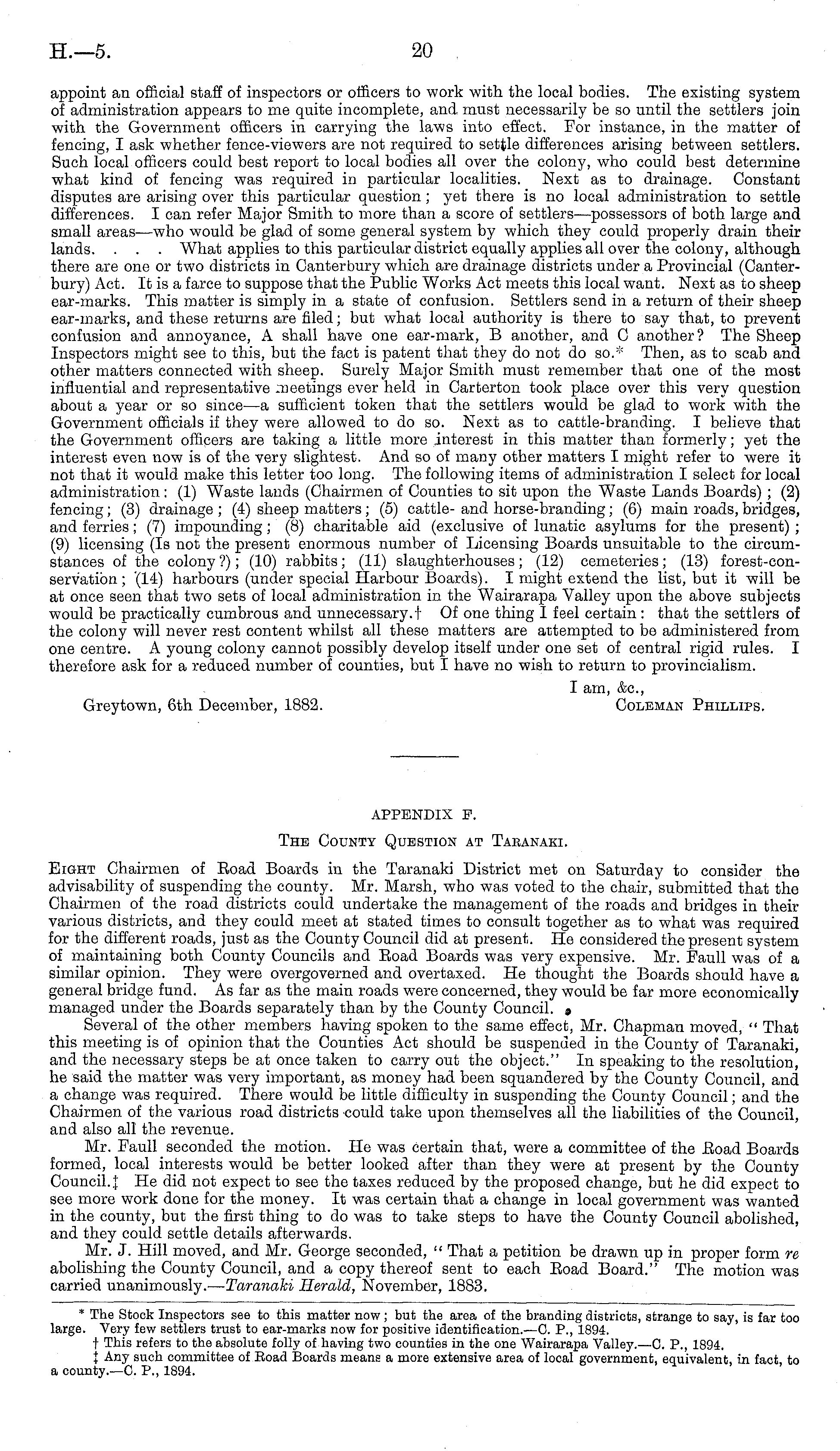 appoint an official staff of inspectors or officers to work with the local bodies. The existing system of administration appears to me quite incomplete, and must necessarily be so until the settlers join with the Government officers in carrying the laws into effect. For instance, in the matter of fencing, I ask whether fence-viewers are not required to settle differences arising between settlers. Such local officers could best report to local bodies all over the colony, who could best determine what kind of fencing was required in particular localities. Next as to drainage. Constant disputes are arising over this particular question; yet there is no local administration to settle differences. I can refer Major Smith to more than a score of settlers—possessors of both large and small areas—who would be glad of some general system by which they could properly drain their lands. . . . What applies to this particular district equally applies all over the colony, although there are one or two districts in Canterbury which are drainage districts under a Provincial (Canterbury) Act. It is a farce to suppose that the Public Works Act meets this local want. Next as to sheep ear-marks. This matter is simply in a state of confusion. Settlers send in a return of their sheep ear-marks, and these returns are filed; but what local authority is there to say that, to prevent confusion and annoyance, A shall have one ear-mark, B another, and 0 another? The Sheep Inspectors might see to this, but the fact is patent that they do not do so.* Then, as to scab and other matters connected with sheep. Surely Major Smith must remember that one of the most influential and representative meetings ever held in Carterton took place over this very question about a year or so since—a sufficient token that the settlers would be glad to work with the Government officials if they were allowed to do so. Next as to cattle-branding. I believe that the Government officers are taking a little more interest in this matter than formerly; yet the interest even now is of the very slightest. And so of many other matters I might refer to were it not that it would make this letter too long. The following items of administration I select for local administration: (1) Waste lands (Chairmen of Counties to sit upon the Waste Lands Boards) ; (2) fencing ; (3) drainage ; (4) sheep matters ; (5) cattle- and horse-branding; (6) main roads, bridges, and ferries ; (7) impounding; (8) charitable aid (exclusive of lunatic asylums for the present) ; (9) licensing (Is not the present enormous number of Licensing Boards unsuitable to the circumstances of the colony?); (10) rabbits; (11) slaughterhouses; (12) cemeteries; (13) forest-con-servation ; '(14) harbours (under special Harbour Boards). I might extend the list, but it will be at once seen that two sets of local administration in the Wairarapa Valley upon the above subjects would be practically cumbrous and unnecessary.f Of one thing I feel certain : that the settlers of the colony will never rest content whilst all these matters are attempted to be administered from one centre. A young colony cannot possibly develop itself under one set of central rigid rules. I therefore ask for a reduced number of counties, but I have no wish to return to provincialism. I am, &c, Greytown, 6th December, 1882. Coleman Phillips.