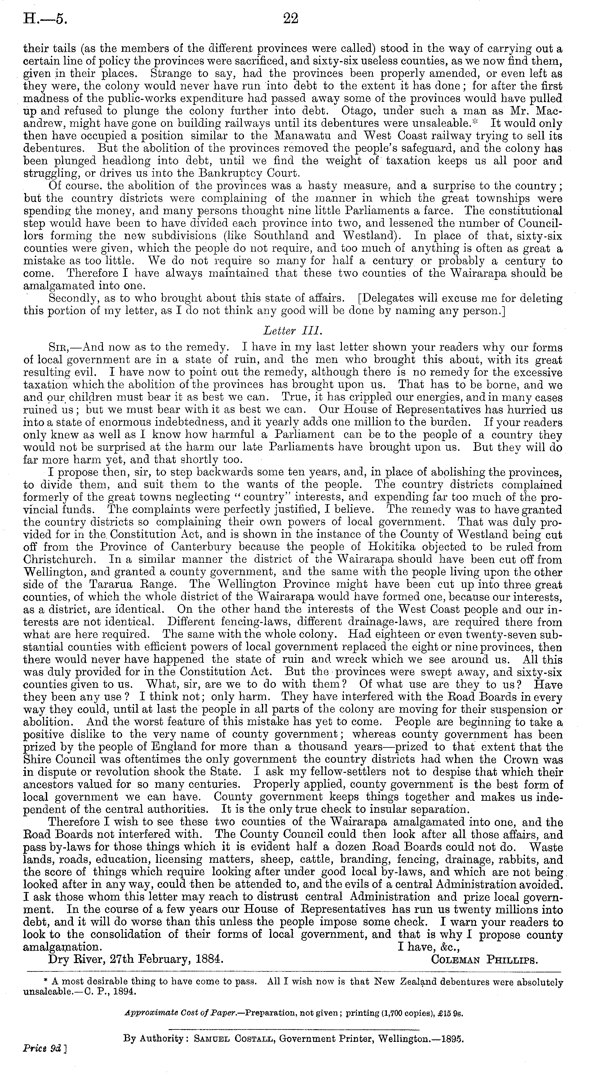their tails (as the members of the different provinces were called) stood in the way of carrying out a certain line of policy the provinces were sacrificed, and sixty-six useless counties, as we now find them, given in their places. Strange to say, had the provinces been properly amended, or even left as they were, the colony would never have run into debt to the extent it has done ; for after the first madness of the public-works expenditure had passed away some of the provinces would have pulled up and refused to plunge the colony further into debt. Otago, under such a man as Mr. Macandrew, might have gone on building railways until its debentures were unsaleable.* It would only then have occupied a position similar to the Manawatu and West Coast railway trying to sell its debentures. But the abolition of the provinces removed the people's safeguard, and the colony has been plunged headlong into debt, until we find the weight of taxation keeps us all poor and struggling, or drives us into the Bankruptcy Court. Of course, the abolition of the provinces was a hasty measure, and a surprise to the country; but the country districts were complaining of the manner in which the great townships were spending the money, and many persons thought nine little Parliaments a farce. The constitutional step would have been to have divided each province into two, and lessened the number of Councillors forming the new subdivisions (like Southland and Westland). In place of that, sixty-six counties were given, which the people do not require, and too much of anything is often as great a mistake as too little. We do not require so many for half a century or probably a century to come. Therefore I have always maintained that these two counties of the Wairarapa should, be amalgamated into one. Secondly, as to who brought about this state of affairs. [Delegates will excuse me for deleting this portion of my letter, as I do not think any goodwill be done by naming any person.] Letter 111. Sir, —And now as to the remedy. I have in my last letter shown your readers why our forms of local government are in a state of ruin, and the men who brought this about, with its great resulting evil. I have now to point out the remedy, although there is no remedy for the excessive taxation which the abolition of the provinces has brought upon us. That has to be borne, and we and pur children must bear it as best we can. True, it has crippled our energies, and in many cases ruined us ; but we must bear with it as best we can. Our House of Representatives has hurried us into a state of enormous indebtedness, and it yearly adds one million to the burden. If your readers only knew as well as I know how harmful a Parliament can be to the people of a country they would not be surprised at the harm our late Parliaments have brought upon us. But they will do far more harm yet, and that shortly too. I propose then, sir, to step backwards some ten years, and, in place of abolishing the provinces, to divide them, and suit them to the wants of the people. The country districts complained formerly of the great towns neglecting " country" interests, and expending far too much of the provincial funds. The complaints were perfectly justified, I believe. The remedy was to have granted the country districts so complaining their own powers of local government. That was duly provided for in the. Constitution Act, and is shown in the instance of the County of Westland being cut off from the Province of Canterbury because the people of Hokitika objected to be ruled from Christchurch. In a similar manner the district of the Wairarapa should have been cut off from Wellington, and granted a county government, and the same with the people living upon the other side of the Tararua Range. The Wellington Province might have been cut up into three great counties, of which the whole district of the Wairarapa would have formed one, because our interests, as a district, are identical. On the other hand the interests of the West Coast people and our interests are not identical. Different fencing-laws, different drainage-laws, are required there from what are here required. The same with the whole colony. Had eighteen or even twenty-seven substantial counties with efficient powers of local government replaced the eight or nine provinces, then there would never have happened the state of ruin and wreck which we see around us. All this was duly provided for in the Constitution Act. But the provinces were swept away, and sixty-six counties given to us. What, sir, are we to do with them? Of what use are they to us? Have they been any use ? I think not; only harm. They have interfered with the Road Boards in every way they could, until at last the people in all parts of the colony are moving for their suspension or abolition. And the worst feature of this mistake has yet to come. People are beginning to take a positive dislike to the very name of county government; whereas county government has been prized by the people of England for more than a thousand years —prized to that extent that the Shire Council was oftentimes the only government the country districts had when the Crown was in dispute or revolution shook the State. I ask my fellow-settlers not to despise that which their ancestors valued for so many centuries. Properly applied, county government is the best form of local government we can have. County government keeps things together and makes us independent of the central authorities. It is the only true check to insular separation. Therefore I wish to see these two counties of the Wairarapa amalgamated into one, and the Road Boards not interfered with. The County Council could then look after all those affairs, and pass by-laws for those things which it is evident half a dozen Road Boards could not do. Waste lands, roads, education, licensing matters, sheep, cattle, branding, fencing, drainage, rabbits, and the score of things which require looki