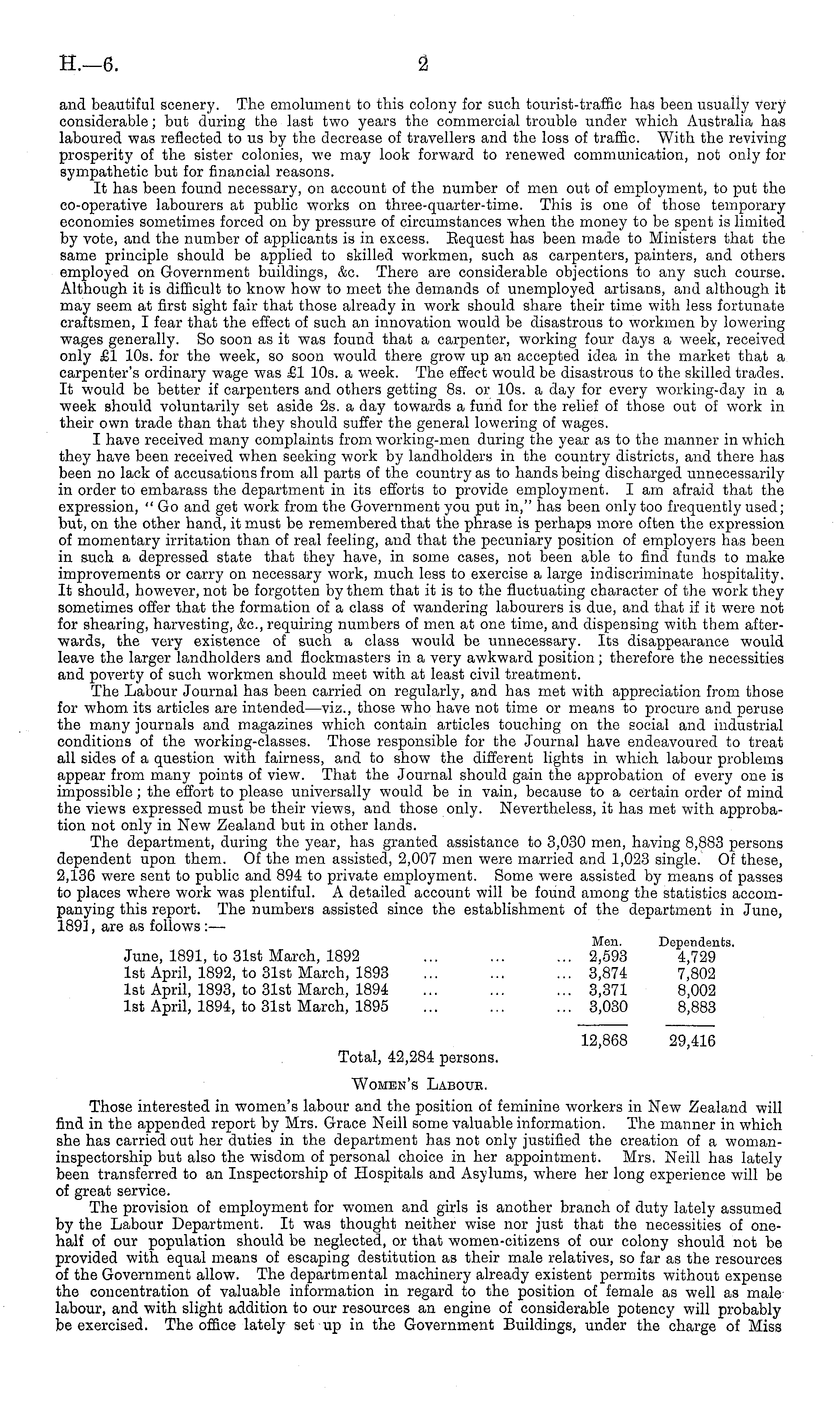 and beautiful scenery. The emolument to this colony for such tourist-traffic has been usually very considerable; but during the last two years the commercial trouble under which Australia has laboured was reflected to us by the decrease of travellers and the loss of traffic. With the reviving prosperity of the sister colonies, we may look forward to renewed communication, not only for sympathetic but for financial reasons. It has been found necessary, on account of the number of men out of employment, to put the co-operative labourers at public works on three-quarter-time. This is one of those temporary economies sometimes forced on by pressure of circumstances when the money to be spent is limited, by vote, and the number of applicants is in excess. Bequest has been made to Ministers that the same principle should be applied to skilled workmen, such as carpenters, painters, and others employed on Government buildings, &c. There are considerable objections to any such course. Although it is difficult to know how to meet the demands of unemployed artisans, and although it may seem at first sight fair that those already in work should share their time with less fortunate craftsmen, I fear that the effect of such an innovation would be disastrous to workmen by lowering wages generally. So soon as it was found that a carpenter, working four days a week, received only £1 10s. for the week, so soon would there grow up an accepted idea in the market that a carpenter's ordinary wage was £1 10s. a week. The effect would be disastrous to the skilled trades. It would be better if carpenters and others getting Bs. or 10s. a day for every working-day in a week should voluntarily set aside 2s. a day towards a fund for the relief of those out of work in their own trade than that they should suffer the general lowering of wages. I have received many complaints from working-men during the year as to the manner in which they have been received when seeking work by landholders in the country districts, and there has been no lack of accusations from all parts of the country as to hands being discharged unnecessarily in order to embarass the department in its efforts to provide employment. I am afraid that the expression, " Go and get work from the Government you put in," has been only too frequently used; but, on the other hand, it must be remembered that the phrase is perhaps more often the expression of momentary irritation than of real feeling, and that the pecuniary position of employers has been in such a depressed state that they have, in some cases, not been able to find funds to make improvements or carry on necessary work, much less to exercise a large indiscriminate hospitality. It should, however, not be forgotten by them that it is to the fluctuating character of the work they sometimes offer that the formation of a class of wandering labourers is due, and that if it were not for shearing, harvesting, &c, requiring numbers of men at one time, and dispensing with them afterwards, the very existence of such a class would be unnecessary. Its disappearance would leave the larger landholders and flockmasters in a very awkward position; therefore the necessities and poverty of such workmen should meet with at least civil treatment. The Labour Journal has been carried on regularly, and has met with appreciation from those for whom its articles are intended —viz., those who have not time or means to procure and peruse the many journals and magazines which contain articles touching on the social and industrial conditions of the working-classes. Those responsible for the Journal have endeavoured to treat all sides of a question with fairness, and to show the different lights in which labour problems appear from many points of view. That the Journal should gain the approbation of every one is impossible ; the effort to please universally would be in vain, because to a certain order of mind the views expressed must be their views, and those only. Nevertheless, it has met with approbation not only in New Zealand but in other lands. The department, during the year, has granted assistance to 3,030 men, having 8,883 persons dependent upon them. Of the men assisted, 2,007 men were married and 1,023 single. Of these, 2,136 were sent to public and 894 to private employment. Some were assisted by means of passes to places where work was plentiful. A detailed account will be found among the statistics accompanying this report. The numbers assisted since the establishment of the department in June, 189], are as follows :— Men. Dependents. June, 1891, to 31st March, 1892 ... ... ... 2,593 4,729 Ist April, 1892, to 31st March, 1893 ... ... ... 3,874 7,802 Ist April, 1893, to 31st March, 1894 ... ... ... 3,371 8,002 Ist April, 1894, to 31st March, 1895 ... ... ... 3,030 8,883 12,868 29,416 Total, 42,284 persons. Women's Laboub. Those interested in women's labour and the position of feminine workers in New Zealand will find in the appended report by Mrs. Grace Neill some valuable information. The manner in which she has carried out her duties in the department has not only justified the creation of a womaninspectorship but also the wisdom of personal choice in her appointment. Mrs. Neill has lately been transferred to an Inspectorship of Hospitals and Asylums, where her long experience will be of great service. The provision of employment for women and girls is another branch of duty lately assumed by the Labour Department. It was thought neither wise nor just that the necessities of onehalf of our population should be neglected, or that women-citizens of our colony should not be provided with equal means of escaping destitution as their male relatives, so far as the resources of the Government allow. The departmental machinery already existent permits without expense the concentration of valuable information in regard to the position of female as well as male labour, and with slight addition to our resources an en