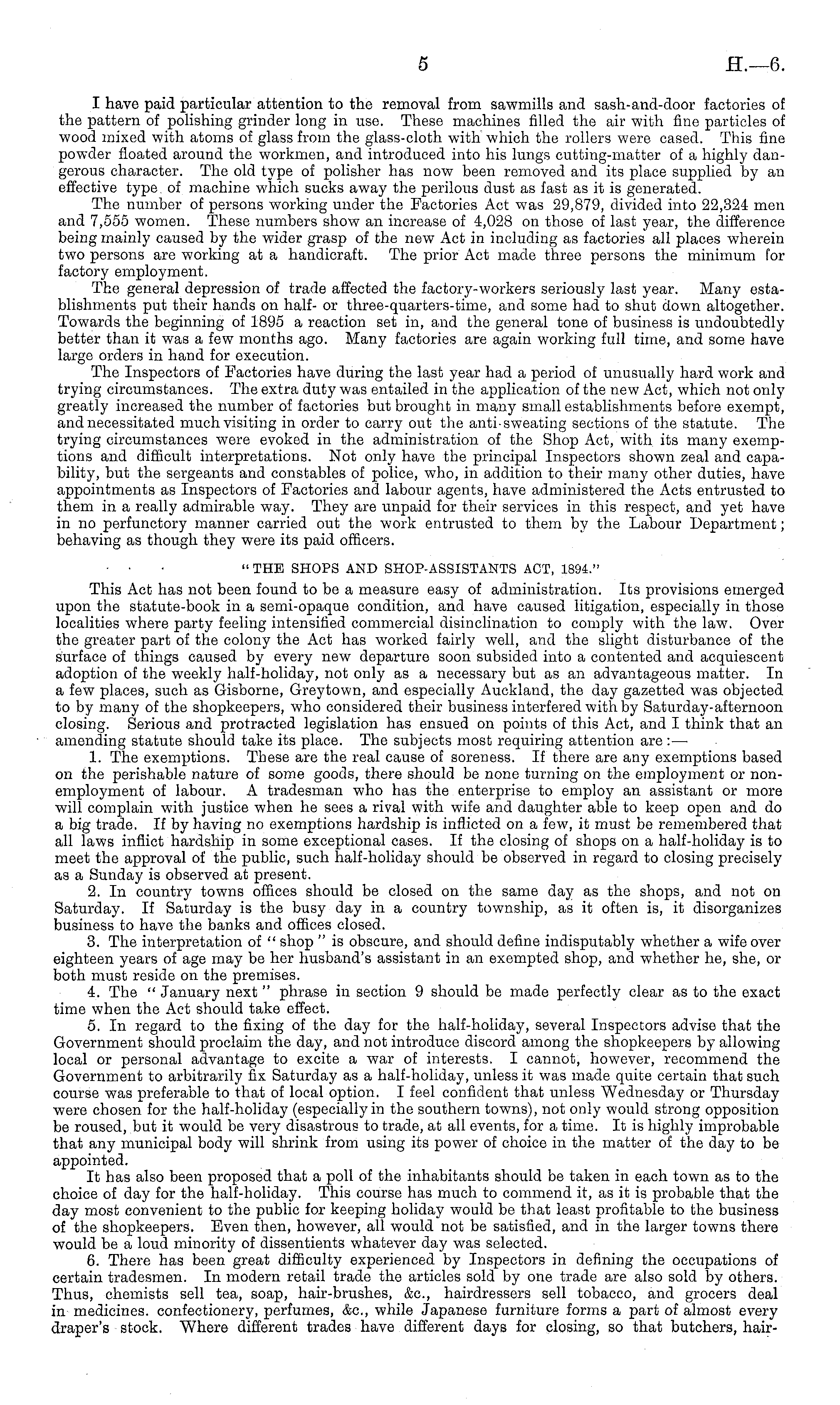 I have paid particular attention to the removal from sawmills and sash-and-door factories of the pattern of polishing grinder long in use. These machines filled the air with fine particles of wood mixed with atoms of glass from the glass-cloth with which the rollers were cased. This fine powder floated around the workmen, and introduced into his lungs cutting-matter of a highly dangerous character. The old type of polisher has now been removed and its place supplied by an effective type, of machine which sucks away the perilous dust as fast as it is generated. The number of persons working under the Factories Act was 29,879, divided into 22,324 men and 7,555 women. These numbers show an increase of 4,028 on those of last year, the difference being mainly caused by the wider grasp of the new Act in including as factories all places wherein two persons are working at a handicraft. The prior Act made three persons the minimum for factory employment. The general depression of trade affected the factory-workers seriously last year. Many establishments put their hands on half- or three-quarters-time, and some had to shut down altogether. Towards the beginning of 1895 a reaction set in, and the general tone of business is undoubtedly better than it was a few months ago. Many factories are again working full time, and some have large orders in hand for execution. The Inspectors of Factories have during the last year had a period of unusually hard work and trying circumstances. The extra duty was entailed in the application of the new Act, which not only greatly increased the number of factories but brought in many small establishments before exempt, and necessitated much visiting in order to carry out the anti-sweating sections of the statute. The trying circumstances were evoked in the administration of the Shop Act, with its many exemptions and difficult interpretations. Not only have the principal Inspectors shown zeal and capability, but the sergeants and constables of police, who, in addition to their many other duties, have appointments as Inspectors of Factories and labour agents, have administered the Acts entrusted to them in a really admirable way. They are unpaid for their services in this respect, and yet have in no perfunctory manner carried out the work entrusted to them by the Labour Department; behaving as though they were its paid officers. " THE SHOPS AND SHOP-ASSISTANTS ACT, 1894." This Act has not been found to be a measure easy of administration. Its provisions emerged upon the statute-book in a semi-opaque condition, and have caused litigation, especially in those localities where party feeling intensified commercial disinclination to comply with the law. Over the greater part of the colony the Act has worked fairly well, and the slight disturbance of the surface of things caused by every new departure soon subsided into a contented and acquiescent adoption of the weekly half-holiday, not only as a necessary but as an advantageous matter. In a few places, such as Gisborne, Greytown, and especially Auckland, the day gazetted was objected to by many of the shopkeepers, who considered their business interfered with by Saturday-afternoon closing. Serious and protracted legislation has ensued on points of this Act, and I think that an amending statute should take its place. The subjects most requiring attention are: — 1. The exemptions. These are the real cause of soreness. If there are any exemptions based on the perishable nature of some goods, there should be none turning on the employment or nonemployment of labour. A tradesman who has the enterprise to employ an assistant or more will complain with justice when he sees a rival with wife and daughter able to keep open and do a big trade. If by having no exemptions hardship is inflicted on a few, it must be remembered that all laws inflict hardship in some exceptional cases. If the closing of shops on a half-holiday is to meet the approval of the public, such half-holiday should be observed in regard to closing precisely as a Sunday is observed at present. 2. In country towns offices should be closed on the same day as the shops, and not on Saturday. If Saturday is the busy day in a country township, as it often is, it disorganizes business to have the banks and offices closed. 3. The interpretation of " shop " is obscure, and should define indisputably whether a wife over eighteen years of age may be her husband's assistant in an exempted shop, and whether he, she, or both must reside on the premises. 4. The " January next " phrase in section 9 should be made perfectly clear as to the exact time when the Act should take effect. 5. In regard to the fixing of the day for the half-holiday, several Inspectors advise that the Government should proclaim the day, and not introduce discord among the shopkeepers by allowing local or personal advantage to excite a war of interests. I cannot, however, recommend the Government to arbitrarily fix Saturday as a half-holiday, unless it was made quite certain that such course was preferable to that of local option. I feel confident that unless Wednesday or Thursday were chosen for the half-holiday (especially in the southern towns), not only would strong opposition be roused, but it would be very disastrous to trade, at all events, for a time. It is highly improbable that any municipal body will shrink from using its power of choice in the matter of the day to be appointed. It has also been proposed that a poll of the inhabitants should be taken in each town as to the choice of day for the half-holiday. This course has much to commend it, as it is probable that the day most convenient to the public for keeping holiday would be that least profitable to the business of the shopkeepers. Even then, however, all would not be satisfied, and in the larger towns there would be a loud minority of dissentients whatever day was selected. 6. There has been great difficulty experienced by Inspectors i