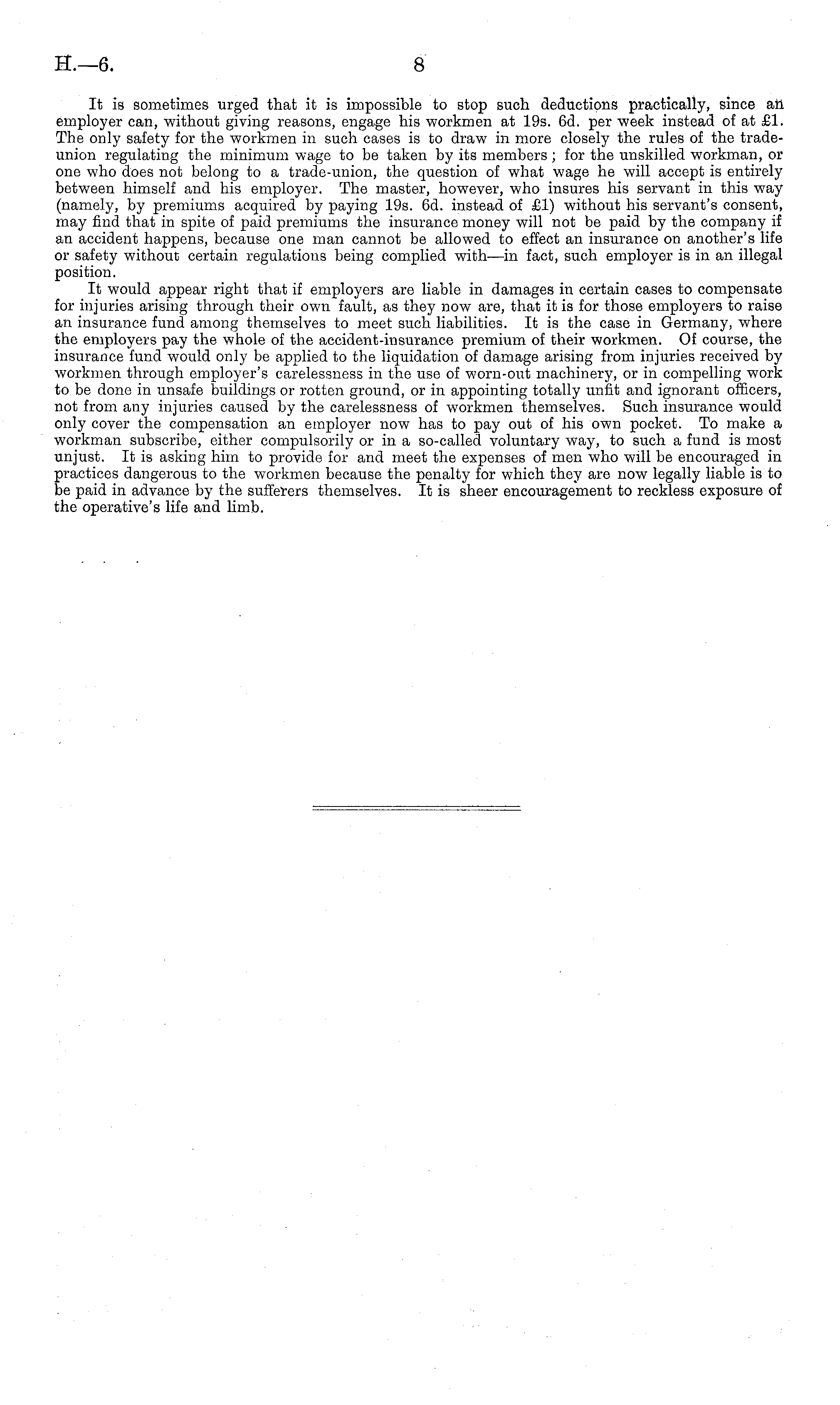 It is sometimes urged that it is impossible to stop such deductions practically, since ail employer can, without giving reasons, engage his workmen at 19s. 6d. per week instead of at £1. The only safety for the workmen in such cases is to draw in more closely the rules of the tradeunion regulating the minimum wage to be taken by its members ; for the unskilled workman, or one who does not belong to a trade-union, the question of what wage he will accept is entirely between himself and his employer. The master, however, who insures his servant in this way (namely, by premiums acquired by paying 19s. 6d. instead of £1) without his servant's consent, may find that in spite of paid premiums the insurance money will not be paid by the company if an accident happens, because one man cannot be allowed to effect an insurance on another's life or safety without certain regulations being complied with—in fact, such employer is in an illegal position. It would appear right that if employers are liable in damages in certain cases to compensate for injuries arising through their own fault, as they now are, that it is for those employers to raise an insurance fund among themselves to meet such liabilities. It is the case in Germany, where the employers pay the whole of the accident-insurance premium of their workmen. Of course, the insurance fund would only be applied to the liquidation of damage arising from injuries received by workmen through employer's carelessness in the use of worn-out machinery, or in compelling work to be done in unsafe buildings or rotten ground, or in appointing totally unfit and ignorant officers, not from any injuries caused by the carelessness of workmen themselves. Such insurance would only cover the compensation an employer now has to pay out of his own pocket. To make a workman subscribe, either compulsorily or in a so-called voluntary way, to such a fund is most unjust. It is asking him to provide for and meet the expenses of men who will be encouraged in practices dangerous to the workmen because the penalty for which they are now legally liable is to be paid in advance by the sufferers themselves. It is sheer encouragement to reckless exposure of the operative's life and limb.