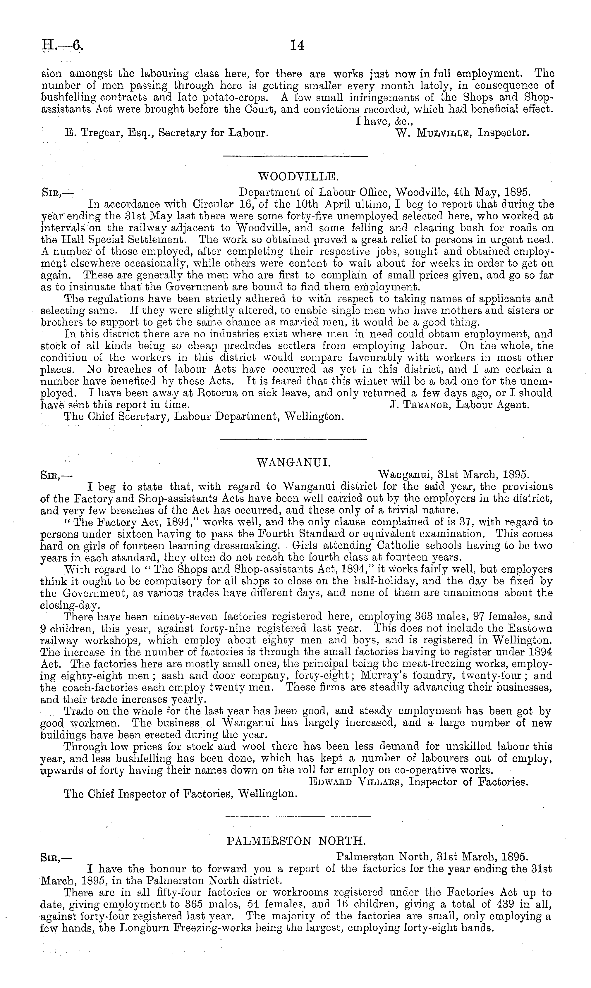 WOODVILLE. Sib, — Department of Labour Office, Woodville, 4th May, 1895. In accordance with Circular 16, of the 10th April ultimo, I beg to report that during the year ending the 31st May last there were some forty-five unemployed selected here, who worked at intervals on the railway adjacent to Woodville, and some felling and clearing bush for roads on the Hall Special Settlement. The work so obtained proved a great relief to persons in urgent need. A number of those employed, after completing their respective jobs, sought and obtained employment elsewhere occasionally, while others were content to wait about for weeks in order to get on again. These are generally the men who are first to complain of small prices given, and go so far as to insinuate, that the Government are bound to find them employment. The regulations have been strictly adhered to with respect to taking names of applicants and selecting same. If they were slightly altered, to enable single men who have mothers and sisters or brothers to support to get the same chance as married men, it would be a good thing. In this district there are no industries exist where men in need could obtain employment, and stock of all kinds being so cheap precludes settlers from employing labour. On the whole, the condition of the workers in this district would compare favourably with workers in most other places. No breaches of labour Acts have occurred as yet in this district, and I am certain a number have benefited by these Acts. It is feared that this winter will be a bad one for the unemployed. I have been away at Eotorua on sick leave, and only returned a few days ago, or I should have sent this report in time. J. Teeanoe, Labour Agent. The Chief Secretary, Labour Department, Wellington.