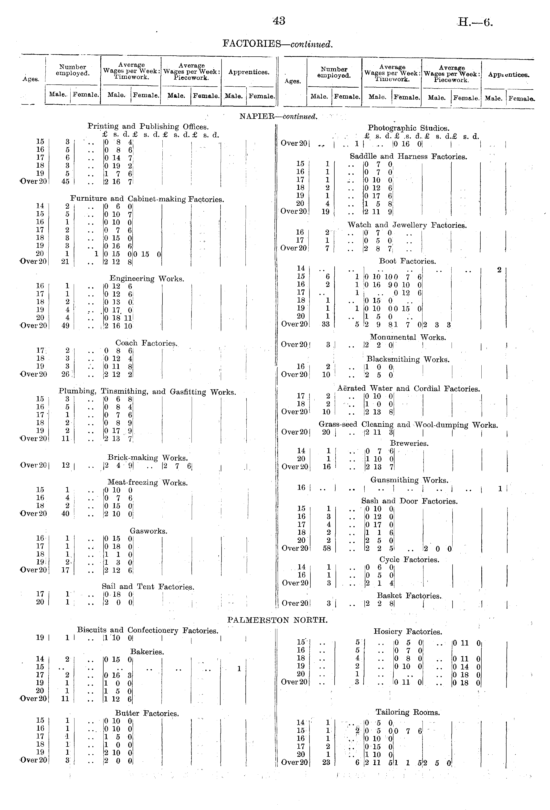 j Ages, I Number employed. Average Wages per Week: Time work. Average Wages per Week: Piecework. Apprentices. Number employed. Average Wages per Week: Time work. Average Wages per Week: Piecework. Ages. Appi «nt ices. Male. Female. Male. I Female. Male. Female. Male. Female. Male. Female. Malo. I Female. Male. Female. Male. ! Female. NAPIER -continued. v/. 15 16 17 18 19 Over 20 3 5 6 3 6 45 Printing and Publishing Offices. £ a. a. £ s. cl. £ s. d. £ s. d. " .. 0 8 4 .. 0 8 6 .. 0 14 7 .. 0 19 2 .. 17 6 .. 2 16 7! I Publii e s. a. ihing Offices. £ s. d. £ s. d. i : Photographic Studios. . . & s. d. & .a. d. £ s. d.£ s. d. Over20| .„ j ,. 1 | .. ,0 16 01 studios. £ s. d. .£ s. d. 3 5 6 3 5 45 I I ; Saddlle and Harness Factories. 15 1 ..070 16 1 ..070 17 1 ... 0 10 0 18 2 .. 0 12 6' 19 1 .. 0 17 6 1 20 4 ..15 8; Over20 19 .. 2 11 9 ! 18 Factc iries. I 14 16 16 17 18 19 20 •Over 20 F ?! o 1 2 3 3 1 21 2 5 1 2 3 3 1 21 'urniture and Cabinet-making Factorie: .. 0 6 01 .. 0 10 7 .. 0 10 0 ..076 .. 0 15 0 .. 0 16 6 1 0 15 0 0 15 0 .. 2 12 8 labinetnaking Factories. JS. t. Watch and Jewellery Factories. 16 2"| .. j0 7 0 17 1 ..050 Over20 7 ..287 •y Pact. iries. Boot Factories. ■ies. 16 17 18 19 20 Over 20 1 1 2 4 f 4 49 1 1 2 4 4 49 Engineering Works. .. i0 12 6 .. 0 12 6: .. 0 ]3 0 .. 0 17 0 .. 0 18 11 .. 2 16 10 "orks. 14 I .. .. I .. .. .. j .. 2 15 6 1 0 10 10 0 7 6 16 2 10 16 9 0 10 0| 17 .. 1 .. 0 12 6 18 1 .. JO 15 0 19 1 1 0 10 0 0 15 0 20 1 ..150.. Over20 83 5 2 9 81 7 0 2 8 3 17 18 1!) Over 20 2 3 26; Coach Factories. .. 0 8 6| .. 0 12 4 ! .'. !0 11 8| .. j2 12 2] >ries.. Monumental Works. Over 20.1 3 I .. 12 2 01 I | I Blacksmithing Works. 16 j 2 ; ..,10 0 Over 20 10 ..'250 15 16 17 ' 18 19 Over 20 Plun 3 5 1 2 2 11 nbing, Tinsmithing, and Gasfitting Wi .. 0 6 8 ..084 ..076 ..089 .. 0 17 9 .. 2 13 7 Gasfitting We r orks. >rks. Aerated Water and Cordial Factories. 17 2 i .. 0 10 0 18 2 ..100 Over 20 10 .. 12 13 8 Grass-seed Cleaning and Wool-dumping Works. Over20j 20 | .. |2 11 3[ | j j Breweries. 14 II ..076 20 1 .. 1 10 0 OveriiO 16 I .. 2 13 7 Over 201 12 I I Brick-making Works. .. |2 4-'9) .. |2 7 6j .1 ■!.- ,1 .1, 15 16 18 Over 20 1 4 2 40 Meat-freezing Works. .. |0 10 0 .. • 0 7 6 .. o is o: .. 2 10 0 Gunsmithing Works. 16 I .. I .. I ..| .. I .. I .. I 1( Sash and Door Factories. 15 1 .. 0 10 0, 16 3 .. 0 12 01 17 4 .. 0 17 0! 18 2 ..116| 20 2 ..250 Over 20 58 ..225 ..200 ■ 16 17 18 19 Over 20 1 1 1 217 Gasworks. .. 0 15 0 .. 0 18 0 ..110 ..130 .. 2 12 6; Cycle Factories. 14 1 ..060 16 1 ..050 Over20 3 ..214 ie Facti 17 20 1 1 Sail and Tent Factories. .. 10 18 0 .. |2 0 0| Basket Factories. Over20| 3 ( .. ]2 2 8| | | ,| 19 I 1 I Biscuits and Confectionery Factories. ... II10 01 I J PALMERS' 'l I }N NORTH. Hosiery Factories. 15 .. 5 .. 0 5 0 .. 0 11 0 16 5 .. |0 7 0 18 .. 4 1. 0 . 8. 0 .. 0 11 0 19 .. 2 .. !o 10 0 .. 0 14 0 20 1 0 18 0 Over20 .. 3 .. i0 11 0 .. 0 18 0 14 15 17 19 20 Over 20 2 2 1 1 11 2 2 1 1 11 Bakeries. .. 0 15 0 '.'. 0 Iβ' 3 ..100 .. 15 0 .. 1 12 6 1 15 16 17 18 19 Over 20 1 1 ■1 1 1 3 1 1 ■1 1 1 3 Butter Factories. .. 0 10 0| ... ;0 10 0 ..150 ..100 .. 2 10 0 .. 2 0 0 !r Facti >ries. Tailoring Rooms. 14 1 .. 0 5 0 15 1 2 0 5 0 0 7 6' 16 1 ..' 0 10 0 17 2 .. 0 15 0 20 1 .. 1 10 0 Over20 23 6 2 11 51 1 5 ! 2 5 0
