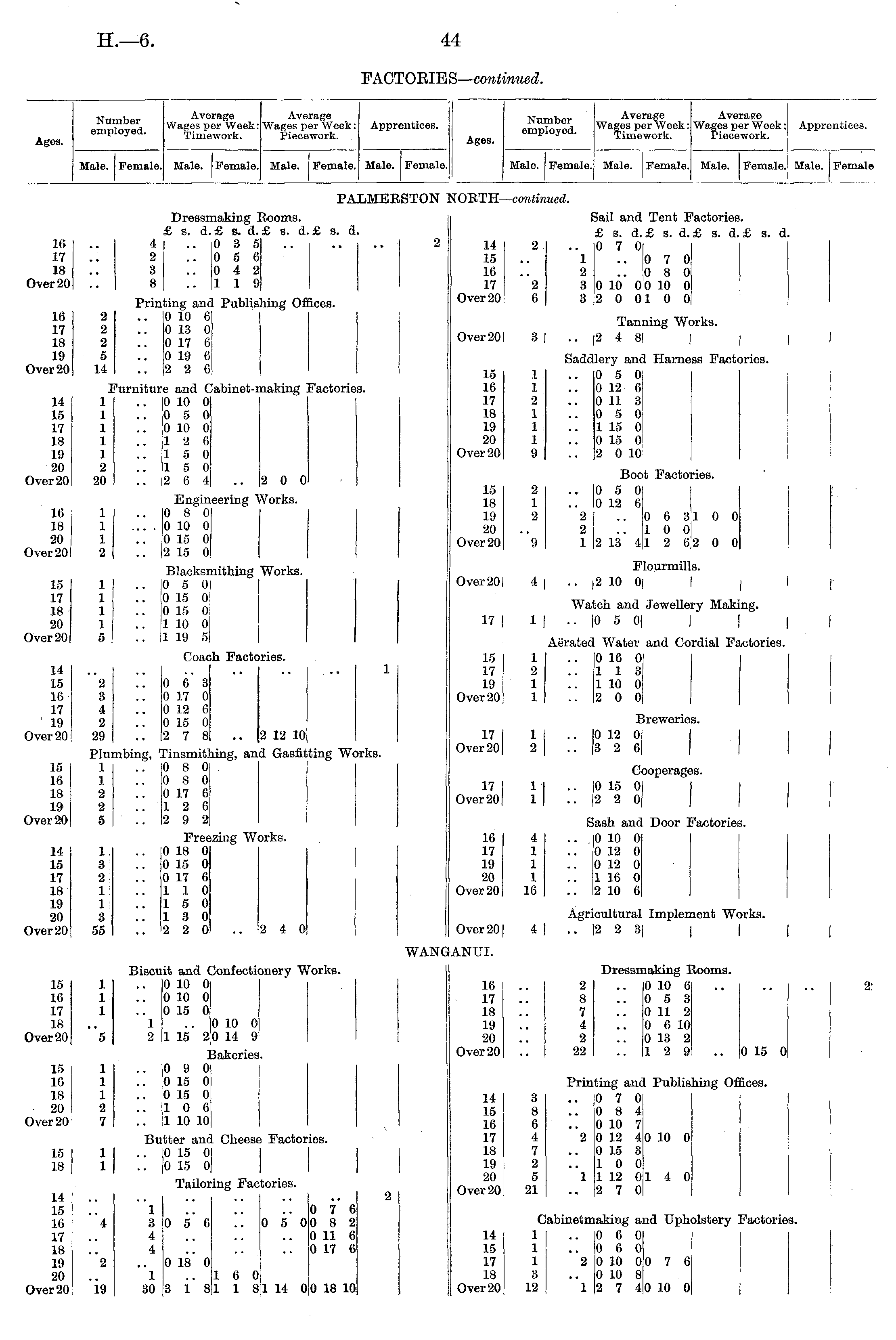 Number employed. Average Wages per Week: Time work. Average Wages per Week: Piecework. Apprentices. Number employed. Average Wages per Week: Timework. Average Wages per Week: Piecework. Apprentices. Ages. Ages. Male. Female. Male. Female. Male. Female. Male. Female. Male. Female. Male. Female. Male. Female. Male. Female palme: ,STON NORTH—, -continued. ■onti , , ',ed. 16 17 18 Over 20 4 2 3 8 Dressmaking ] £ s. d.£ s. d. ..035 f\ et O ..056 Ft i n naking I £ s. d. 0 3 5 0 5 6 0 4 2 119 Rooms. £ s. d. £ s. a. 2 14 15 16 17 Over 20 Sail and Tent Factories. £ s. d.£ s. d.£ s. d.£ s. d. 2 ..070 1 ..070 2 ..080 2 3 0 10 00 10 0 6 3 2 0 01 0 0 2 factories £ s. d. i» .£ s. d, ..042 -1 t n "'2 6 ..119 16 17 18 19 Over 20 2 2 2 5 14 1 Priniting and Publis 0 10 6 0 13 0 0 17 6 0 19 6 2 2 6 1 Publisl Ling O: ices. Over 201 Tanning Works. 3 I .. |2 4 81 I 1 orks. I I 15 16 17 18 19 20 Over 20 Saddlery and Harness Factories. 1 .. 0 5 01 1 .. 0 12 6! 2 .. 0 11 3| 1 ..050 1 .. 1 15 0| 1 .. 0 15 0! 9 .. 2 0 10 I iss Fact* iries. 14 15 17 18 19 20 Over 20 ] 1 1 1 1 1 2 20 'urnitur< 1 •• I •e and Cabinet-r 10 10 0 0 5 0 0 10 0 12 6 15 0 15 0 2 6 4 iabinet-: laking 'actorii is. 1 1 2 1 1 1 9 Boot Factories. 2 0 0 15 18 19 20 Over 20 2 ..050 1 .. 0 12 6 2 2 .. 0 6 31 0 0 2 ..100 9 12 13 4126200 16 18 20 Over 20 1 1 1 2 Engineering ~\ 0 8 0 0 10 0 0 15 0 2 15 0 Leering iVorks. 15 17 18 20 Over 20 1 1 1 1 5 Blacksmithing 0 5 0| I 0 15 0 0 15 01 1 10 0 1 19 5 lithing Works. Over 201 Flourmills. 4 1 .. |2 10 0| I 1 r .. ' .. I 17| Watch and Jewellery Making. 1 I .. |0 8 0| I ! 1 .. I 14 15 16 17 ' 19 J Over 20 i 2 3 4 2 29 Coach Facto 0 6 3 0 17 0 0 12 6 0 15 0 2 7 8 ;h Fact* iries. 15 17 19 Over 20 Aerated Water and Cordial Factories. 1 .. 0 16 01 2 ..113 1 .. 1 10 0 1 .. 2 0 0| .. .. Breweries. .. 2 12 10 17 Over 20 1 .. 0 12 0 I 2 ..326 I 15 16 18 19 Over 20 Plu: 1 1 2 2 5 Lbing, 3 1 1 I rinsmithing, ani 0 8 0 0 8 0 0 17 6 12 6 2 9 2 ting, an* d Gasfiiting W< >rks. 17 Over 20 Cooperages. II .. 0 15 0 1 I .. 2 2 0 is. 1 14 15 17 18 19 20 Over 20 1 3 2 1 1 3 55 I Freezing W< 0 18 0 0 15 0 0 17 6 110 15 0 13 0 2 2 0 izing Wi irks. 16 17 19 20 Over 20 Sash and Door Factories. 4 .. 0 10 0 1 .. 0 12 0 1 .. 0 12 0 1 .. 1 16 0 16 .. 2 10 6 .. I .. I Over 201 Agricultural Implement Works. i I ... 12 2 8| I I 1 4 2 4 0 Bisou: lit and Confecti< 0 10 0 0 10 0 0 15 0 onery Y\ WAN tANUI. 15 16 17 18 Over 20 1 1 1 'orks. 16 17 18 19 20 Over 20 Dressmaking Rooms. 2 .. 0 10 6 8 ..053 7 .. 0 11 2 4 .. 0 6 10 2 .. 0 13 2 22 ..129 .. 0 15 0 2: 1 "5 1 1 2 .. 0 10 0 1 15 20 14 9 15 16 18 20 Over 20 1 1 1 2 7 Bakeries 0 15 0 1 0 9 0 0 15 0 0 15 0 10 6 [l 10 10 14 15 16 17 18 19 20 Over 20 Printing and Publishing Offices. 3 ..070 8 ..084 6 .. 0 10 7 4 2 0 12 40 10 0 7 .. 0 15 3 2 ..100 5 11 12 0140 21 ..270 fices. 1 15 18 1 1 .. I Bui itter and Cheese 10 15 0 |0 15 0 1 Cheese ) Factor: ies. 3 8 6 4 7 2 5 21 •• I •• I Tailoring Fac :ing Fad tories. 14 15 16 17 18 19 20 Over 20 "4 1 3 4 4 0 56 '.'. 0 5 0 0 7 6 0 8 2 0 11 6 0 17 6 14 15 17 18 Over 20 Cabinetmaking and Upholstery Factories. 1 ..060 1 ..060 1 20 10 0076 3 .. 0 10 8 12 1 2 7 40 10 0 )lstery 'aotorii "2 "l 30 0 Iβ' 0 1 /? l"\ i9 ..160 3 1 81 1 8 16 0 118 1 14 0 0 18 10