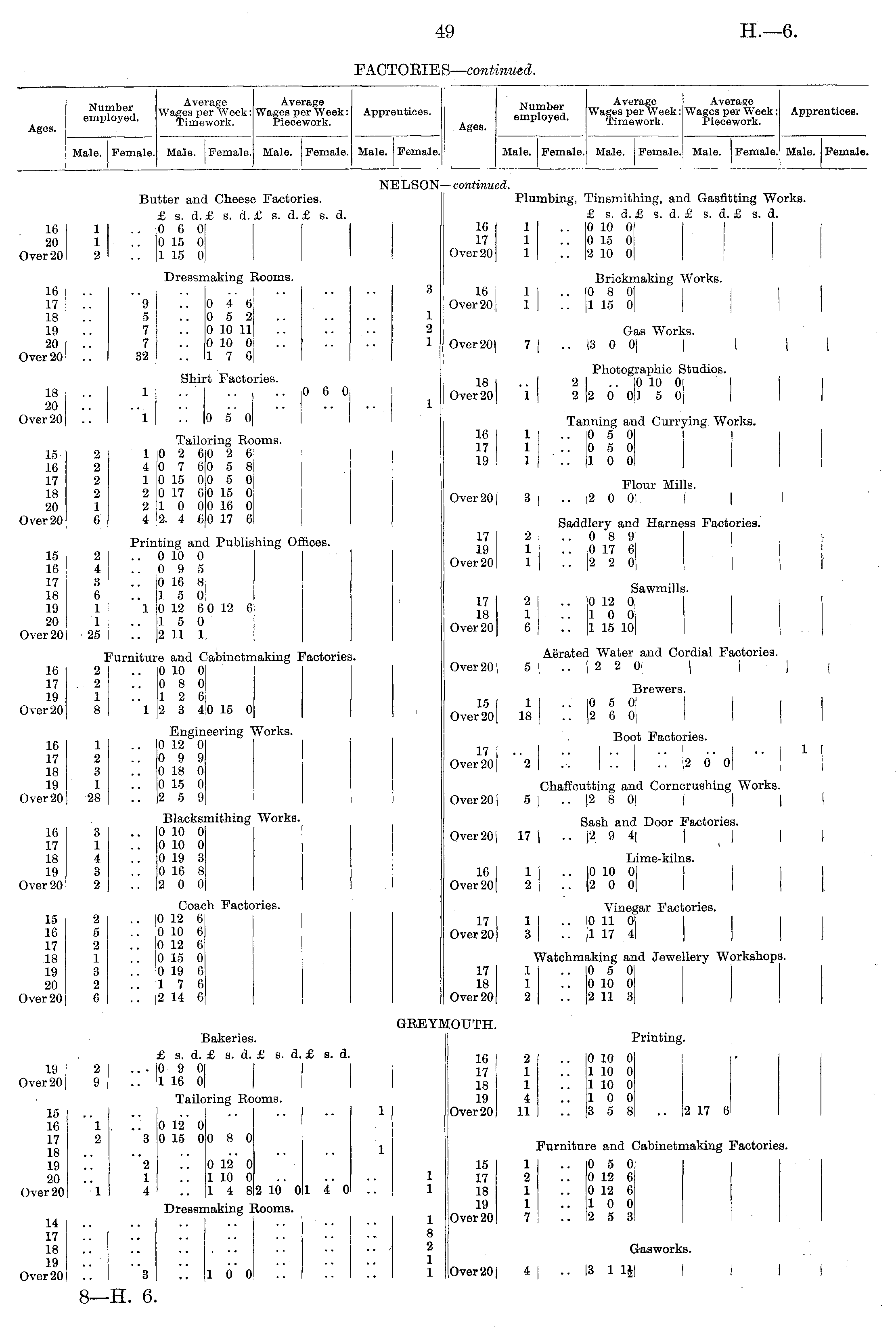 Average Wages per Week: Timework. Average Wages per Week: Piecework. j Number employed. Average Wages per Week: Timework. Average Wages per Week: Piecework. Number employed. Apprentices. Apprentices. Ages. Ages. Male. Female. Male. Female. Male. Female. Male. Female. Male. Female. Male. Female. Male. Female. Male. Female. LSON -continue ed. 16 20 Over 20 1 1 2 Butter and Cheese Factoi £ s. d. £ s. d. £ s. d. .. 0 6 0! .. 0 15 0 .. 1 15 0 Cheesi . s. d. 3 Factori £ s. d.; >ries. . £ s. d. ies. E s. d. 16 17 Over 20 Plumbing, Tinsmithing, and Gaafitting Works. £ s. d.£ s. d. £ s. d. £ s. d. 1 .. 0 10 0! 1 .. 0 15 0 1 .. 2 10 0 16 17 18 19 20 Over 20 Dressmaking Rooms. 16 Over 20 Brickmaking Works. 1 ..080 1 .. 1 15 0 9 ..0 4 6! 5 .. 0 5 2| .. 7 .. 0 10 111 .. 7 .. 0 10 0 32 .. 1 7 6j 3 1 2 1 Over20( Gas Works. 7 I .. 18 0 0| I II I 18 20 Over 20 Shirt Factories. 1 .. ... 1 .. 0 5 0| ,0 6 0 18 Over 20 Photographic Studios. 2 .. JO 10 0 I 1 2 2 0 0|l 5 0 15 16 17 18 20 Over 20 2 2 2 2 1 6 Tailoring Booms. 1 0 2 60 2 6 4 0 7 60 5 8 1 0 15 0 0 5 0| 2 0 17 6 0 15 0 2 1 0 0 0 16 0 4 2. 4 B0 17 6 16 17 19 Tanning and Currying Works. 1 .. 0 5 01 1 .. 0 5 0! 1 .. IOO! Over 201 Flour Mills. I 3 1 .. |2 0 01 I I 15 16 17 18 19 20 Over 20 i ■ 2, 2 4 6 I l ! 1 25 I Printing and Publishing O: .. 0 10 0, .. 0 9 5! .. 0 16 8 ..150 1 0 12 6 0 12 6 ..150 .. 2 11 I 1 ihing O: )moes. Lees. 17 19 Over 20 Saddlery and Harness Factories. 2 .. ,0 8 9| 1 .. 0 17 6 1 ..220 2 4 3 6 1 1 ■ 25 17 18 Over 20 Sawmills. 2 .. 0 12 Oj 1 ..100 6 .. 1 15 10| 0 12 6 16 17 19 Over 20 2 2 1 8 F 2 2 1 8 furniture and Cabinetmaking '. .. 0 10 0 ..080 .. 1 2 6j 1 2 3 4k> 15 0 3abinetmaking ( 0 15 0 Factories. 'actoriei Over 201 Aerated Water and Cordial Factories. I 5 I .. I 2 2 0[ \ ) I 15 Over 20 Brewers. 1 ..050 18 ..260 16 17 18 19 Over 20 2 1 2 3 1 28 Engineering Works. .. 0 12 0 ..099 .. 0 18 0 .. 0 15 0 .. 2 5 9 leering Works. 17 Over 20 Boot Factories. 1 2 .-. ..200 1 2 3 1 28 Over 201 Chaffcutting and Corncrushing Works. i 5 I .. |2 8 0| I I 16 17 18 19 Over 20 3 1 4 3 2 3 1 4 3 2 Blacksmithing Works. .. 0 10 0 .. 0 10 0 .. 0 19 3 .. 0 16 8 ..200 tithing Works. ;. Over 201 16 Over 20 Sash and Door Factories. i 17 I •• |2 9 4| 1,1 I Lime-kilns. 1 .. 0 10 0 2 ..200 15 16 17 18 19 20 Over 20 15 2 16 5 17 2 18 1 19 3 20 2 Over 20 6 2 5 2 1 3 2 6 Coach Factories. .. i0 12 6 .. 0 10 6 .. 10 12 6 .. !0 15 0 .. 0 19 6 ..176 .. 2 14 6 ;h Fact' iries. 17 Over 20 17 18 Over 20 Vinegar Factories. 1 .. 0 11 0 3 .. 1 17 4 Watchmaking and Jewellery Workshops. 1 .. 0 5 01 1 .. 0 10 0 2 .. 2 11 3 2 9 Bakeries. £ s. d. £ s. d. £ s. d ... 0 9 0 .. 1 16 0 1. £ s. d. grey: £OUTH. Printing. 19 J 2 Over 20 J 9 £ s. d. £ s. d. 10ms. 16 I 17 18 19 Over 20 I 2 .. 0 10 0 1 .. 1 10 0 1 .. 1 10 0 4 ..100 11 ..358 .. 2 17 6 ! Tailoring Booms. 1 15 16 1 ... 17 2 3 18 19 2 20 1 Over 20 1 4 'l . 2 .. 0 12 0 3 0 15 0 0 8 0 2 17 6 1 Furniture and Cabinetmaking Factories. naking ] 'aotoriei 1 2 .. 0 12 0 1 .. 1 10 0 4 .. 1 4 82 10 C 014 0 1 15 17 18 19 Over 20 1 ..050 2 .. 0 12 6 1 .. 0 12 6 1 ..100 7 ..253 I. 2 10 01 4 0 140 1 1 14 17 18 19 Over 20 .. 3 Dressmaking Booms. Rooms. I 1 8 2 1 1 "3 '.'. 100 Gasworks. Over 201 I i I •• 13 1 ljl I I I 8—H. 6