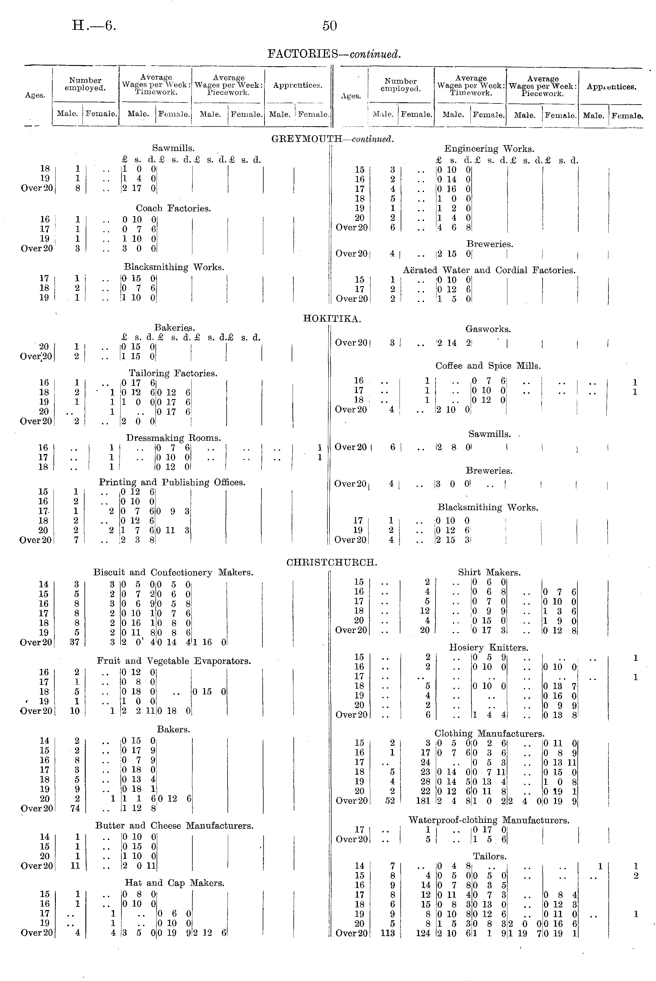 Number employed. Average Wages per Week: Timework. Average Wages per Week: Piecework. Apprentices. Ages. Number employed. Average Wages per Week: Timework. Average Wages per Week: Piecework. Appi entices. Ages. Male, j Female. Male. I Female. Male, j Female. I Male, i Female. Male. Female. Male. Female. Male. Female. Male. Female. _ j I GKEYMOU' HH— continued. 18 19 Over 20 1 1 8 S £ s. a. ..100 ..140 .. 2 17 0 Sawmills. . £ s. d. £ s. a. £ s. a. I I I »~*i -*— ™ ■ i" *--•-*- t~j Engineering Works. £ s. d. £ s. a. £ s. d. £ 15 3 .. ;0 10 0 16 2 .. '0 14 0 17 4 .. 0 36 0 18 5 .. |l 0 0 19 1 ..120 20 2 ..140 Over20 6 ..468 teering "\ . £ s. a. forks. £ s. d. £ s. d i S. I a. Coaa jh Factories. 16 17 19 Over 20 1 1 1 3 .. 0 10 0: ..076 .. 1 10 0 .. 3 0 0 II I I I Breweries. Over20| 4 j .. |2 15 0| [ ireweriei IS. I 17 18 19 1 2 1 Blacksn .. ;0 15 0| .. 0 7 6 .. II 10 0 mithing Works. Aerated Water ana Coraial Fact 15 [ 1 j .. ;0 10 0 17 2 .. !0 12 6 Over20! 2 ..150 ana Co: irdial Factories. tories s. 'I HOK :tika. 20 Over'20 1 I 2 I I £ s. d. .. i0 15 0 .. ll 15 0 £ s. d. £ s. d.£ s. d. Gasworks. Over20| 3 I .. 2 14 2! I Coffee ana Spice Mills. 16 18 19 20 Over 20 1 2 1 2 Tailori .. ,0 17 6 • 1 k> VI 61 1 1 0 01 1 ..I ..200 ing Factories. 0 12 61 0 17 6 0 17 6 16 .. 1 I ..076 17 .. 1 .. 0 10 0 18 I .. 1 0 12 0 Over20 4 .. 2 10 0| 1 1 Dressm naking Booms. 0 7 6.. 0 10 0 0 12 0 .. I 1 Sawmills. . 16 17 18 •• I I 1 I .. ( 1 I .. ( 1 I ( 1 1 Over20 I 6 I .. 12 8 0' I ,1 Breweries. 15 16 17 18 20 Over 20 1 2 1 2 2 7 Printing and .. 0 12 6 .. 0 10 0 2 0 7 6( .. 0 12 6 2 1 7 6( .. |2 3 8 1 Publishing Offices. ices. Over20, 4 | .. |3 0 0 1 .. | 0 9 3 Blacksmithing Works. 0 11 3 17 1 .. 0 10 0 19 2 JO 12 6 Over 20 4 .. 12 15 3 : 14 15 16 17 18 19 Over 20 3 5 8 8 8 5 37 Biscuit and O 3 0 5 Oi 2 0 7 21 3 0 6 9i 2 0 10 li 2 0 16 li 2 0 11 81 3 2 0' 4i Confectionery Makers. 0 5 0 0 6 0 0 5 81 0 7 6 0 8 0 0 8 6 0 14 41 16 0 iakers. CHEIST CHBIST 3HUKCH. Shirt Makers. 15 2 .. 10 6 0 16 .. 4 ..068 .. 0 17 .. 5 ..070 .. 0 18 .. 12 ..099 .. 1 20 .. 4 .. 0 15 0 .. 1 Over20 .. 20 .. 0 17 3 ..0 31'S. ..076 .. 0 10 0 ..136 ..190 .. 0 12 8 7 10 3 9 12 6 0 6 0 8 1 16 0 Hosiery Knitters. 15 .. 2 ..059 16 .. 2 .. 0 10 0 ..0 17 18 .. 5 .. 0 10 0 ..0 19 4 .. .. .. 0 20 2 .. .. .. 0 Over20 .. 6 ..144 .. 0 tters. 10 13 16 9 13 0 7 0 9 8 ! 1 1 16 17 18 - 19 Over 20 2 ] 1 5 1 10 Fruit ana Ve .. 0 12 0 ..080 .. 0 18 0 ..100 1 2 2 11 egetable Evaporators. E vapor: ttors. '.'. 0 16" 0 1 1 .. 0 15 0 i 0 15 0 • . 1 .. 0 13 7 .. 0 16 0 ..099 .. 0 13 8 ! i 0 18 0 14 15 16 17 18 19 20 Over 20 2 2 8 3 5 9 2 74 .. |0 15 0, .. (0 17 9 .. 0 7 9; .. 0 18 0 1 .. 0 13 4' .. 0 18 1 1116 .. 1 12 8 Bakers. Clothing Manufacturers. 15 2 1 3 |0 5 00 2 6 .. 0 16 1 17 0 7 60 3 6 .. 0 17 .. 24 ..053 .. 0 18 5 23 0 14 00 7 11 ..0 19 4 28 ! 0 14 5 0 13 4 ..1 20 2 22 ,0 12 6j0 11 8 ..0 Over20 52 181 \2 4 s|l 0 22 4 00 acturers. 11 8 13 1 15 0 19 19 0 9 11 0 8 1 9 2 2 8 3 5 9 2 74 2 1 5 4 2 52 3 I 17 24 23 28 22 181 .. 0 11 0 ..089 .. 0 13 11 .. 0 15 0 ..108 .. 0 19 1 2 4 00 19 9 0 12 6 1 1 1 1] Butter ana C Iheese M ianufact irers. Waterproof-clothing Manufactui 17 .. 1 .. i0 17 0 Over20 .. 5 .. |l 5.6 Water] 1 5 Manufacturers. I Ters. 14 15 20 Over 20 1 1 1 11 .. 0 10 0 .. 0 15 0 .. 1 10 0 .. 2 0 11 Tailors. 7 8 9 8 6 9 5 113 15 16 17 19 Over 20 1 1 "4 1 1 Hat an> ..080 .. 0 10 0 1 1 4 3 5 0 id Cap 1 Makers. 14 i 7 ,, 10 4 8| .. I .. 15 8 4 0 5 0|0 5 0 .. 16 9 14 0 7 8iO 3 5 17 8 12 |0 11 4jO 7 3 .. 0 18 6 15 0 8 310 13 0 ..0 19 9 8 0 10 80 12 6| .. 0 20 5 815308 3J2 000 Over20 113 124 2 10 61 1 91 19 7 0 4 14 12 15 8 8 124 J .. ..084 .. 0 12 3 .. 0 11 0 2 0 0 0 16 6 |1 19 7,0 19 1 8 12 11 16 19 4 3 0 6 1 1 1 1 2 0 6 0 0 10 0 0 19 9 4 2 12 6
