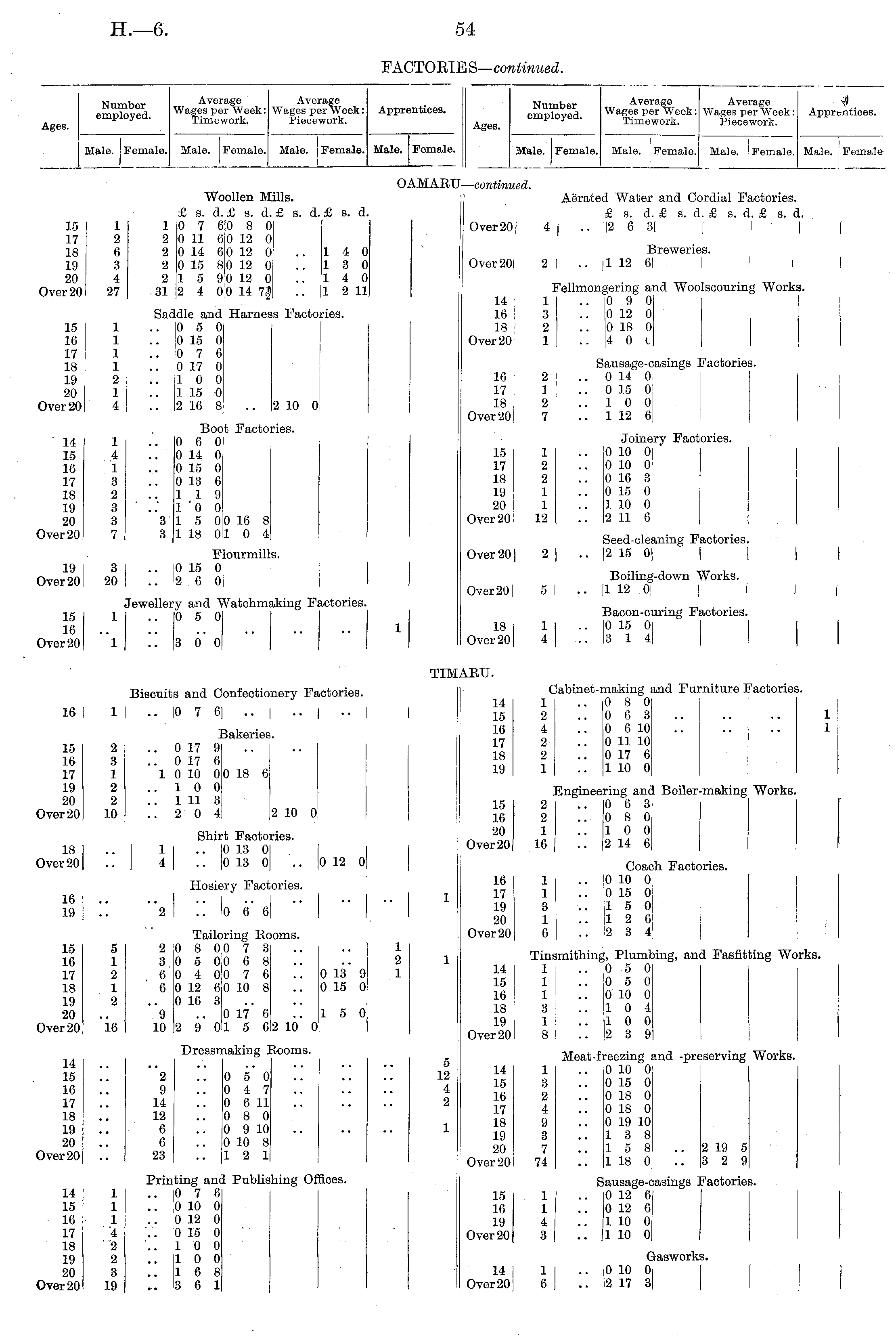 Number employed. Average Wages per Week: Tirnework. Average Wages per Week: Piecework. Apprentices. Number employed. Average Wages per Week: Timework. Average Wages per Week: Piecework. 4 Apprentices. Ages. Ages. Male. Female. Male. Female. Male. | Female. M I Male. 1 Female. I Male. lale. r Female. Male. Female. 1 Male. Female. Male. Female. Male. Female I Woollen Mills. £ s. d. £ s. d. £ s. d. £ s. d. 15 1 1076080 17 2 2 0 11 6 0 12 0 18 6 20 14 60 12 0 ..140 19 3 20 15 80 12 0 ..130 20 4 21590 12 0 ..140 Over20 27 31 2 4 00 14 7f .. 1 2 11 .MARU —continued. ins. Over 201 Aerated Water and Cordial Factories. £ s. d. £ s. d. £ s. d. £ s. d. 4 J .. |2 6 3| I I I I ,£ s. d. 1 £ s. c L. I ) ) t 1 1 1 4 1 1 3 1 1 4 1 12 1 Over 20| Breweries. 2 1 .. 1 1 12 61 I I I I 1 14 16 18 Over 20 Fellmongering and Woolscouring Works. 1 ..090 3 .. 0 12 0 2 .. 0 18 0 1 .. 4 0 1 Saddle and Harness Factories. 15 1 ..050 16 1 .. 0 15 0 17 1 ..076 18 1 j .. 0 17 0 19 2 I ..100 20 1 .. 1 15 0 Over20 4 j .. 2 16 8 .. 2 10 0 is Factoi ries. 16 17 18 Over 20 Sausage-casings Factories. 2 .. 0 14 0 1 I .. 0 15 0 2 ..100 7 .. 1 12 6 2 10 0 Boot Factories. 14 1 ... 0 .6 01 15 4 0 14 01 16 1 .. 0 15 0 17 3 .. 0 13 6 18 2 ..119 19 3 ' ..' 1 '0 0 20 3 3 1 5 0,0 16 8 Over20 7 3 1 18 01 0 4 it Facto) ries. 15 i 17 18 19 20 Over 20 Joinery Factories. 1 .. 0 10 0 2 .. 0 10 0 2 .. 0 16 3 1 .. 0 15 0 1 .. 1 10 0 12 .. 2 11 6 sry Fact' iries. Fkrarmills. 19 3 .. 0 15 0 Over20 20 ..260 Over 201 Seed-cleaning Factories. 2 [ .. |2 15 0| I I I Over 20 Boiling-down Works. 5 ! [1 12 0; I Jewellery and Watchmaking Factories. 15 1 ..050 16 Over20 1 ..300 1 18 Over 20 Bacon-curing Factories. 1 I .. 0 15 0 4 I ..314 OtTJ. ti: Biscuits and Confectionery Factories. 14 15 16 17 18 19 Cabinet-making and Furniture Factories. 1 ..080 2 ..063 4 .. 0 6 10 2 .. 0 11 10 2 .. 0 17 6 1 .. 1 10 0 'actories 1 1 16 I 1 I .. [0 7 6| .. j .. ] .. I Bakeries. 1 -i 4 2 2 1 1 1 15 2 .. 0 17 9 16 3 .. 0 17 6 17 1 1 0 10 00 18 6 19 2 ..100 20 2 .. 1 11 3 Over20 10 ..204 2 10 0 15 16 20 Over 20 Engineering and Boiler-making Works. 2 ..063 2 ..080 1 ..100 16 .. 2 14 6 Works. Boiler■making Shirt Factories. 18 .. 1 .. 0 13 0 Over20 .. 4 .. 0 13 0 .. 0 12 0 2 10 0 ries. 2 2 1 16 Hosiery Factories. 16 j ..I .. 19 2 .. 10 6 6| .. 0 12 0 ;ories. .. 0 12 0 16 17 19 20 Over 20 1 1 3 1 6 Coach Factories. 1 .. 0 10 0i 1 .. 0 15 0 3 .. 1 5 0| 1 ..12 6| 6 ..2 3 4' sh Fact' iries. Tailoring Rooms. 15 5 2080073 16 1 3 0 5 00 6 8 17 2 6 0 4 0 ! 0 7 6 .. 0 13 9 18 1 6 0 12 6 0 10 8 .. 0 15 0 19 2 .. 0 16 3 1 20 .. 9 .. 0 17 6 ..150 Over20 16 10 2 9 01 5 62 10 0 joms. 1 2 1 '.'. 0 13 - 9 .. 0 15 0 1 2 1 14 15 16 18 19 Over 20 Tin: 1 1 1 3 1 8 Tinsmithing, Plumbing, and Fasfitting Works. 1 i .. 0 5 0 1 ..050 1 .. 0 10 0 3 ..104 1 ! ..100 8 ..239 )ing, ani Fasfiti iing Wt >rks. ..150 2 10 0 Dressmaking Eooms. Rooms. 14 15 16 17 18 19 20 Over 20 Meat-freezing and -preserving Works. 1 .. 0 10 0 3 .. 0 15 0 2 .. 0 18 0 4 .. 0 18 0! 9 .. 0 19 10| 3 ..138 7 ..158 .. 2 19 5 74 .. 1 18 0 ..329 md -pri iserving Works. 14 15 .. 2 ..050 16 9 ..047.. 17 .. 14 .. 0 6 11 18 .. 12 ..080 19 6 .. 0 9 10 .. 20 .. 6 .. 0 10 8 Over20 .. 23 ..121 1 1 5 12 4 2 1 3 2 4 9 3 7 74 1 1 shing Offices. 2 19 5 3 2 9 •• Printing and Publishing Offices. 14 II .. 10 7 6 15 1 .. 0 10 0 16 1 .. JO 12 0 17 '4 '.. 0 15 0 18 2 .. il 0 0 19 2 ..100 20 3 ..168 Over20 19 ..361 15 16 19 Over 20 Sausage-casings Factories. 1 .. 0 12 6 1 .. 0 12 6 4 .. 1 10 0 3 .. 1 10 0 /-< l 1 1 4 3 ;asings Factoriei 14 I Over 20 j Gasworks. 1 .. 0 10 0 6 .. 2 17 3 1 6 jasworki 1