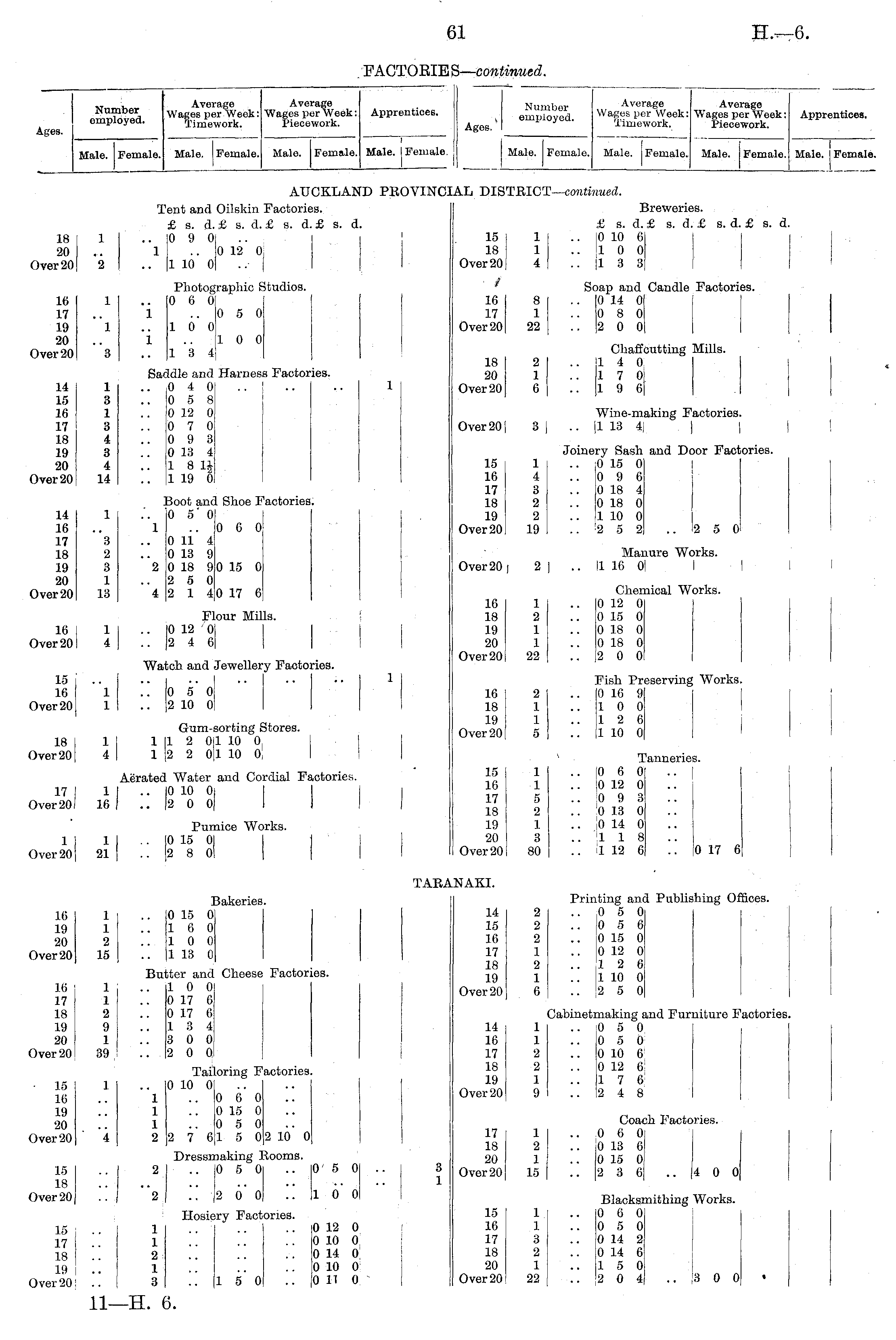 Number employed. Average Wages per Week: Timework. Average Wages per Week: Piecework. Apprentices. Ages. Number employed. Average Wages per Week: Timework. Average Wages per Week: Piecework. Apprentices. Ages. Male. Female. Male. Female. Male. Female. 1 Male. Female. Male. Female. Male. Female. Male. Female. I Male. Female 18 20 Over 20 ATJCKLAN Tent and Oilskin Factories. £ s. d. £ s. d. £ s. d. £ s. d, 1 ..090 .. 1 .. 0 12 0 2 .. 1 10 0 [D PROVING :AL DISTRICT— continued. Breweries. £ s. a. £ s. d. £ s. d. £ s. d. 15 1 .. 10 10 6 18 1 ..100 Over20 4 ... |l 8 3 16 17 19 20 Over 20 Photographic Studios. 1 ..060 1 ..050 1 ..100 1 ..100 3 ..134 Soap and Candle Factories. 16 8 .. 0 14 01 17 1 ..080 Over20 22 .. 2 0 o| 14 15 16 17 18 19 20 Over 20 Saddle and Harness Factories. 1 ..040 3 ..058 1 .. 0 12 0 3 ..070 4 ..093 3 .. 0 13 4 4 .. 1 8 1J 14 .. 1 19 0 Factoi ies. Chaffcutting Mills. 18 2 .. 1 4 0 j 20 1 ..170 Over20 6 .. 1 9 6 Wine-making Factories. Over20[ 8 j .. |1 13 4] ] I Joinery Sash and Door Factories. 15 1 1 .. 0 15 0 16 4 ..096 17 3 .. 0 18 4 18 2 .. 0 18 0 19 2 .. 1 10 0 Over20 19 ..252 .. '2 5 0 14 16 17 18 19 20 Over 20 Boot and Shoe Factories. 1 .'. 0 5' 0 1 .. 0 0 0 1 3 .. 0 11 4 2 .. 0 13 9 3 2 0 18 9 0 15 0 1 ..250 13 4 2 1 40 17 6 1 Shoe F 1 0 6 0; 0 15 0 'actoriei Manure Works. Over20 | 2 | II 16 0j iure We ] 0 17 6 Chemical Works. 16 1 .. 0 12 0 18 2 .. 0 15 0 19 1 .. 0 18 0 20 1 .. 0 18 0 Over20 22 ..200 lical W< 16 Over 20 Flour Mills. 1 .. 0 12 0 I 4 .. 2 4 6 I lour Mil Is. Watch and Jewellery Factories. Jewellery Factories. ■ies. 1 15 j 16 Over 20 j ..I 1 ..050 1 .. 2 10 0| 1 Fish Preserving Works. 16 2 .. 0 10 9 18 1 ..100 19 1 ..126 Over20 5 .. 1 10 0 iservin: Works, 1 18 Over 20| Gum-sorting Stores. 1 1 1 2 01 10 0, 4 12 2 01 10 0 1 sorting Stores. 1 10 0, 1 10 0 1 17 I Over 20 i Aerated Water and Cordial Factories. 1 I .. 0 10 0 I 16 I .. 2 0 0 I I and Cordial Factories. Tanneries. 15 1 ..060 16 1 .. |0 12 0 17 5 ..093 18 2 .. 0 13 0 19 1 .. ,0 14 0 20 3 ..118 Over20! 80 .. 1 12 6 .. [0 17 6 1 Over 20 Pumice Works. 1 .. 0 15 0 I 21 ..280 nice Works. TAR. .NAKX 16 19 20 Over 20 Bakeries. 1 .. 0 15 0 1 ..160 2 ..100 15 .. 1 13 0 Bakeries. Printing and Publishing Offices. 14 2 ..,050 15 2 ..056 16 2 .-. ■ 0 15 0 17 1 .. ! 0 12 0 18 2 ..126 19 1 .. 1 10 0 Over20 6 ..250 ices. 16 17 18 19 20 j Over 20 Butter and Cheese Factories. 1 ; .. 1 0 01 1 .. 0 17 6 2 .. 0 17 6 9 ..134 1 ..300 39 ..200 Cheesi Factor: ies. Cabinetmaking and Furniture Factories. 14 j 1 .. :0 5 0 16 1 ..050 17 2 .. 0 10 6 18 2 .. 0 12 6 19 1 ..176 Over20 9 .. 2 4 8 I liture 'actories. • 15 10 19 20 Over 20 Tailoring Factories. 1 .. 0 10 0 1 ..000.. 1 .. 0 15 0 1 ..050 4 22761502 10 0 loring F 0 6 0 0 15 0 0 5 0 15 0 'actories. ( . ., 2 10 0 Coach Factories. 17 1 ..000 18 2 .. JO 13 0 20 1 .. 0 15 0 Over20 15 .. 2 3 6j ..400 1 2 1 15 iries. Dressmaking Rooms. naking 1 0 5 0 Rooms. 15 18 Over 20 2 ..050 ..050 "2 ;2 0 0 ..100 ;2 0 0 0 8 0 10 0 3 1 Blacksmithing Works. 15 1 .. 10 6 0 10 1 ..050 17 3 .. 0 14 2 18 2 .. 0 14 6 20 1 ..150 Over20 22 ..204 ..300 • diking 4 0 0 Works. _ 1 1 3 2 1 22 Hosiery Factories. )ry Fact iories. |0 12 0 0 10 0 0 14 0 0 10 0 0 11 0 I 15 I 17 I 18 I 19 I Over 20 1 .. t .. I .. |0 12 0 1 .. ... 0 10 .0! 2 ■ .. 0 14 0 1 .. .. 0 10 0 3 ..150 .. 0 11 0 I • • I •• ! 15 0 3 0 0 11—H. 6.